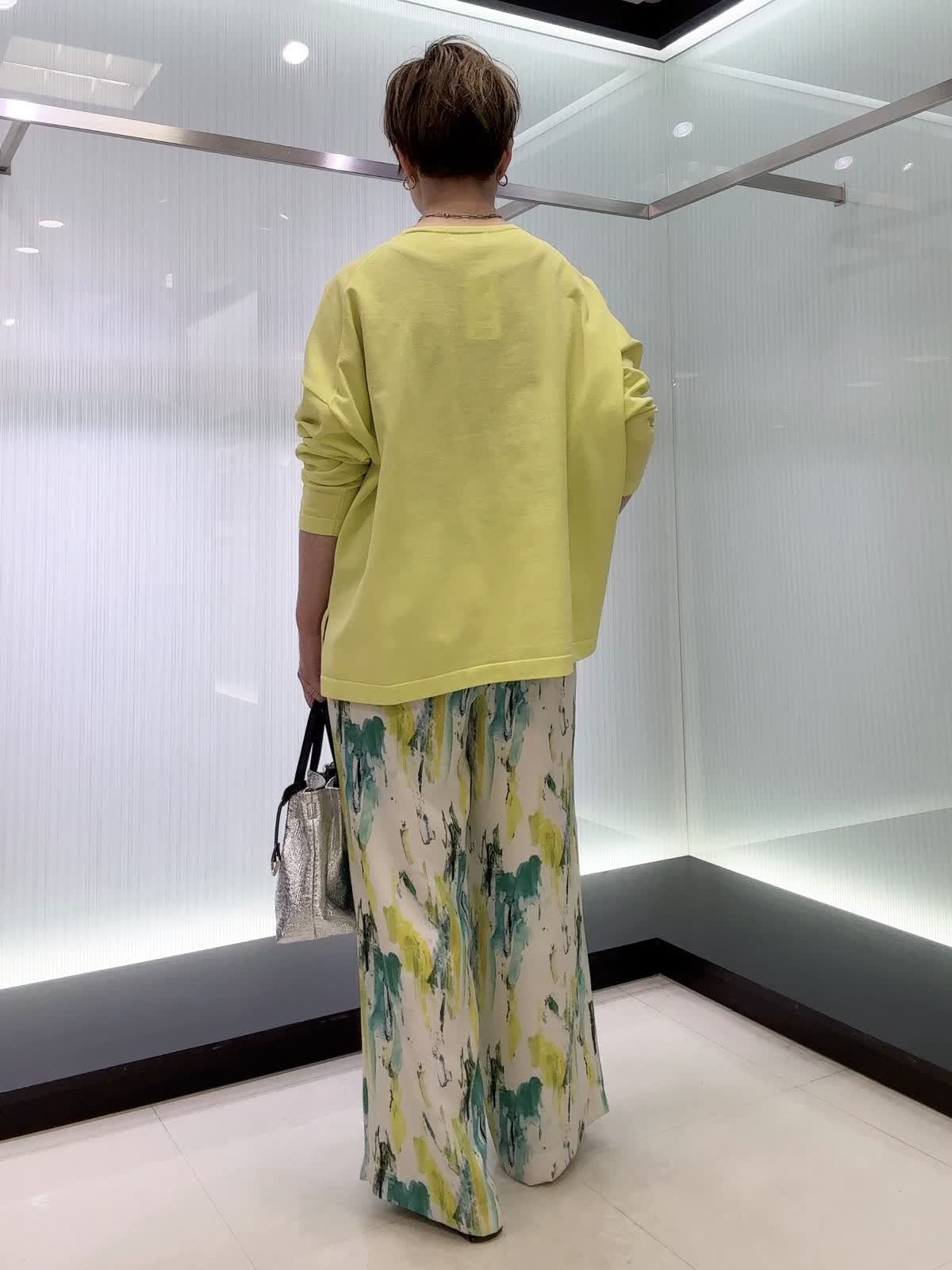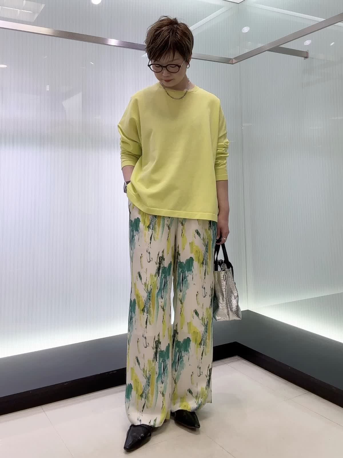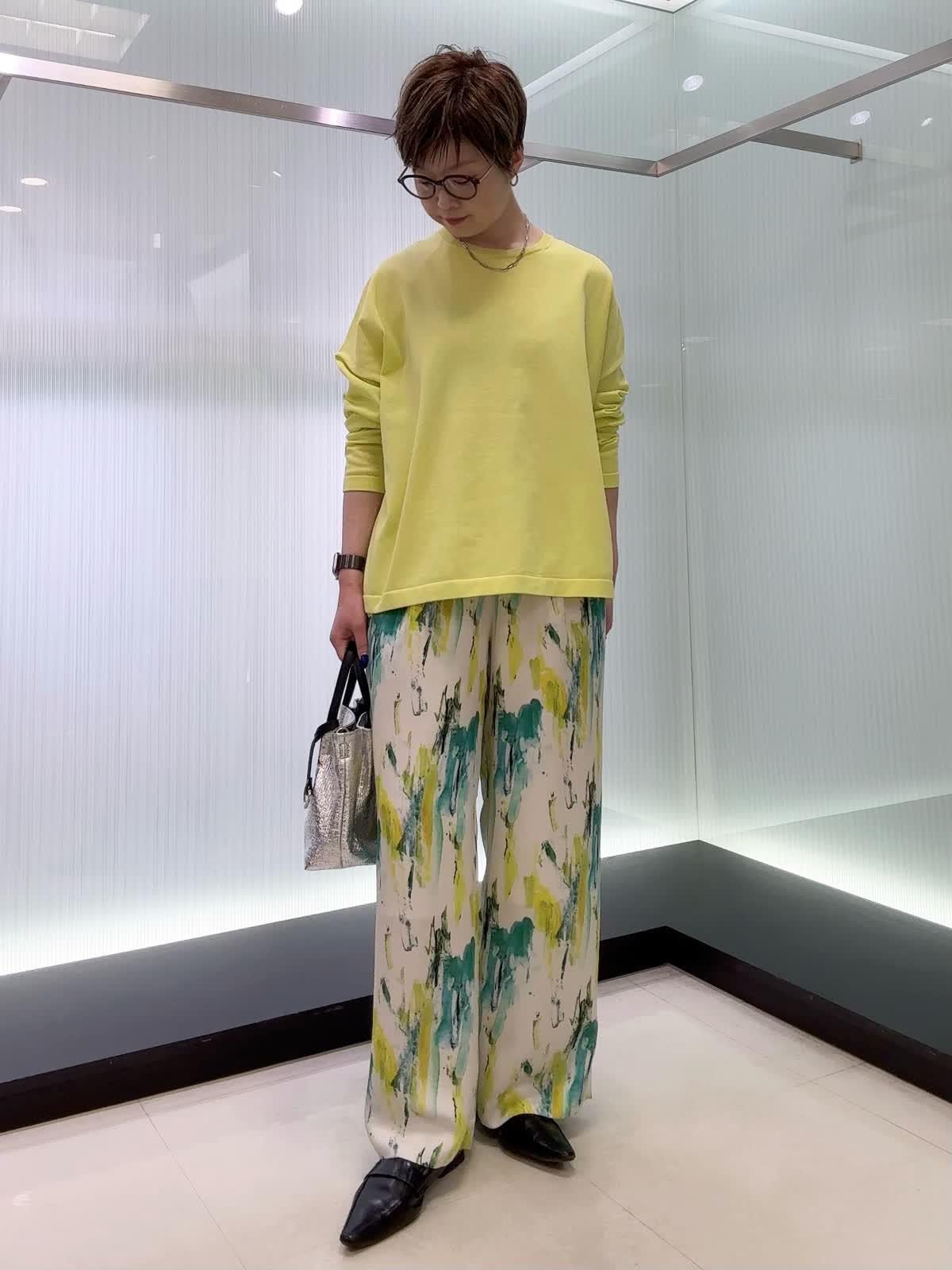 【着用カラー・サイズ】ニット : ビビッドイエロー/9号 パンツ : ペパーミント/9号 1枚でこなれるニットと、手描き風プリントが映える軽やかパンツ。ラフなのにきちんとおしゃれ見えする、抜け感たっぷりのコーデです。