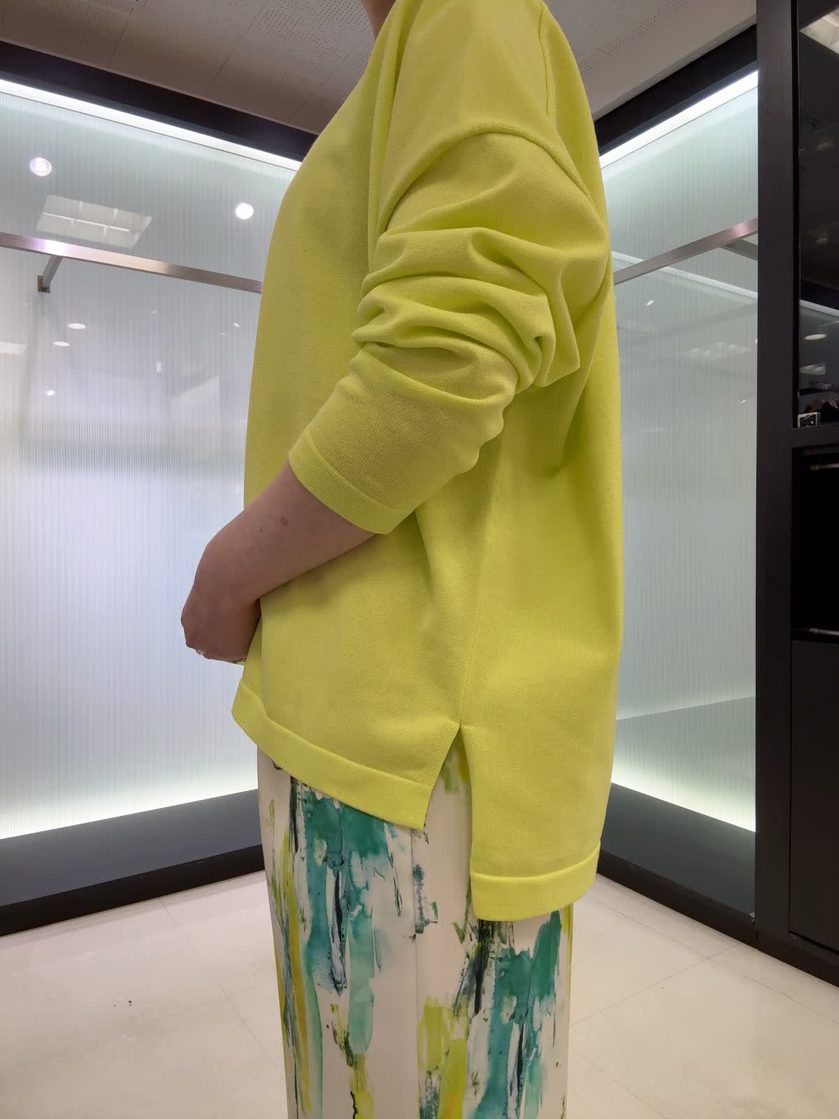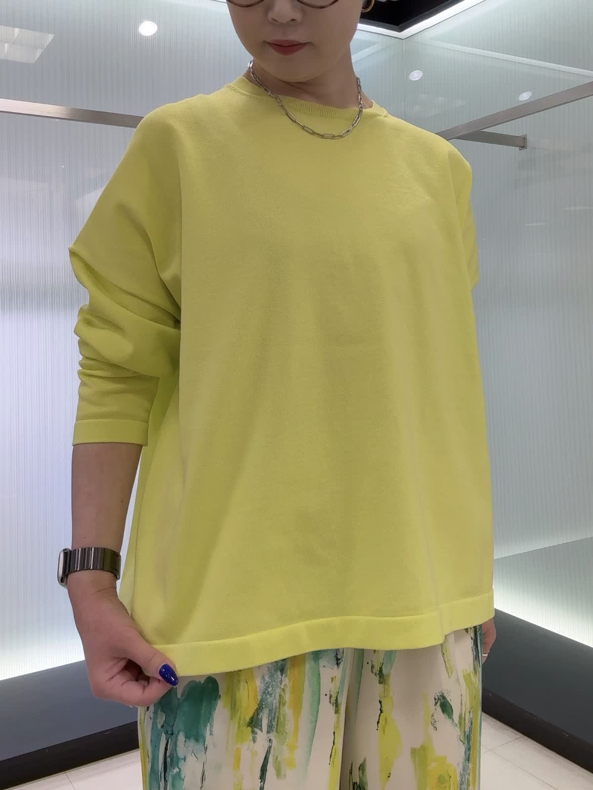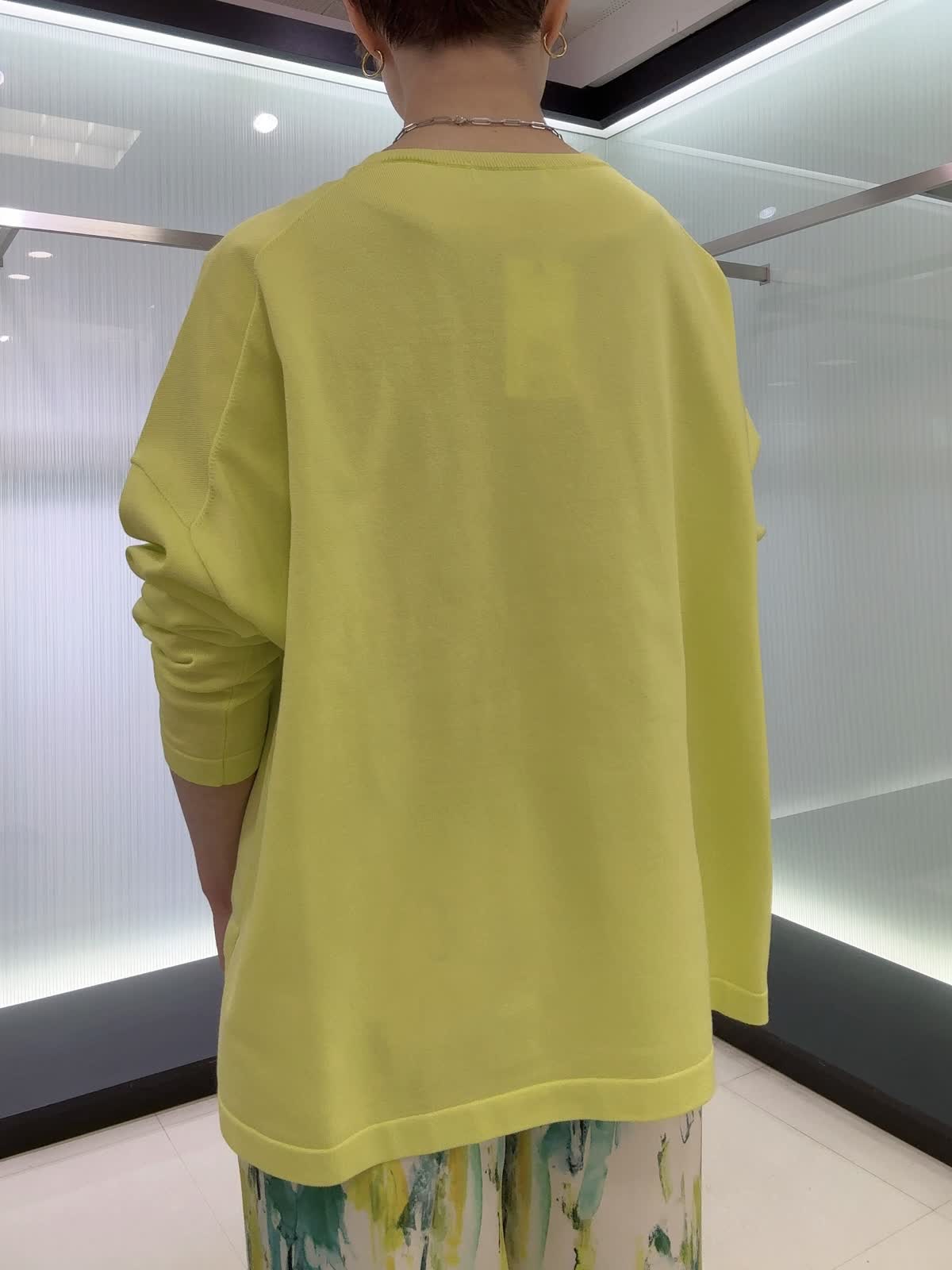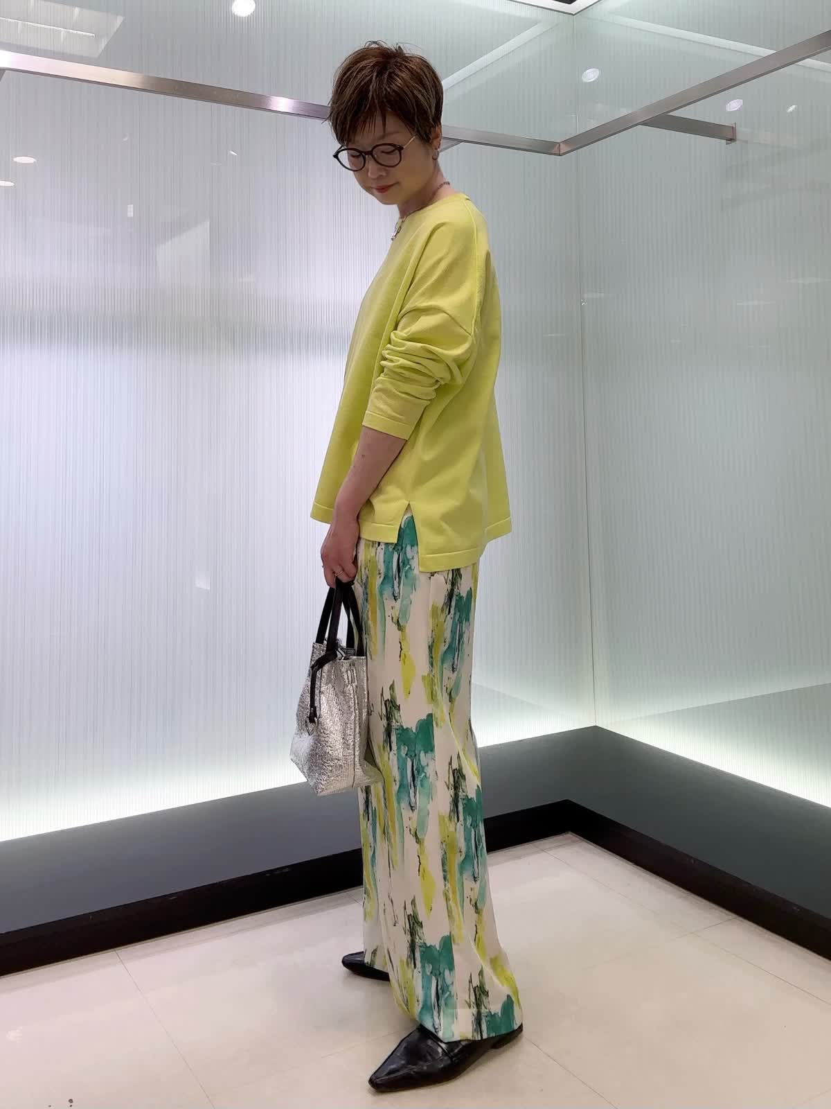 【着用カラー・サイズ】ニット : ビビッドイエロー/9号 パンツ : ペパーミント/9号 1枚でこなれるニットと、手描き風プリントが映える軽やかパンツ。ラフなのにきちんとおしゃれ見えする、抜け感たっぷりのコーデです。