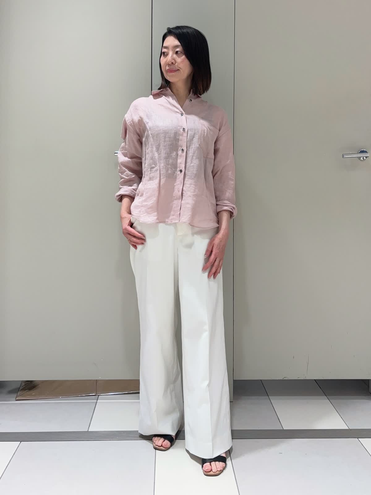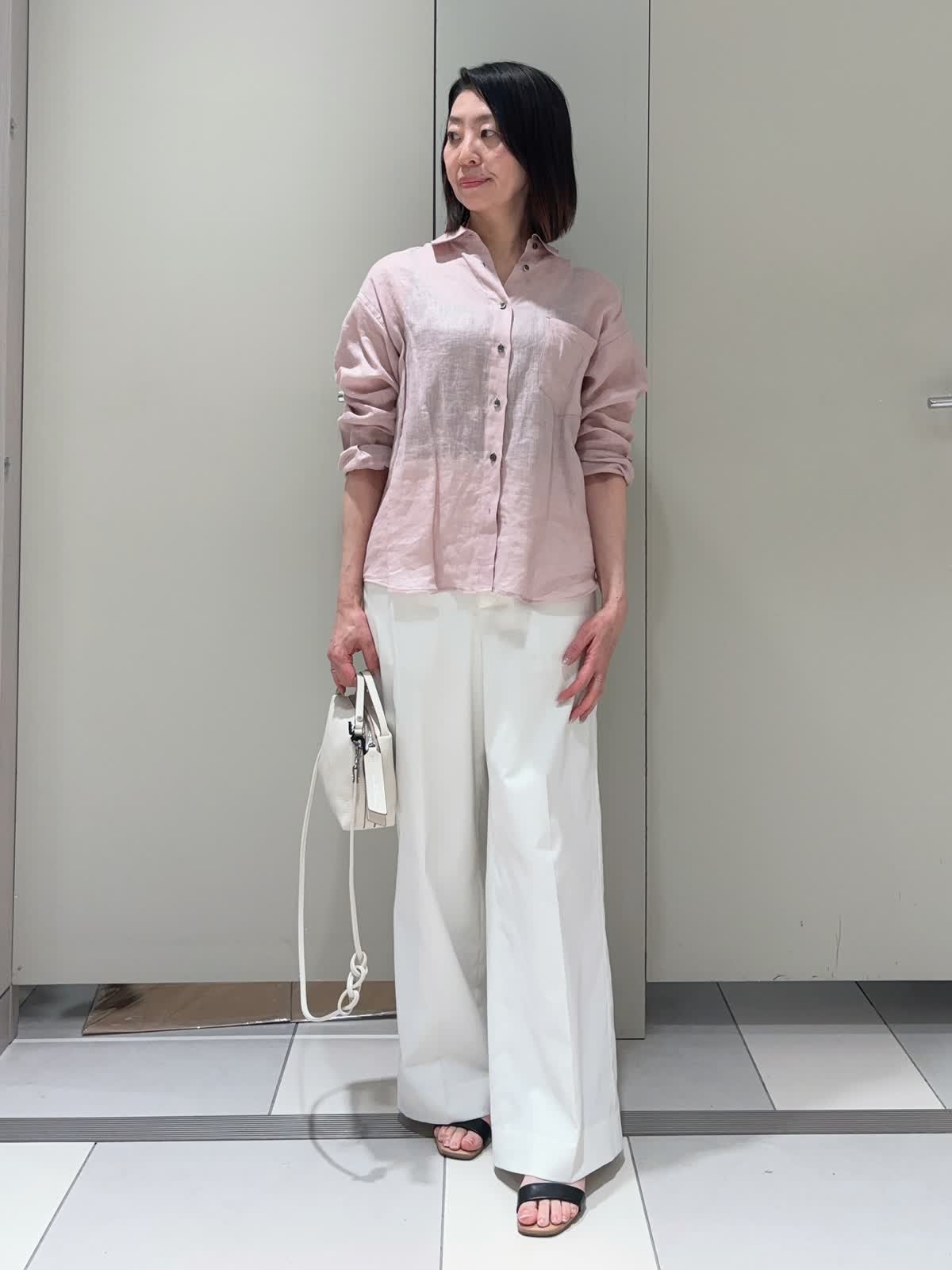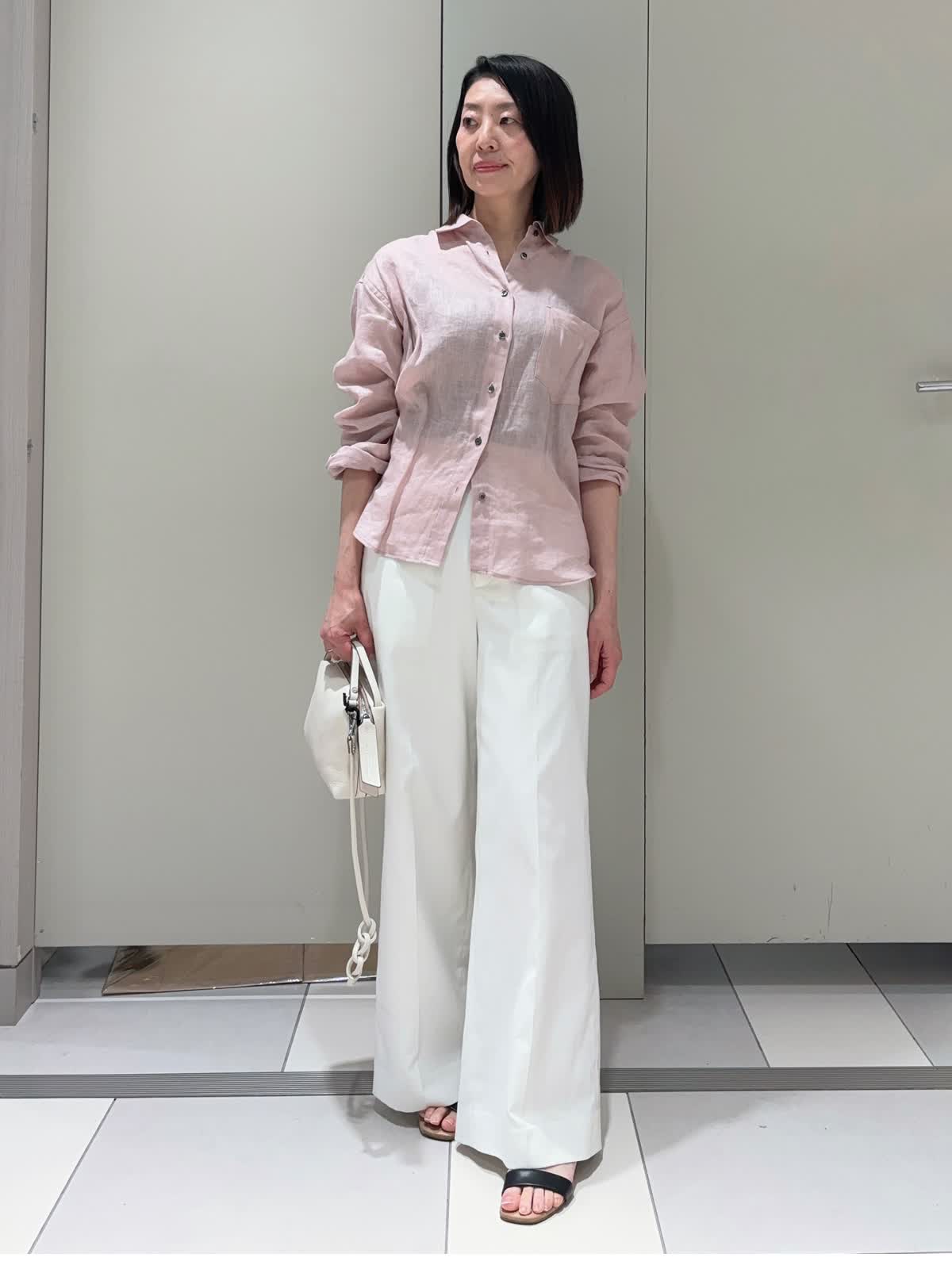 【着用サイズ】シャツ:9号 パンツ:7号 【着用カラー】シャツ:ピンク パンツ:オフホワイト バッグ:オフホワイト 程よい抜け感と着心地の良いシンプルなベーシックシャツ。1枚着としてもちょっとした羽織りとしても使いやすいアイテムです。 麻混のワイドパンツは軽くてシワになりにくいのも嬉しいポイント。シンプルに合わせるだけでいい感じにまとまります。