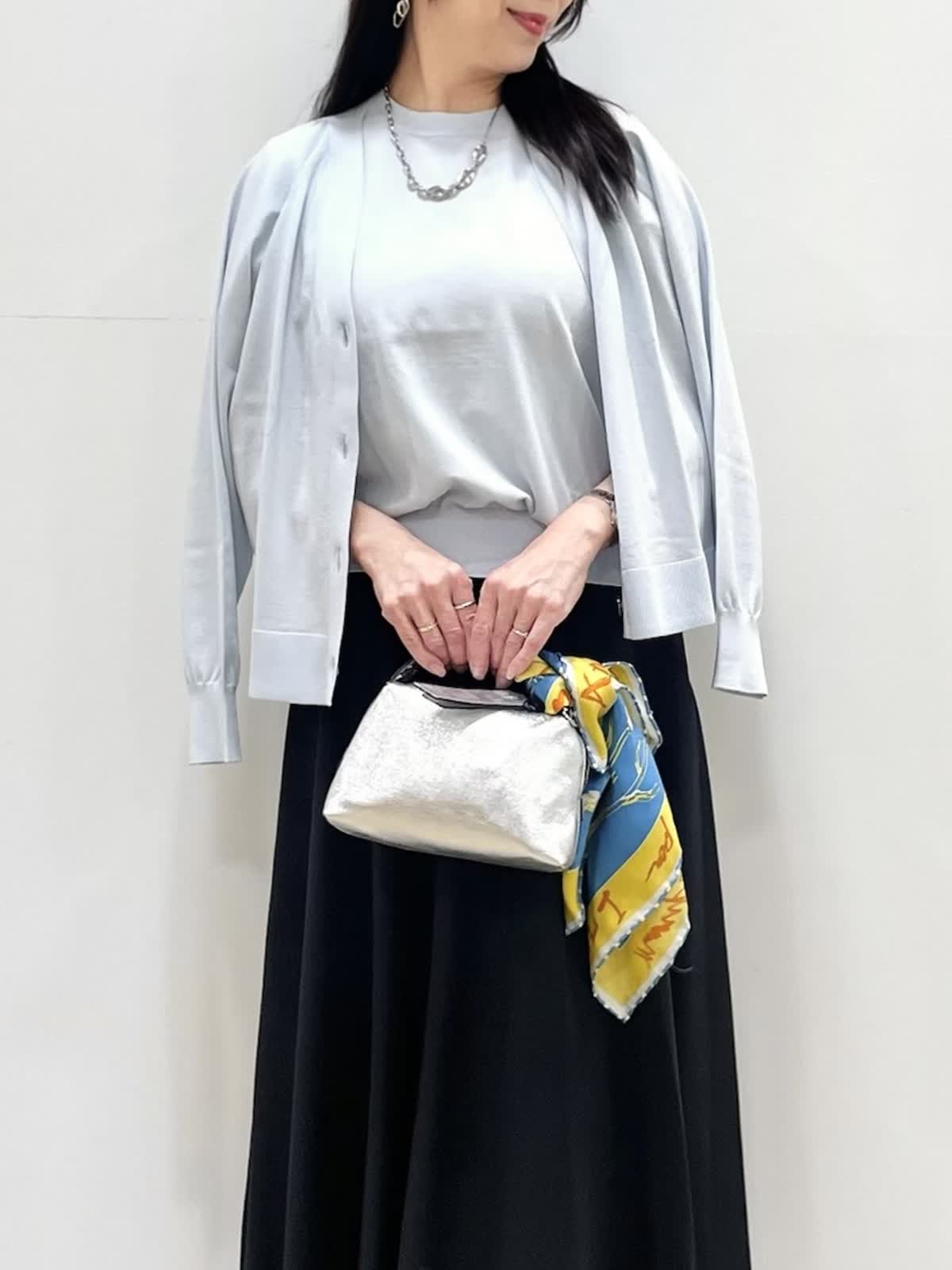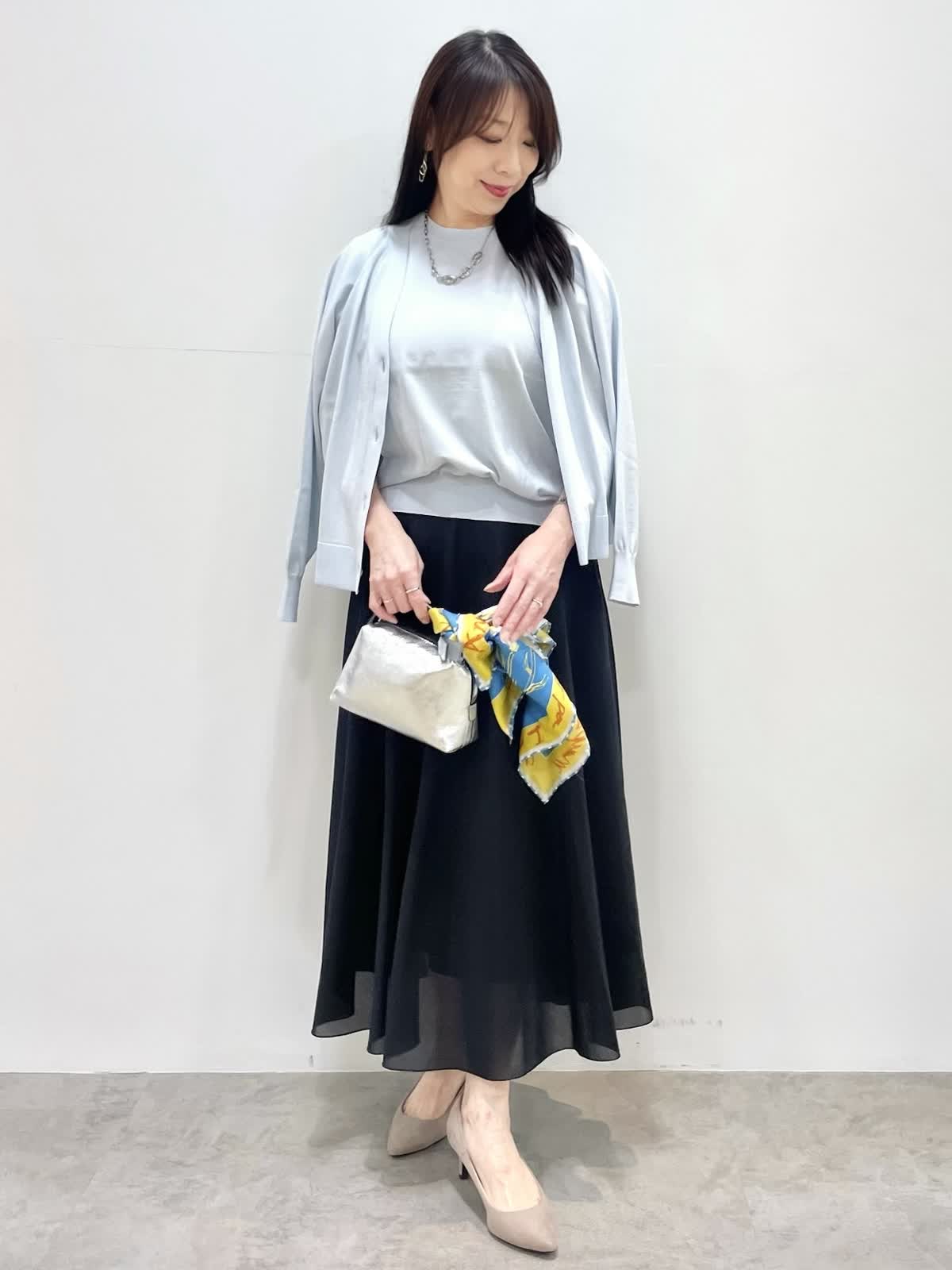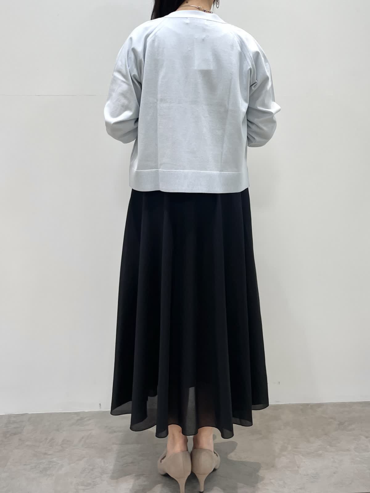 【着用サイズ】全て9号 【着用カラー】ニット,カーディガン:サックス スカート:ブラック キレイ目お出かけスタイル。薄手の清涼感のあるニットアンサンブル。ドライタッチで肌離れがよく快適な着心地です。カーディガンは1日で気温差がある季節に便利。フレンチスリーブニットは程よいボリューム感で身体のラインを拾いません。スカートは裏地が短く裾に透け感があるのでブラックも重くならず着用いただけます。