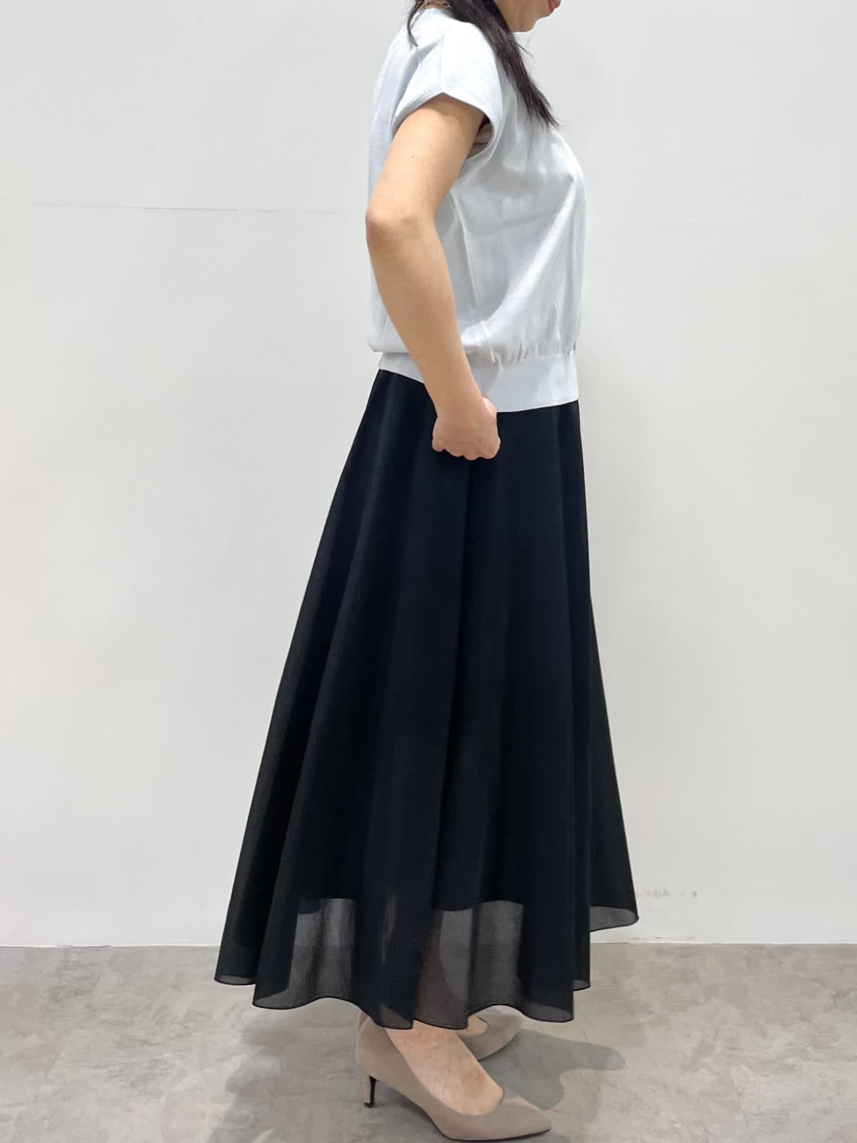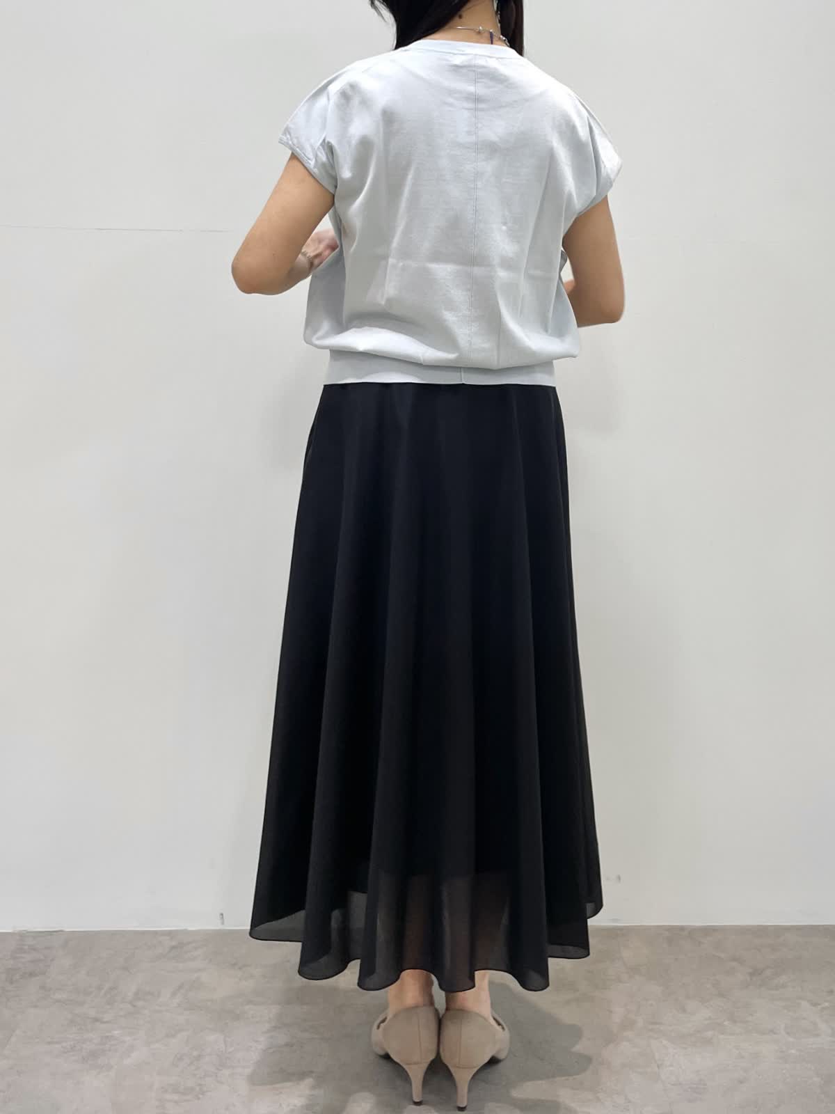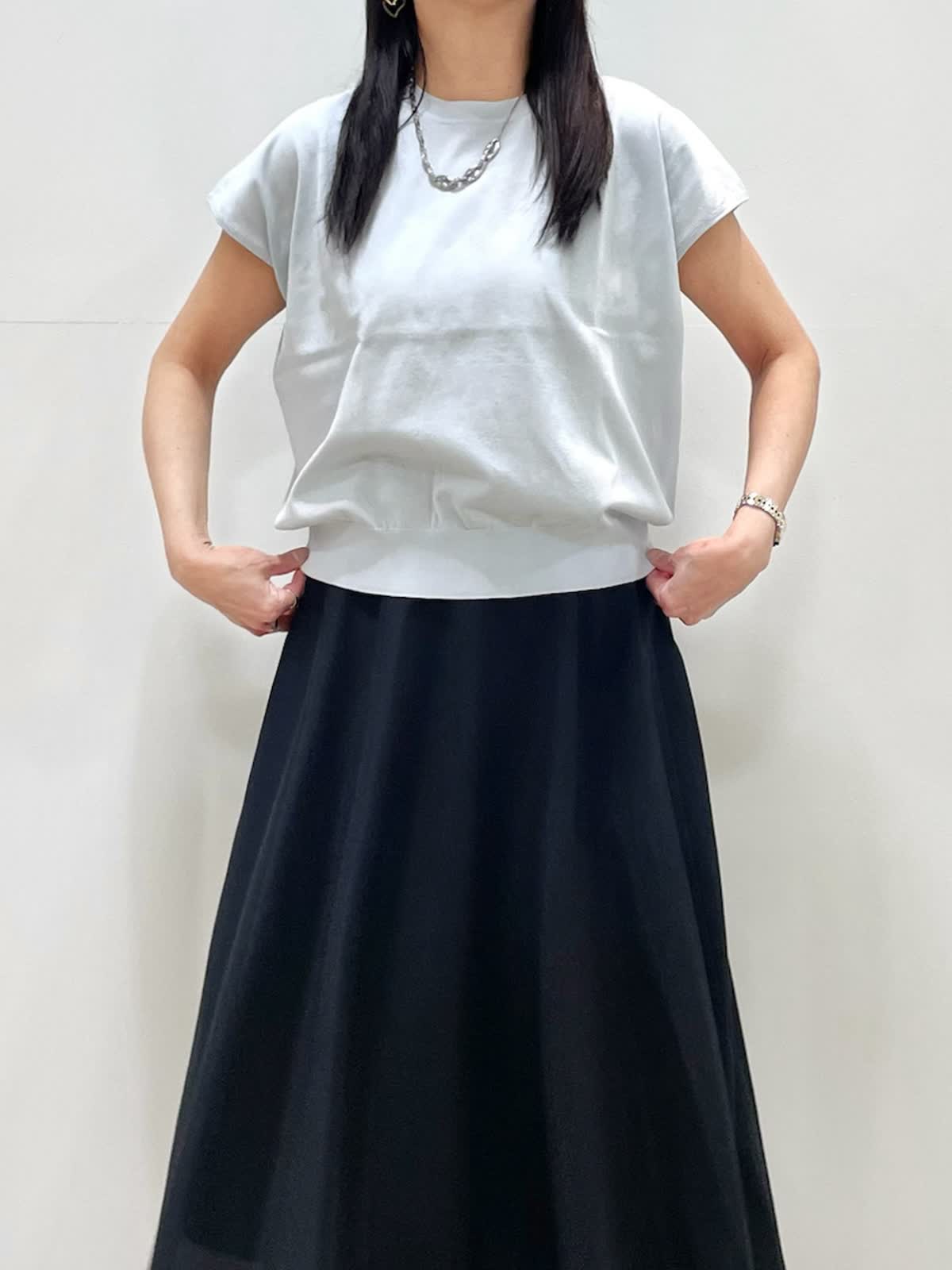 【着用サイズ】全て9号 【着用カラー】ニット,カーディガン:サックス スカート:ブラック キレイ目お出かけスタイル。薄手の清涼感のあるニットアンサンブル。ドライタッチで肌離れがよく快適な着心地です。カーディガンは1日で気温差がある季節に便利。フレンチスリーブニットは程よいボリューム感で身体のラインを拾いません。スカートは裏地が短く裾に透け感があるのでブラックも重くならず着用いただけます。