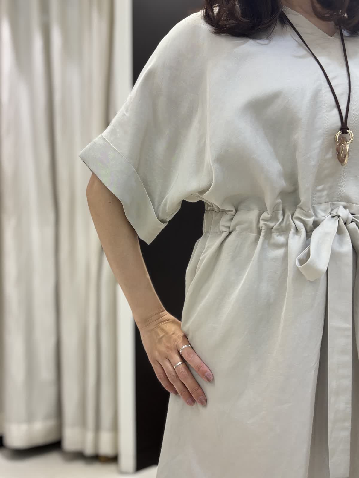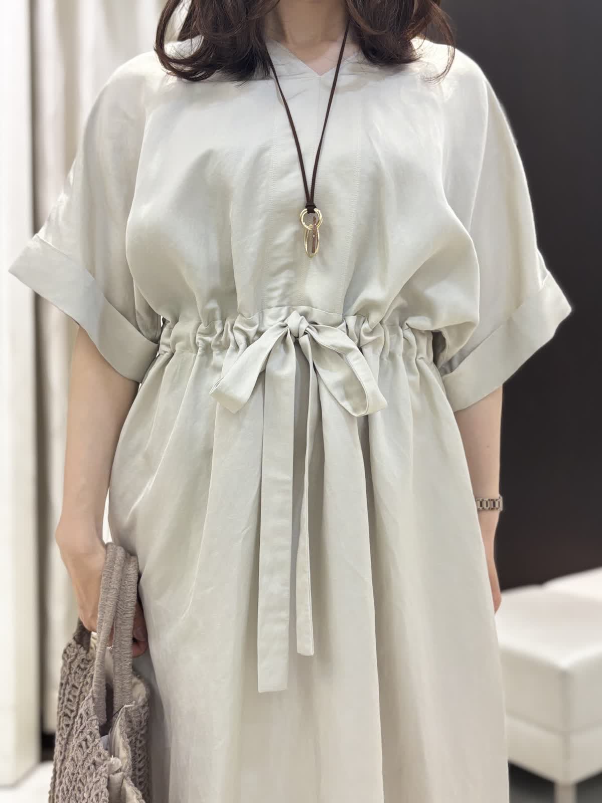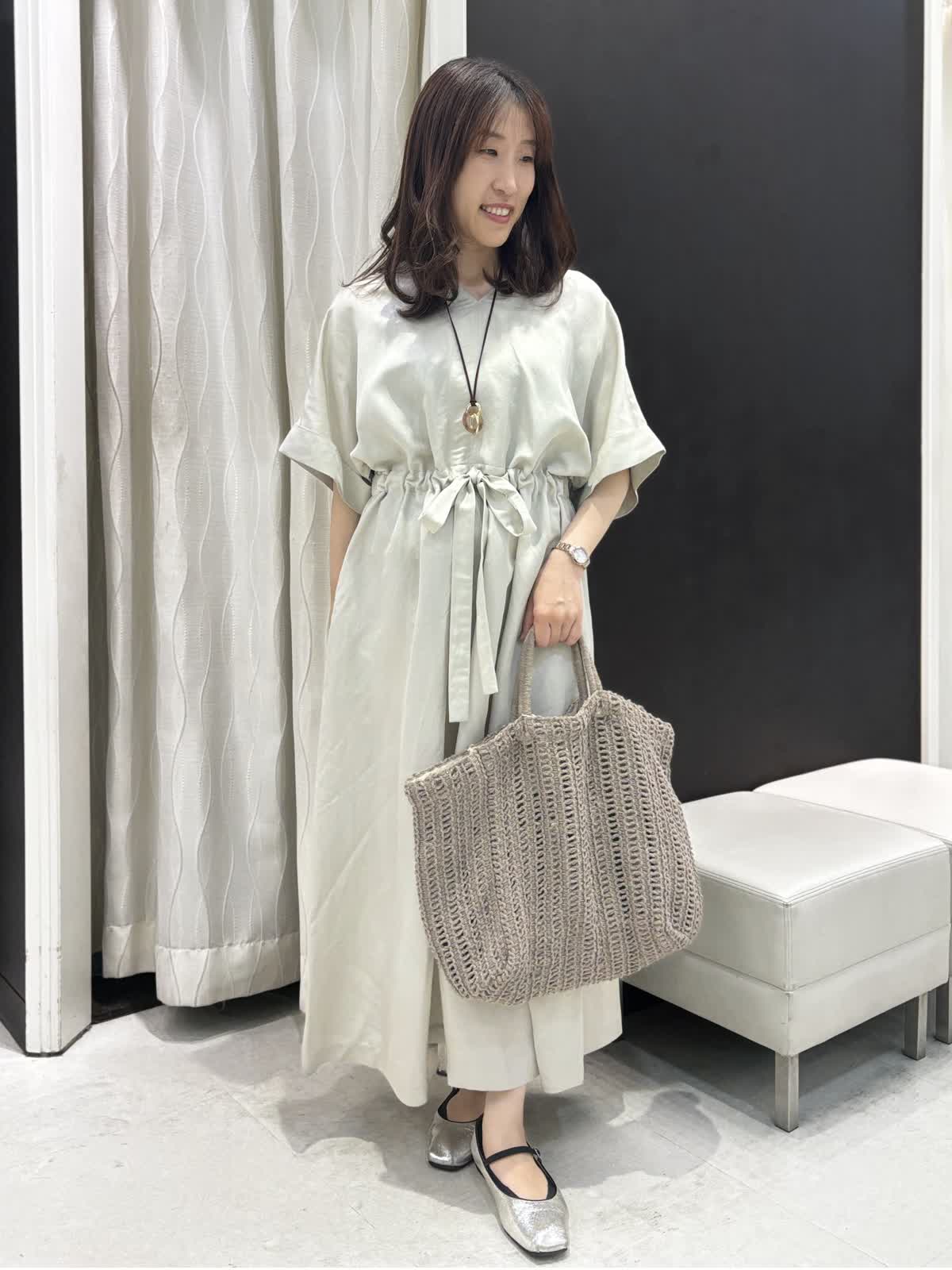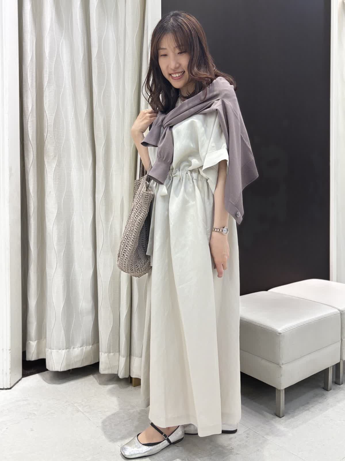 マキシ丈でゆったり、オーバーサイズなワンピースです。リネン混なので清涼感のあるハリ感が特徴的、キュプラが入ることによってキレイな光沢感が生まれます。アームはしっかり袖があるので二の腕カバー。肩にカーデを添えて大人っぽい着こなしがオススメです。