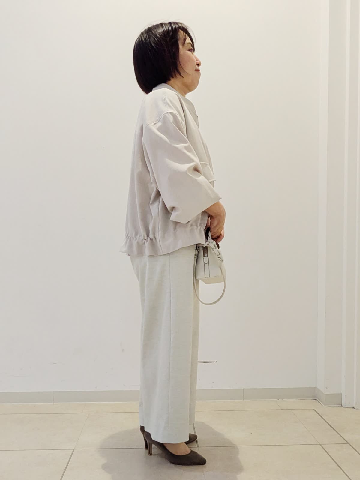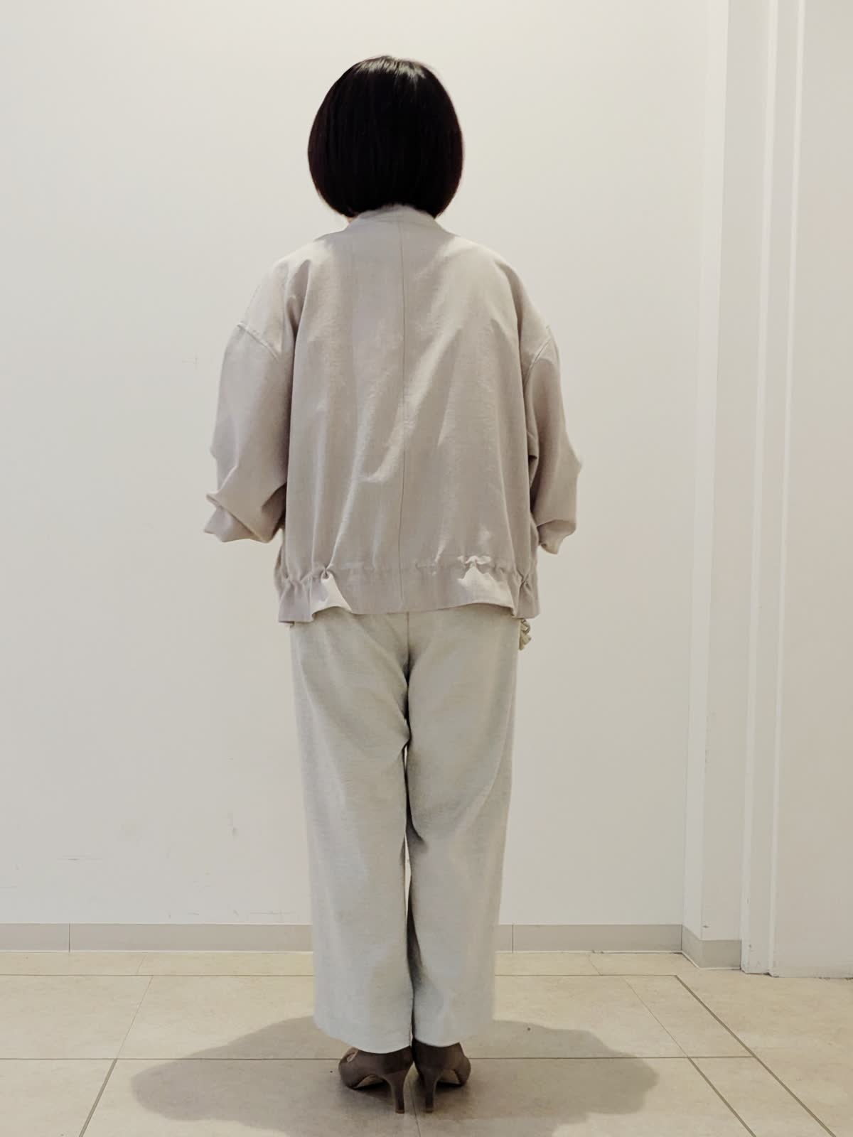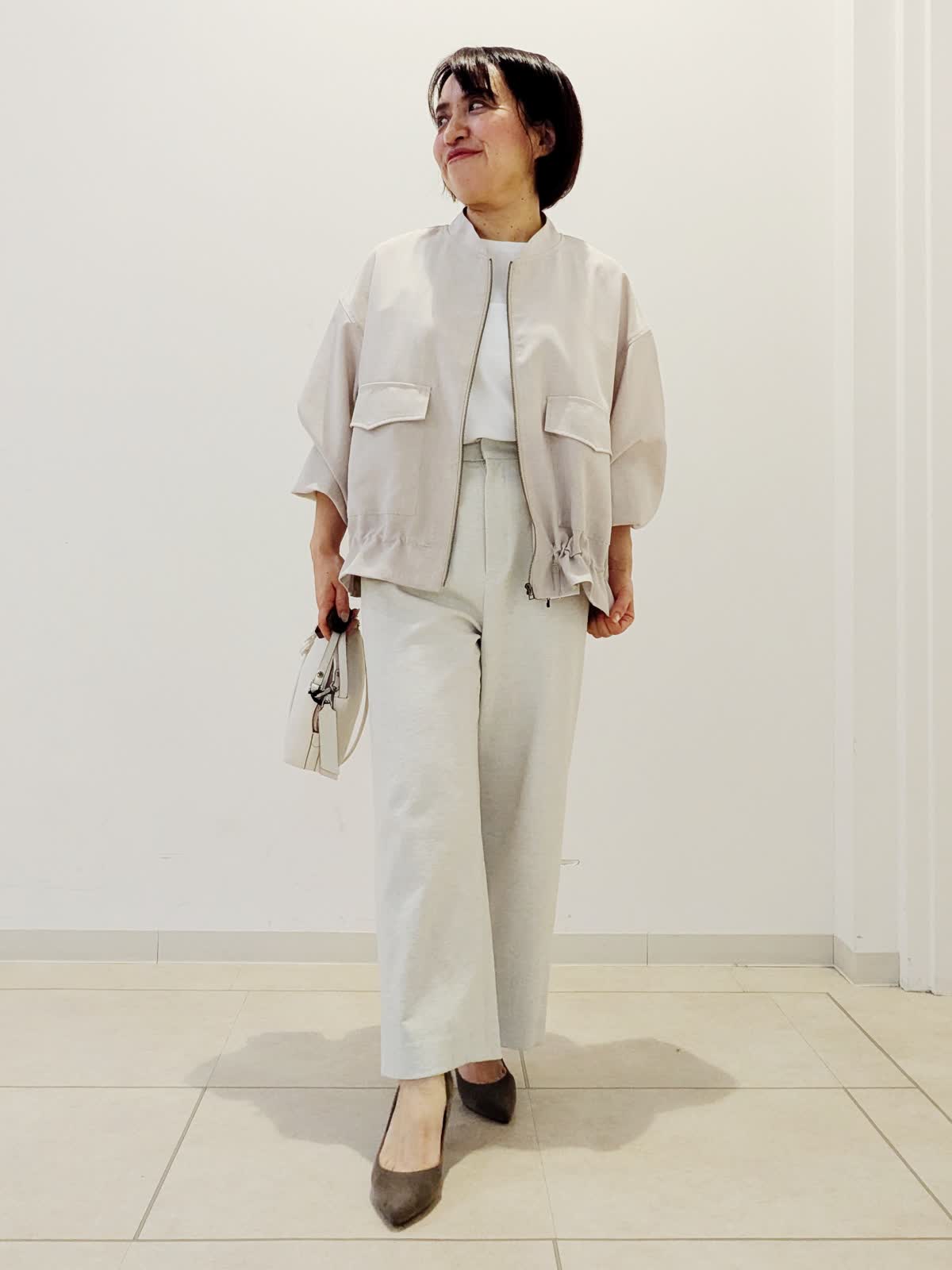 【着用サイズ】ブルゾン:フリー カットソー:フリー パンツ:9号【着用カラー】ブルゾン:ベージュ カットソー:ホワイト パンツ:ベージュ GWのお出かけコーデです。 ブルゾンはサラッとした肌触りで軽い着心地。薄手で袖口のゴム仕様により袖丈調節可能なので長い時期お使いいただけます。朝晩と日中の気温差がある時期、羽織りは必需品ですよね。ご自宅で洗濯できるのでお手入れも簡単です。