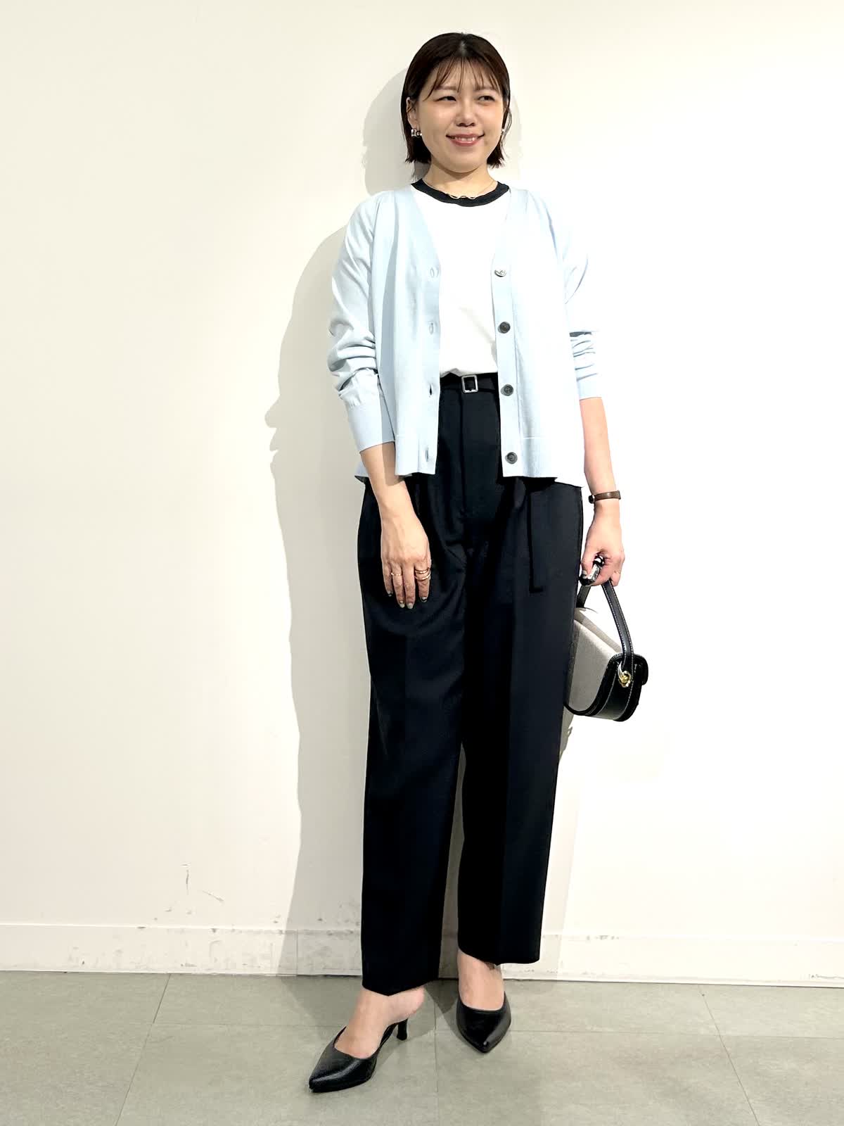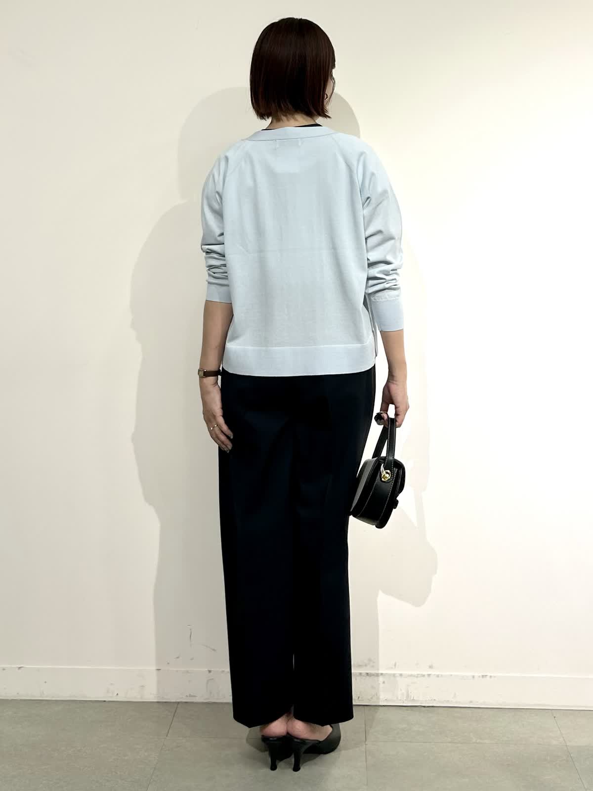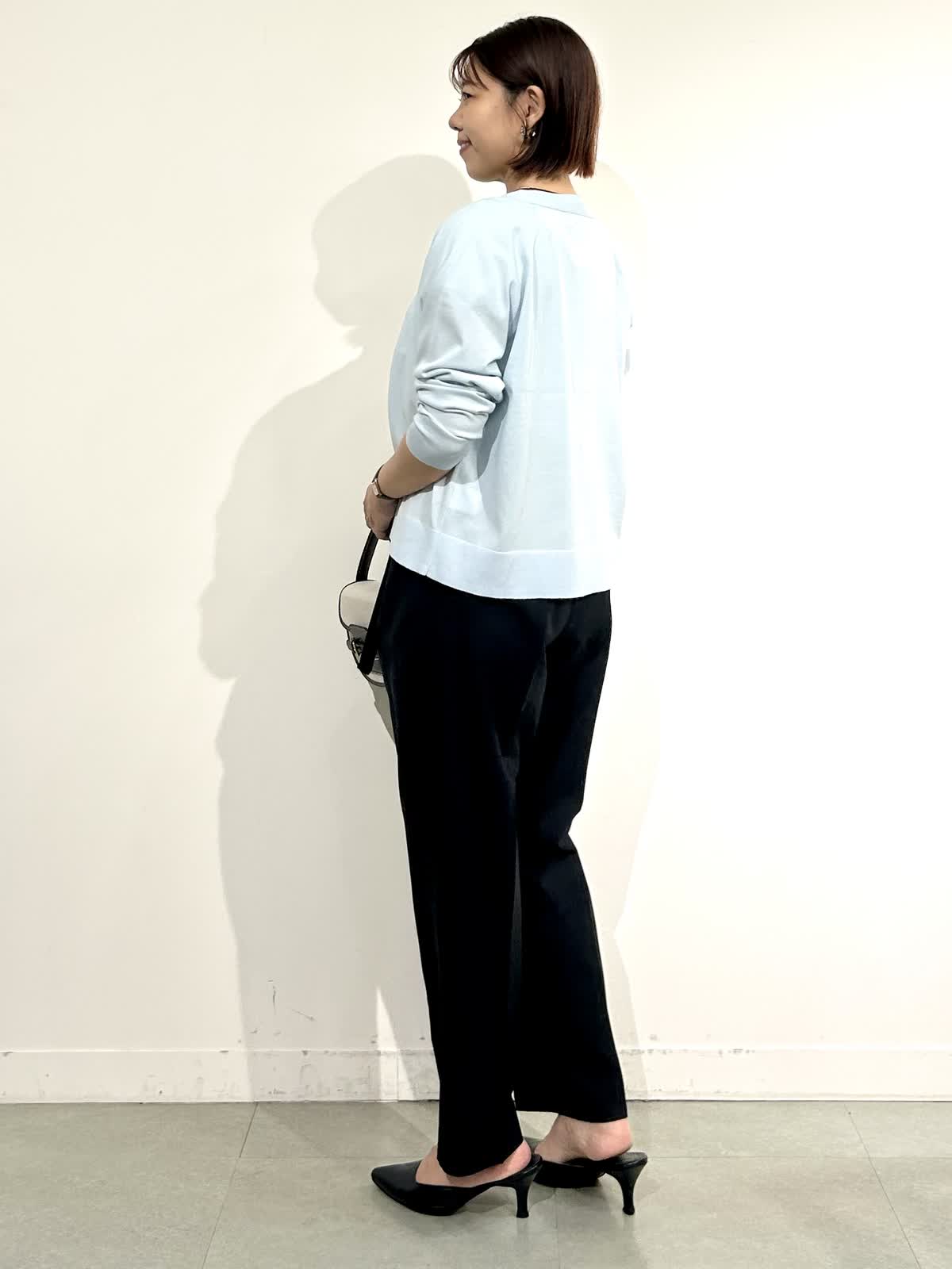 【着用サイズ】全て9号 【着用カラー】カーデ:サックス ニット:オフホワイト パンツ: ブラック ジャケット:ベージュ カーデとフレンチスリーブニットは同生地のさらさらな肌触り。気温差がある春から、暑くなる真夏までフル活用できる快適なニットです。 パンツも軽くてシワにならず、肌にまとわりつかない着心地の良さ。 ジャケットを羽織ってきちんとコーデにもぴったりです。