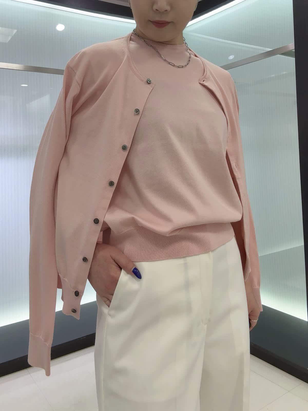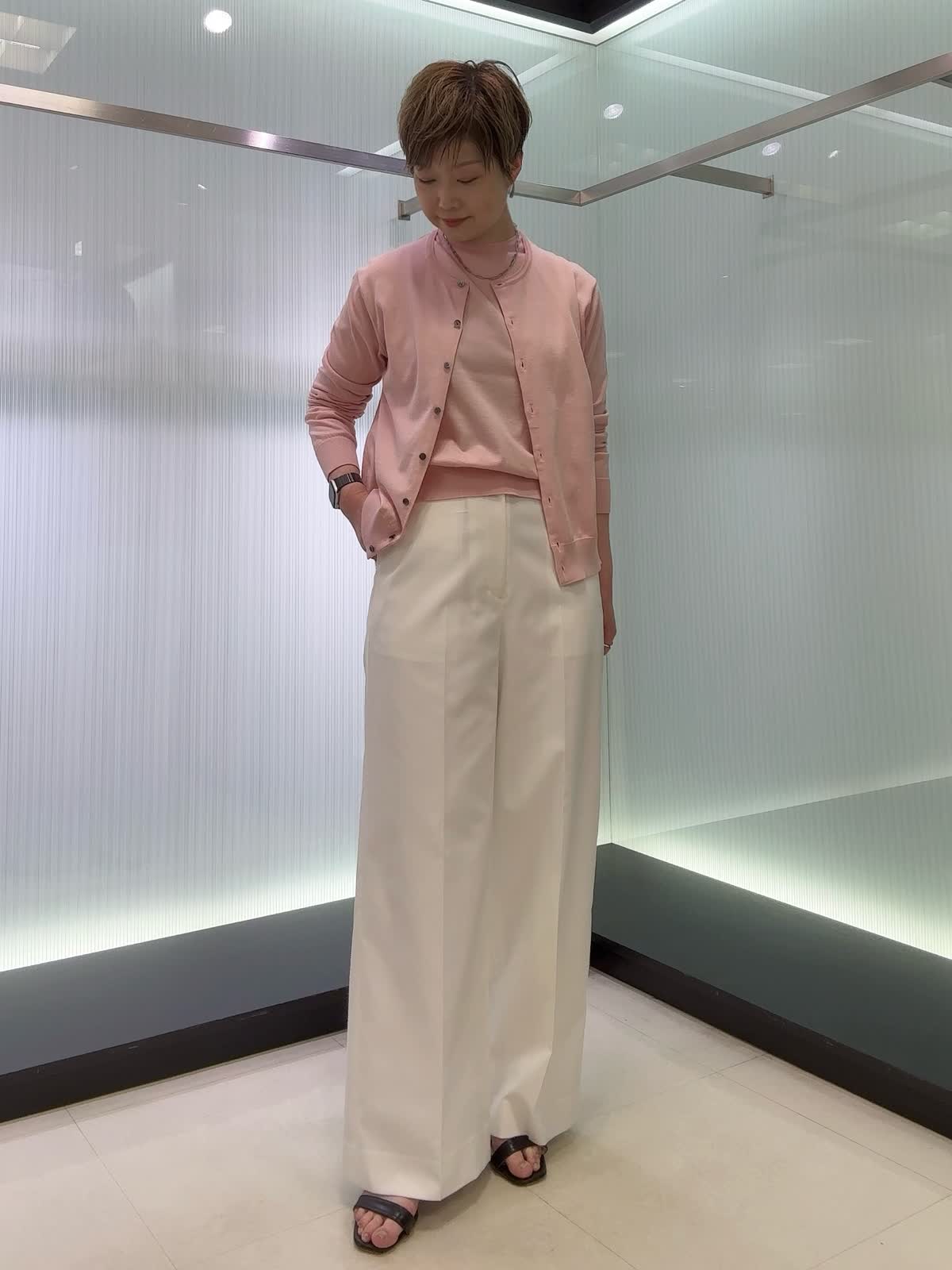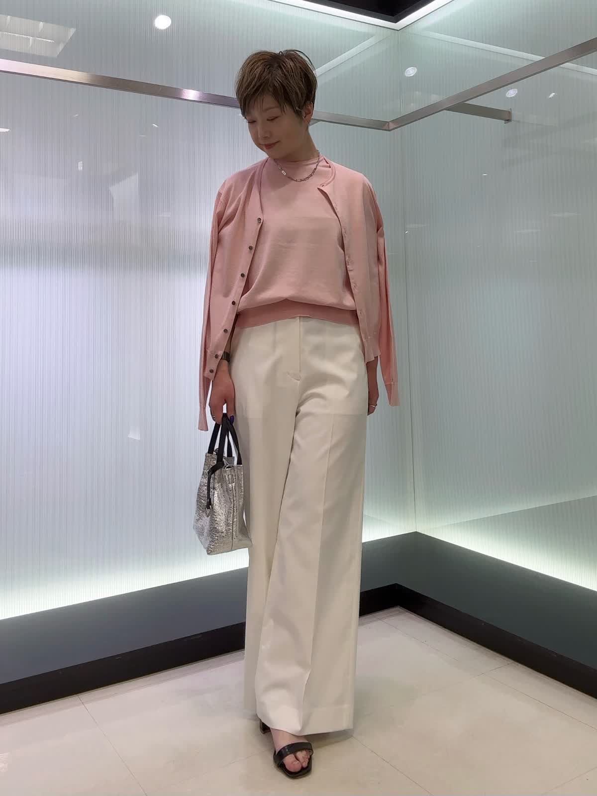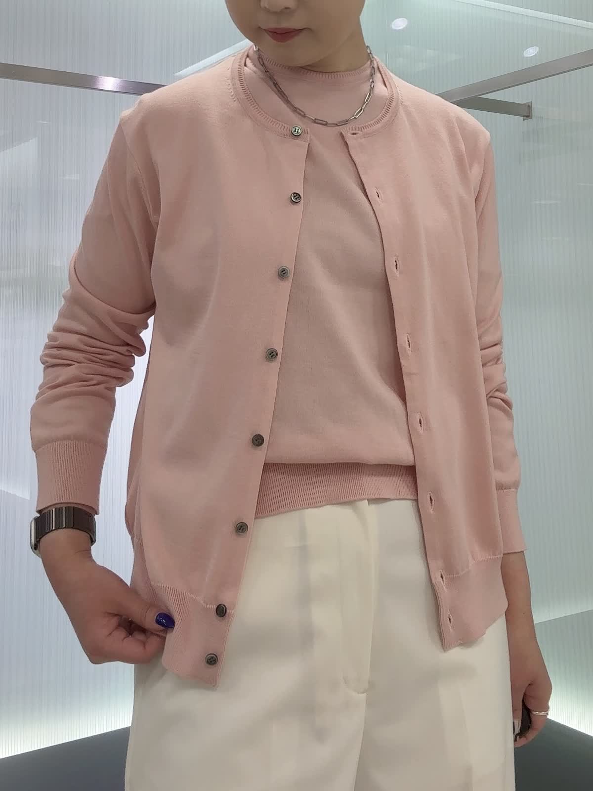 【着用カラー・サイズ】カーディガン・ニット : ピンク/9号 パンツ : オフホワイト/9号 着心地の良さと着回しやすさを兼ね備えた万能アイテム。カーディガンとプルオーバーは、やわらかな肌触りとベーシックなデザインが魅力で、さまざまなボトムスと好相性。合わせたパンツは、きれいなシルエットのセミワイド仕様で、オンオフ問わず活躍します。デイリーにもお仕事にも取り入れやすい頼れる一着です。