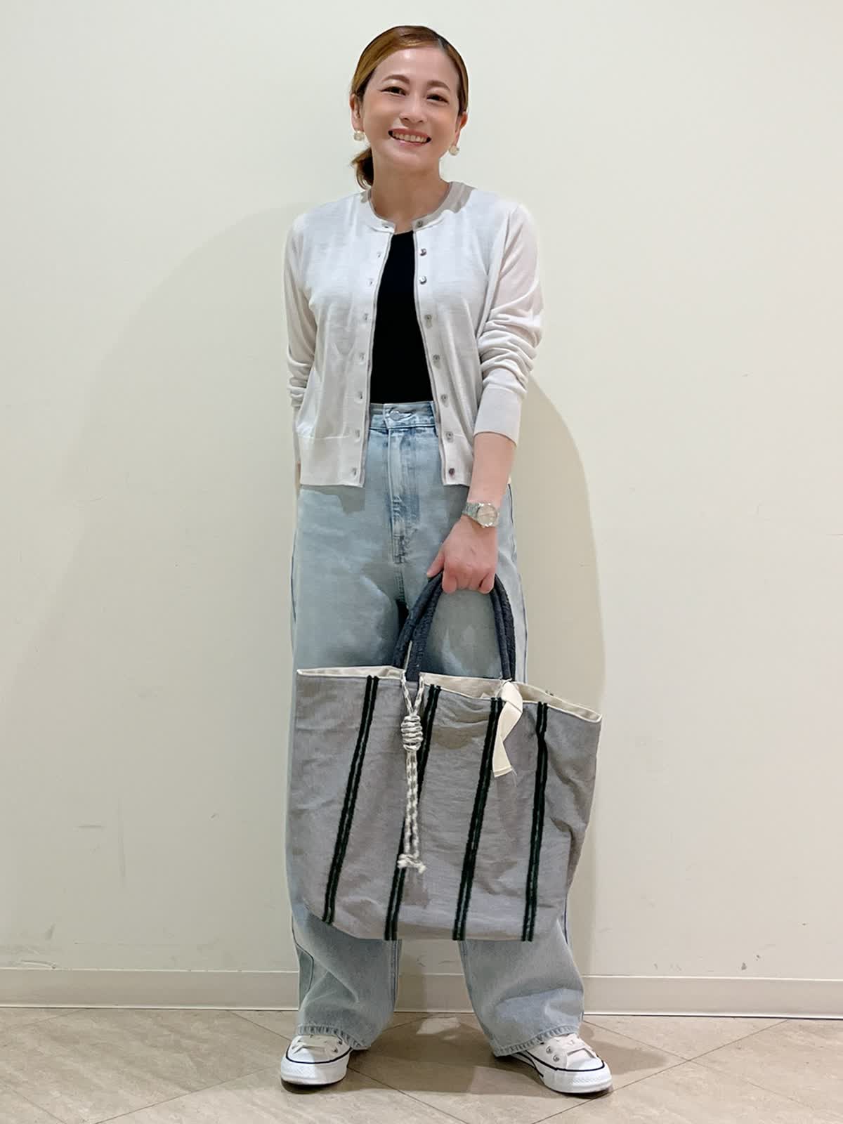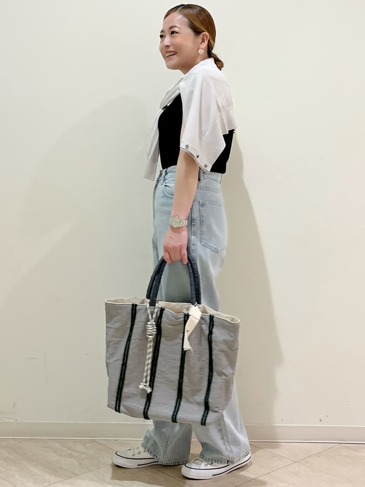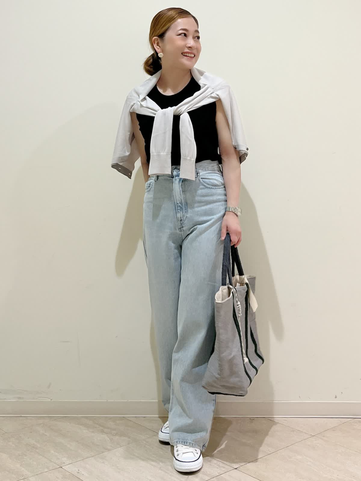 ゴールデンウィークのお出かけスタイリングです。シアー感のある軽やかな1枚は、肩がけするだけで一気にこなれ感アップ。同じアイテムでも着方次第でここまで印象が変わります。インナーはスビン綿のタンクトップ。とろけるような肌触りで、シンプルだけど着心地は格別です。デニムは脚長効果のあるシルエット。この絶妙なカラーが、抜け感と大人っぽさをちょうどよくプラスしてくれます。