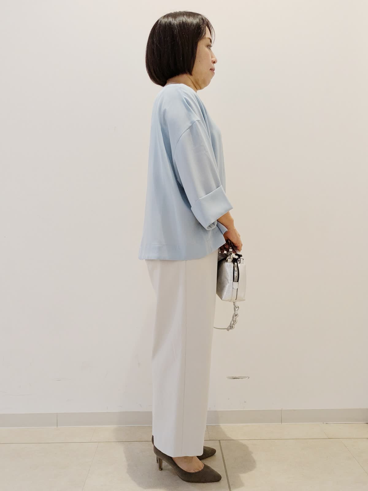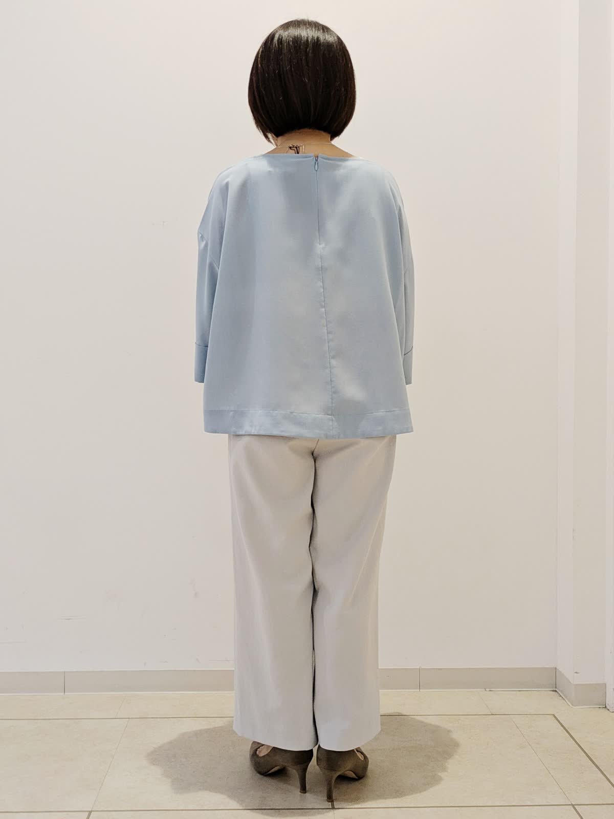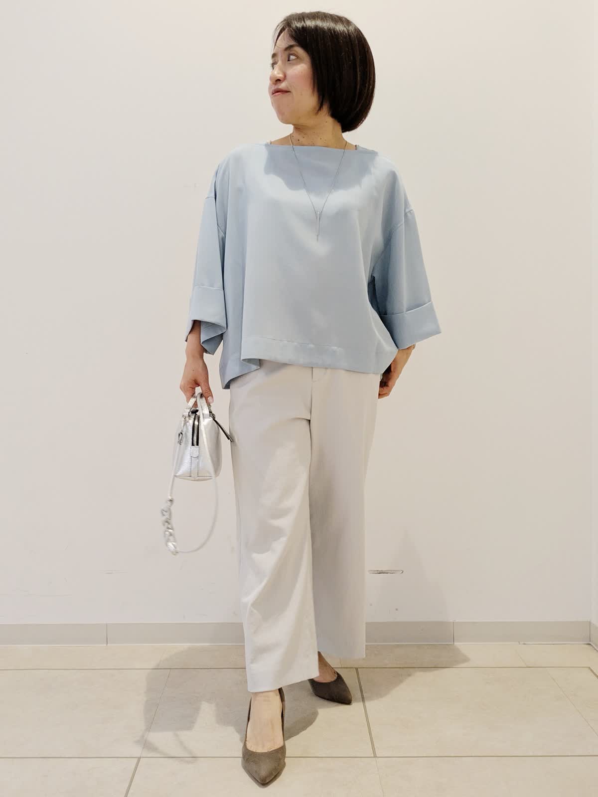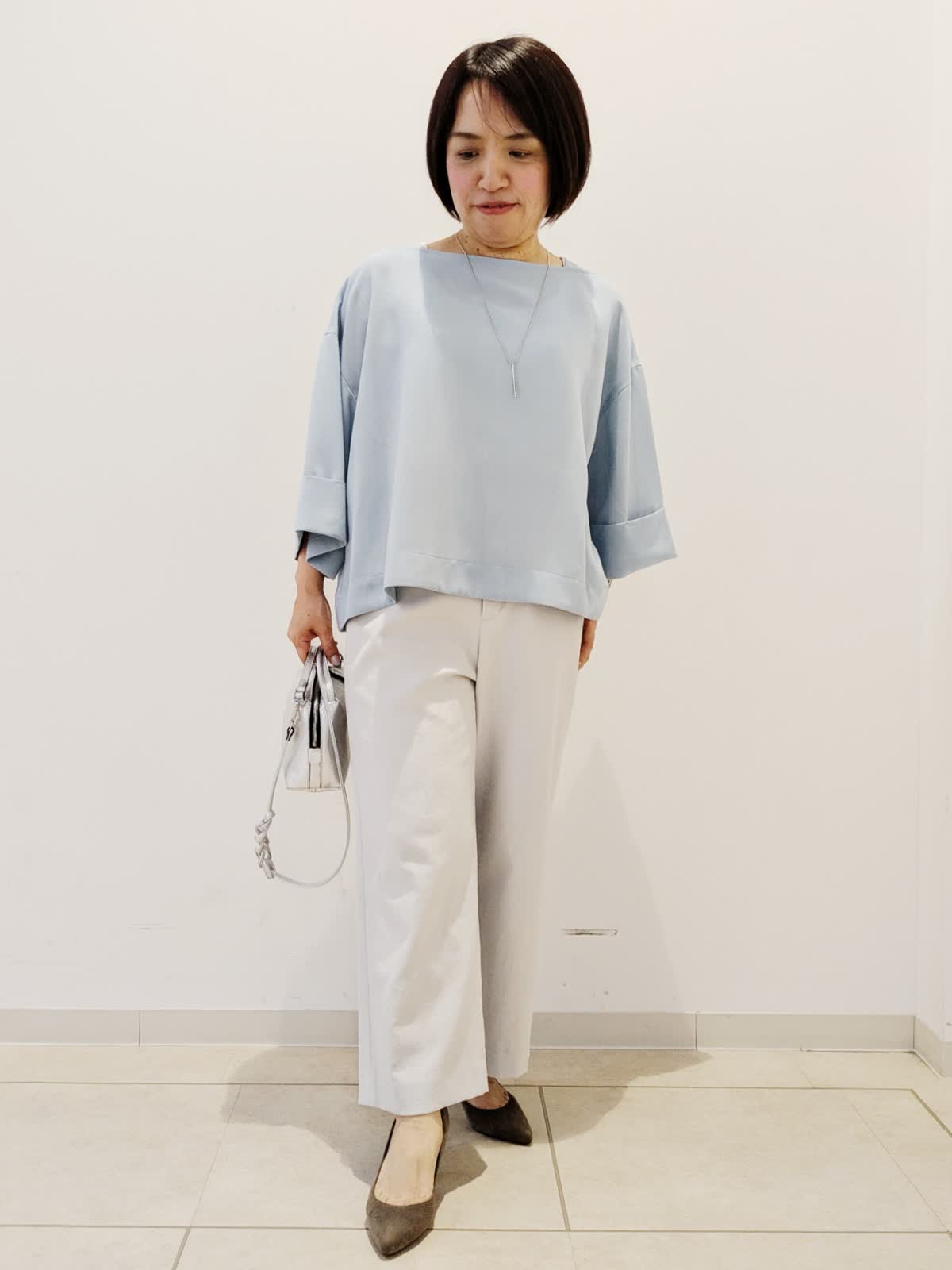【着用サイズ】ブラウス:フリー パンツ:9号【着用カラー】ブラウス:サックス パンツ:グレー 今から夏まで使える通勤コーデです。ブラウスはゆったりとしたサイズ感。サラッとした肌触りです。シワになりにくい素材で自宅洗濯可能、速乾性もあり、デイリー使いにはうれしい♪着丈も短めなので、バランスよく着ていただけます。