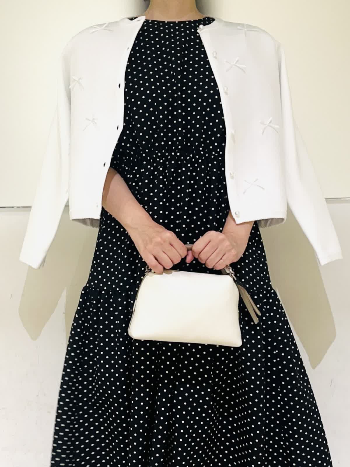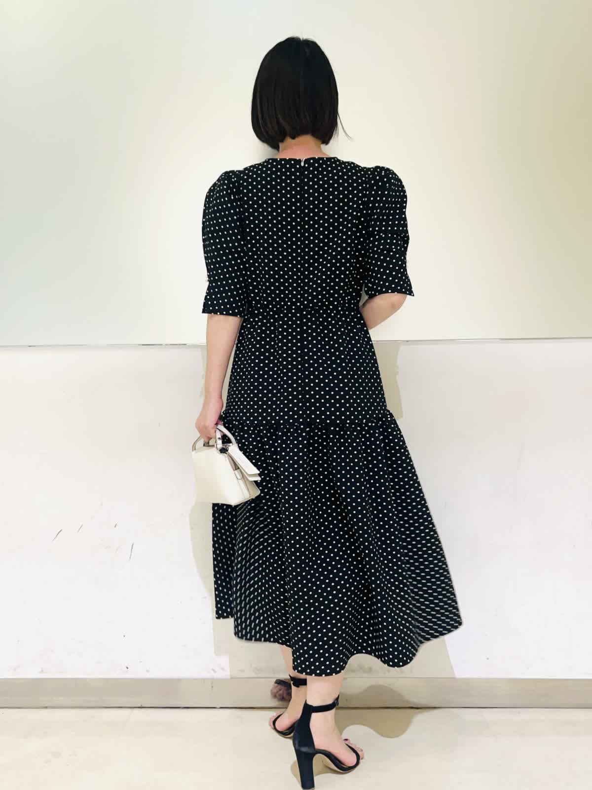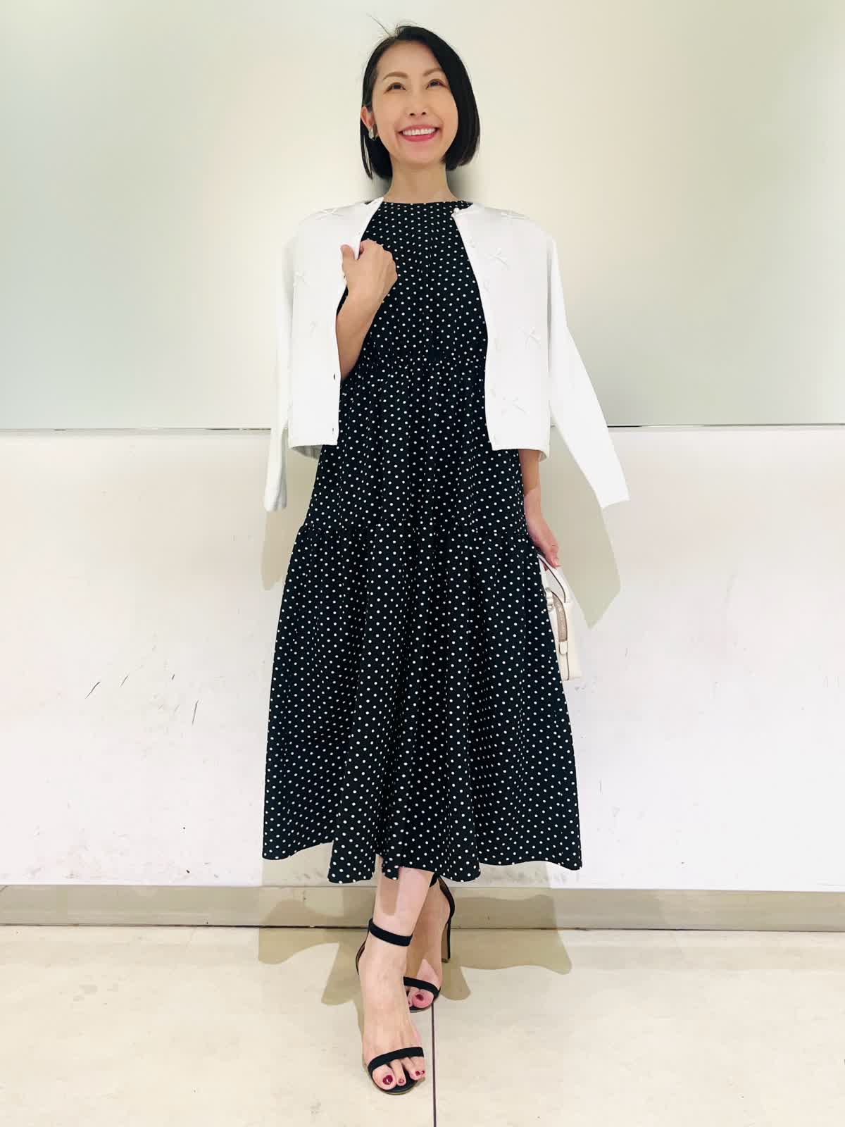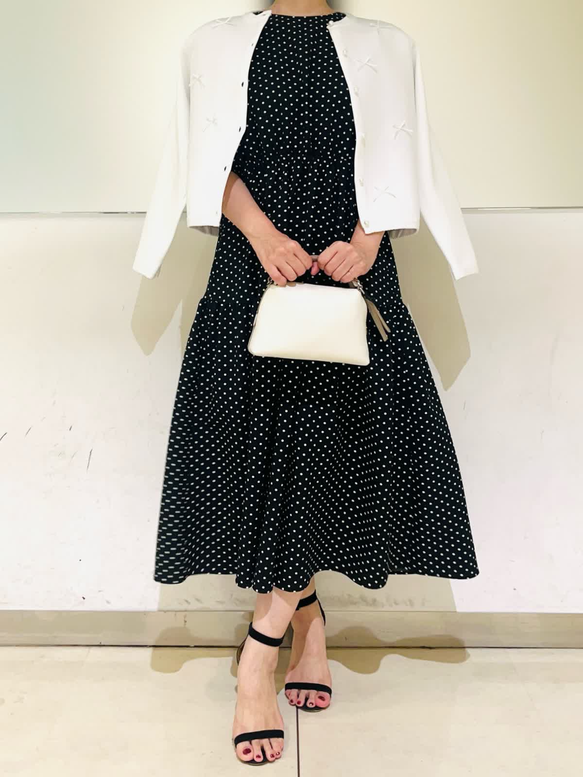 【着用アイテム】すべて9号 【着用カラー】カーディガン:オフホワイト ワンピース:ブラック 初夏のお出かけコーディネート。夏のお出かけに欠かせないワンピース。ドライタッチな素材感でさらっとした着心地です。ティアードのふんわりしたデザインが歩くたびに可愛く揺れます。1枚で着ても肩が華奢見えする袖デザインで、二の腕もカバーしてくれる安心なお袖丈。ホームケア出来るので、デイリーにもお召しいただけます。