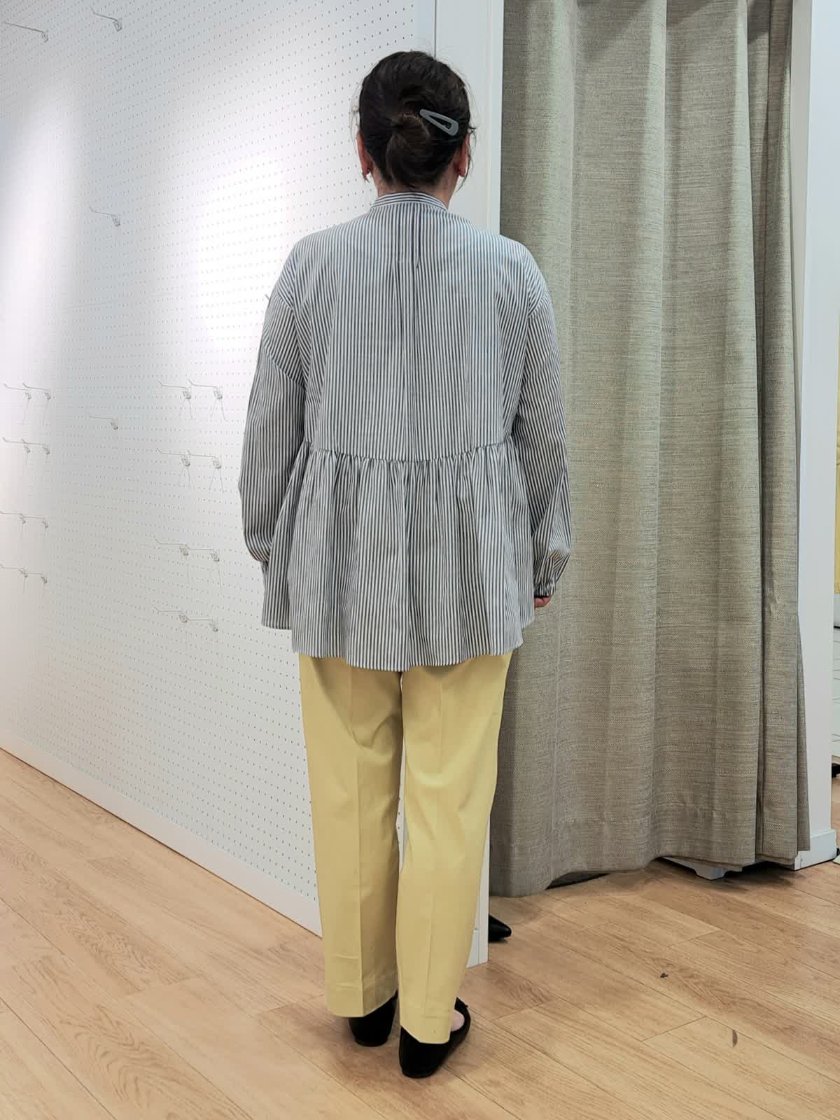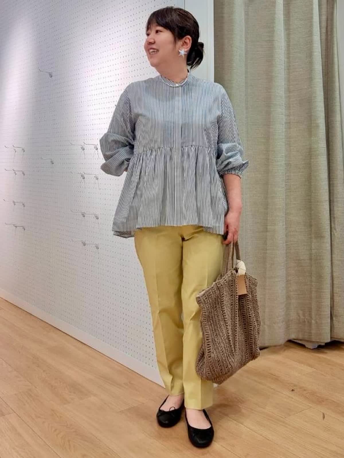 【着用カラー/着用サイズ】ブラウス:ストライプ:号フリー/パンツ:イエロー:9号 友達とのランチスタイリング 春先にジャストで着られるブラウスは着丈も短過ぎないのでパンツと合わせた時でもスッキリとした印象になります。
