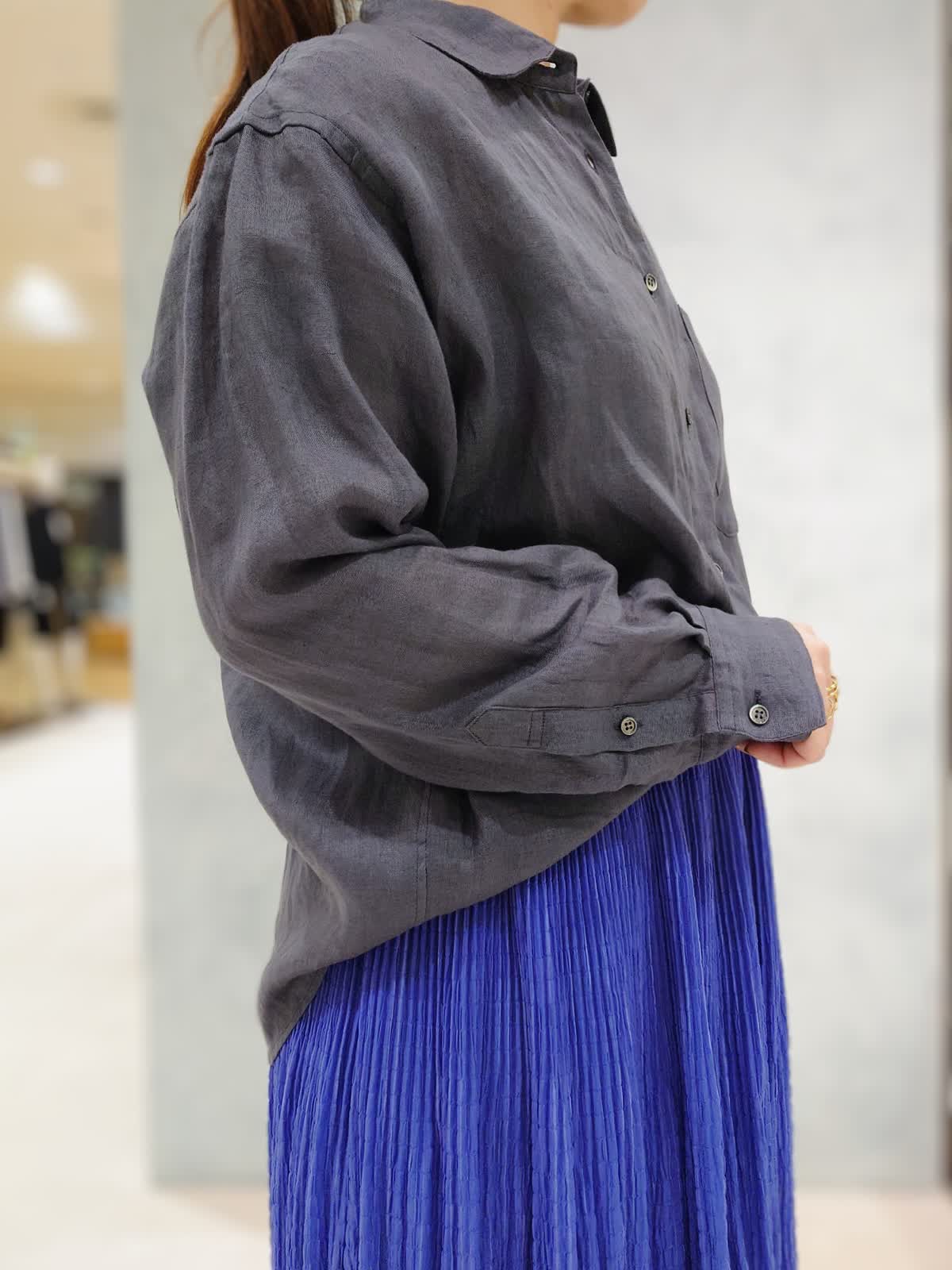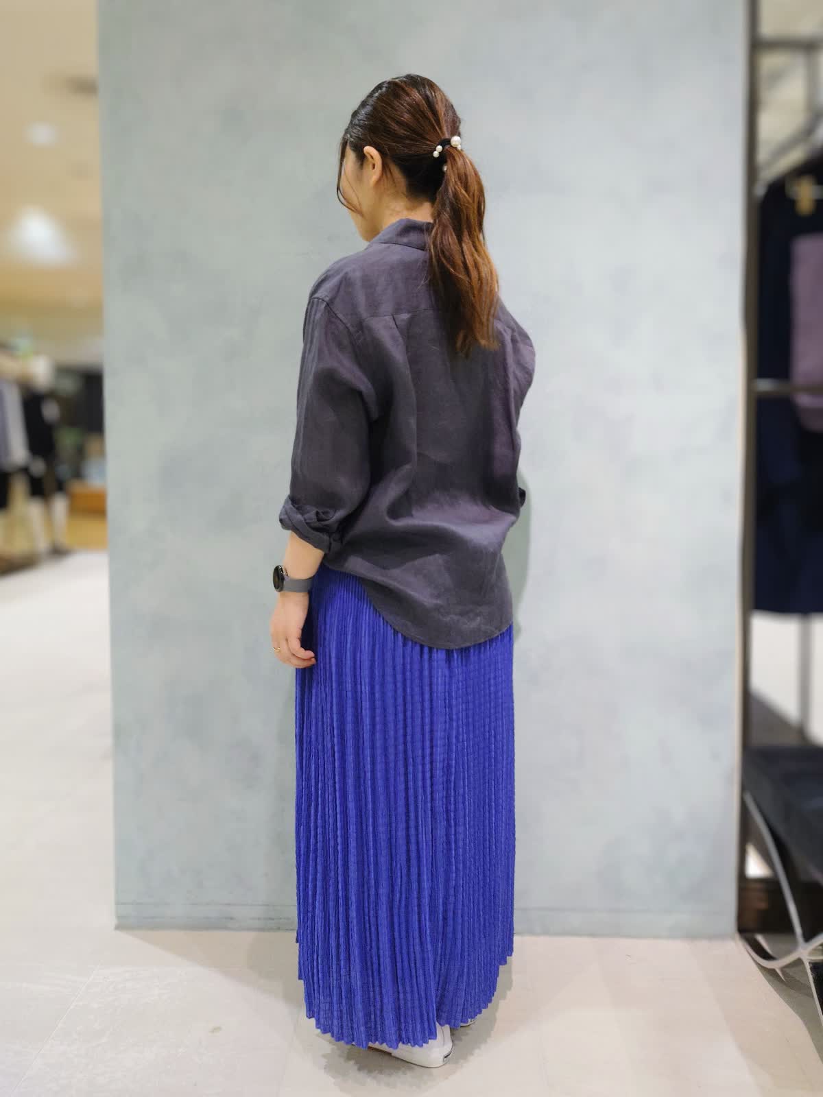 【着用サイズ】シャツ:9号 スカート:9号 【着用カラー】シャツ:チャコールグレー スカート:ブルー 1着は持っておきたいリネンシャツに鮮やかなブルーのスカートを合わせた大人カジュアルスタイル。 甘くなりすぎないバランスで、きれいめにもカジュアルにも着回せるのがポイントです。足元はスニーカーで外して今っぽい抜け感を演出。