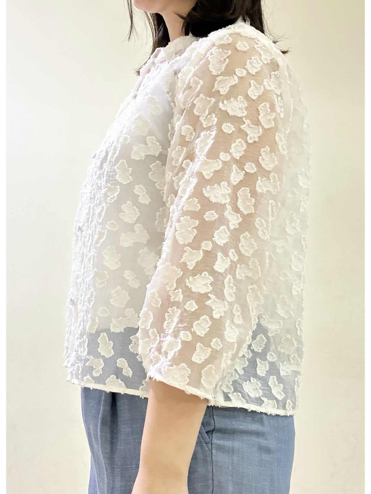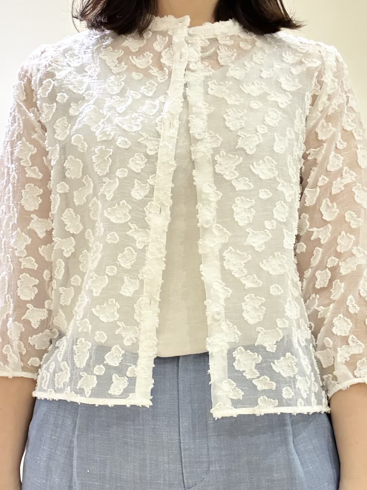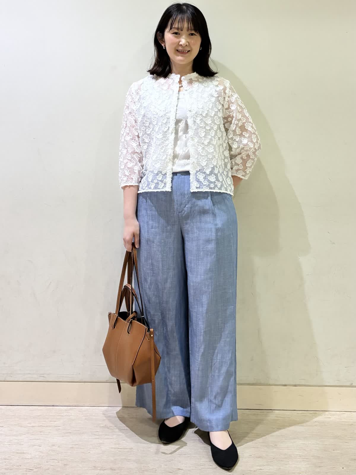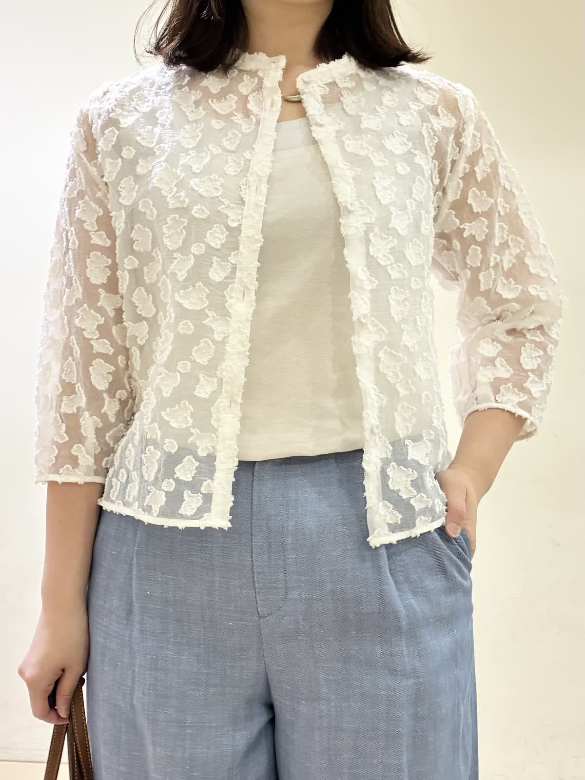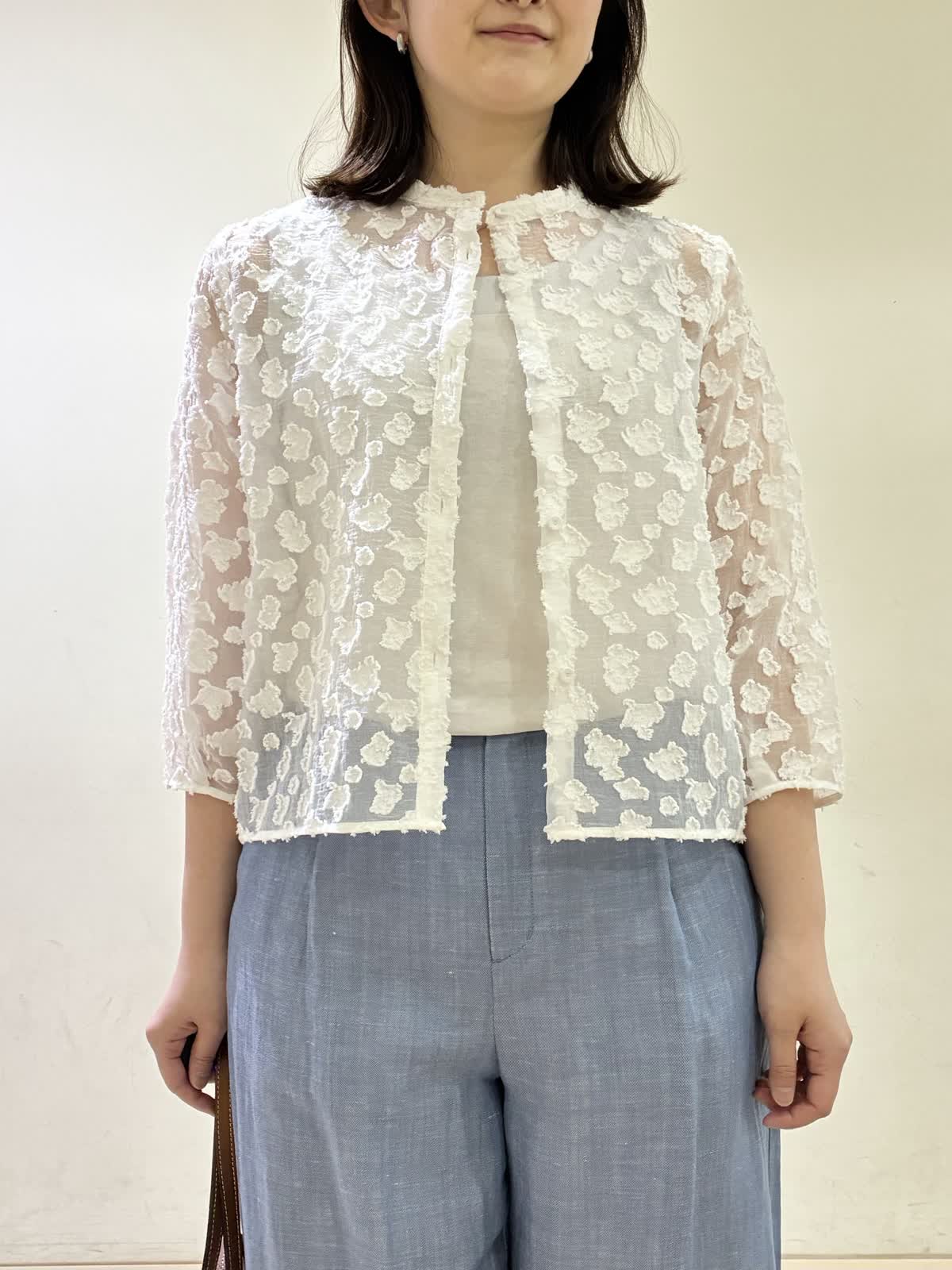 【着用カラー/サイズ】ブラウス:ホワイト/フリー タンクトップ:グレー/11号 パンツ :サックス/11号 初夏の上品おでかけコーデ。ジャガードブラウスを主役にデニムでカジュアルさをプラス。透け感のあるシアーブラウスが上品な印象です。コンパクトな丈感がおしゃれで、ワイドパンツとのバランスが絶妙です。