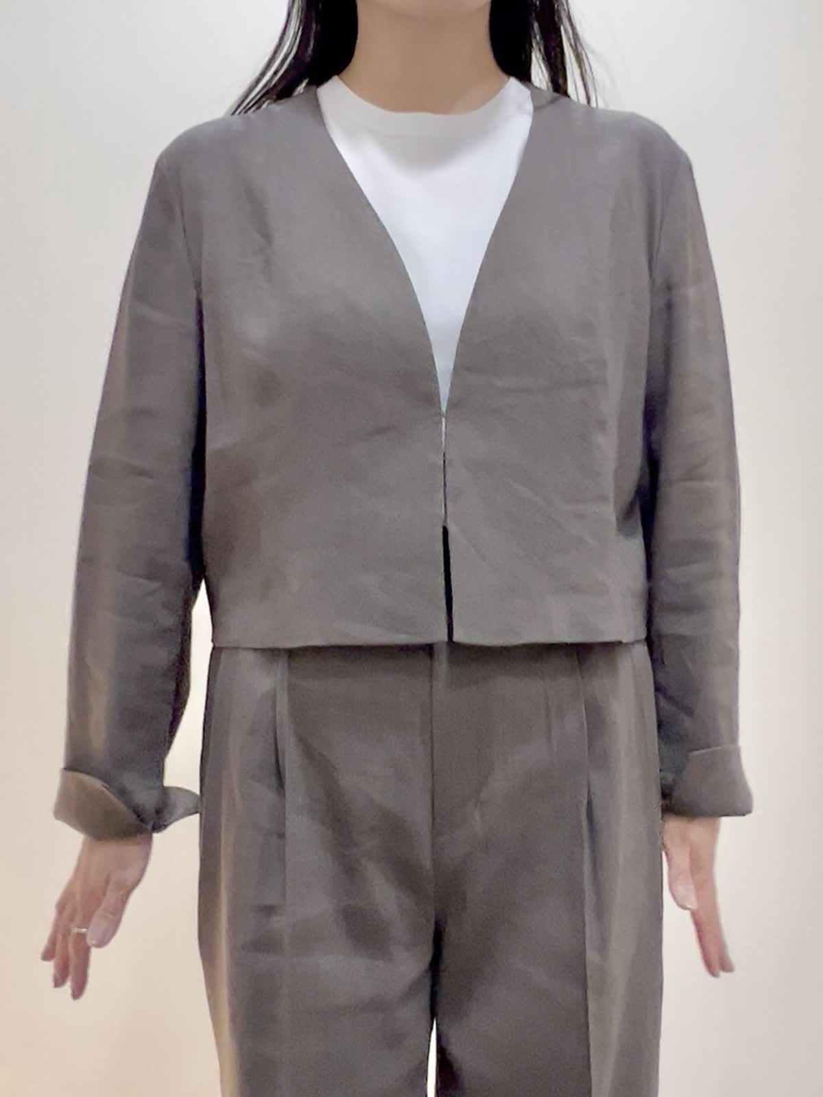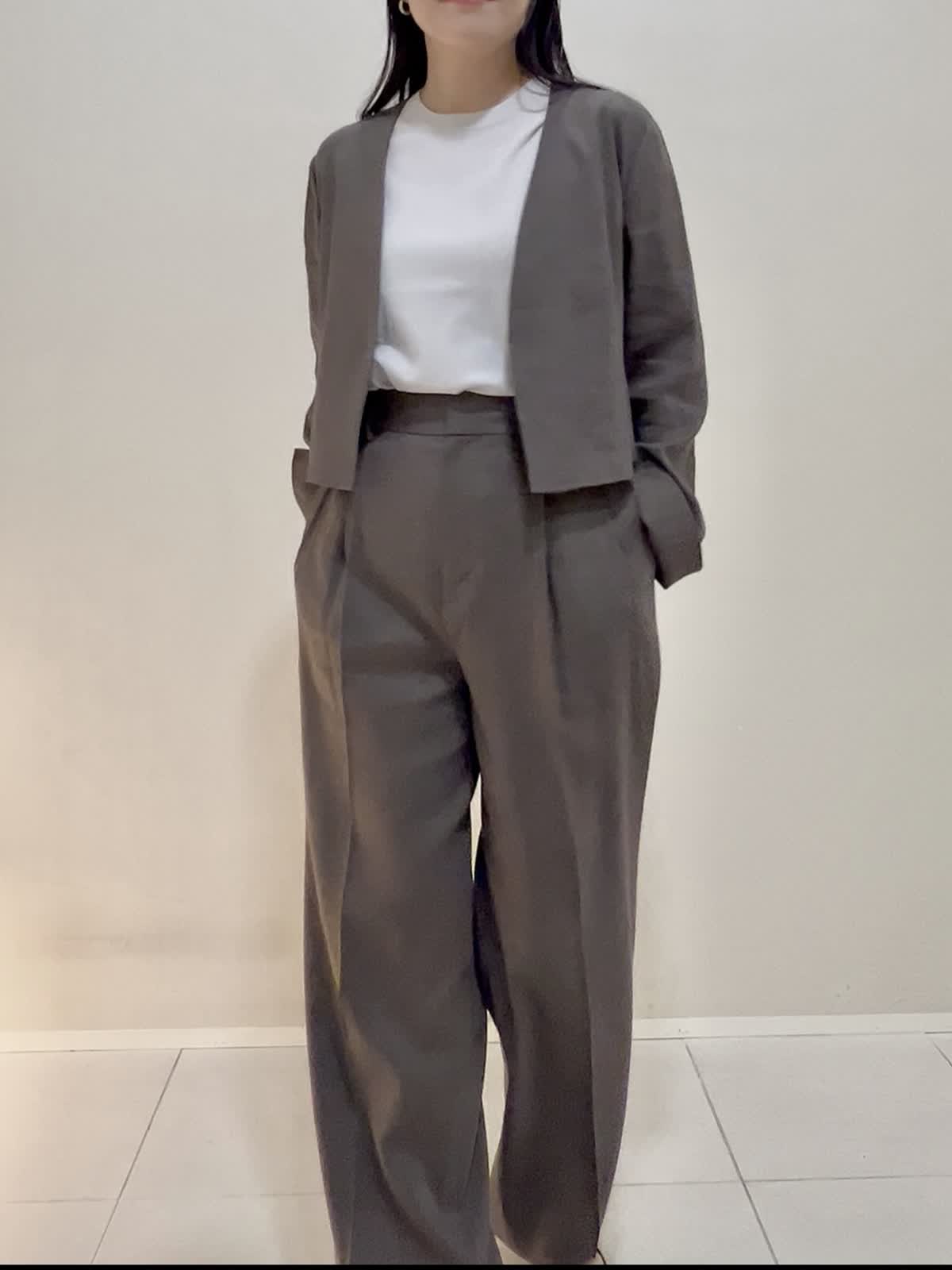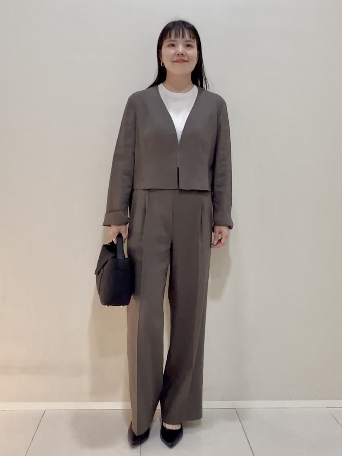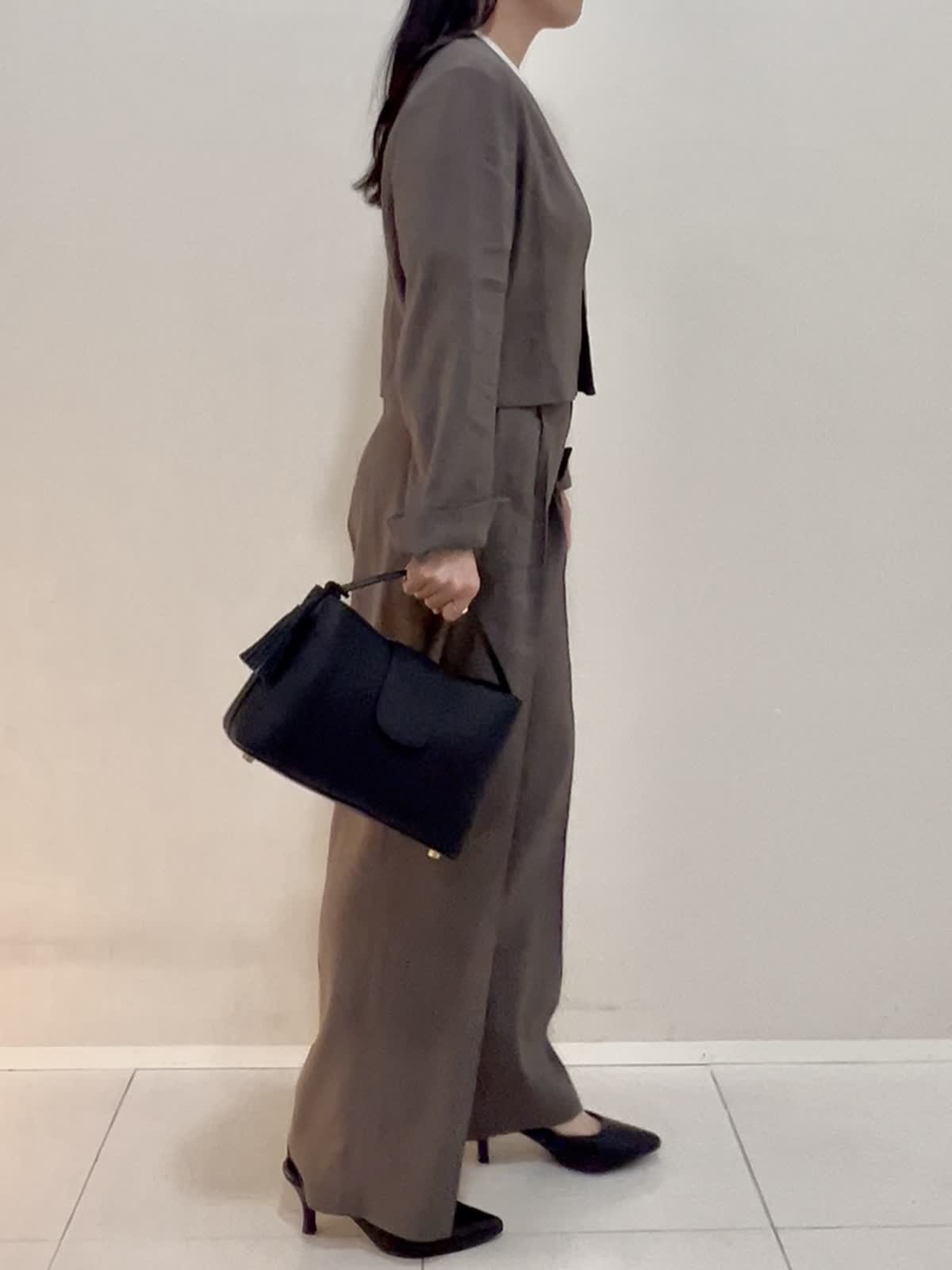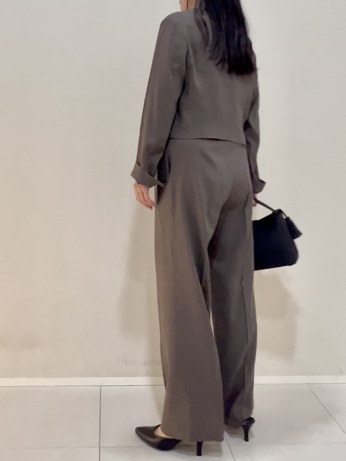 【着用サイズ/カラー】ジャケット:9号 モカチャ ニット:9号 グレーベージュ パンツ:7号 モカチャ バッグ:ブラック 通勤におすすめのセットアップ。ジャケットは丈がコンパクト。袖も折れるデザインです。インナーのニットは袖と裾がバイカラーに。1枚でもサマになるし、インナーとしても優秀です。