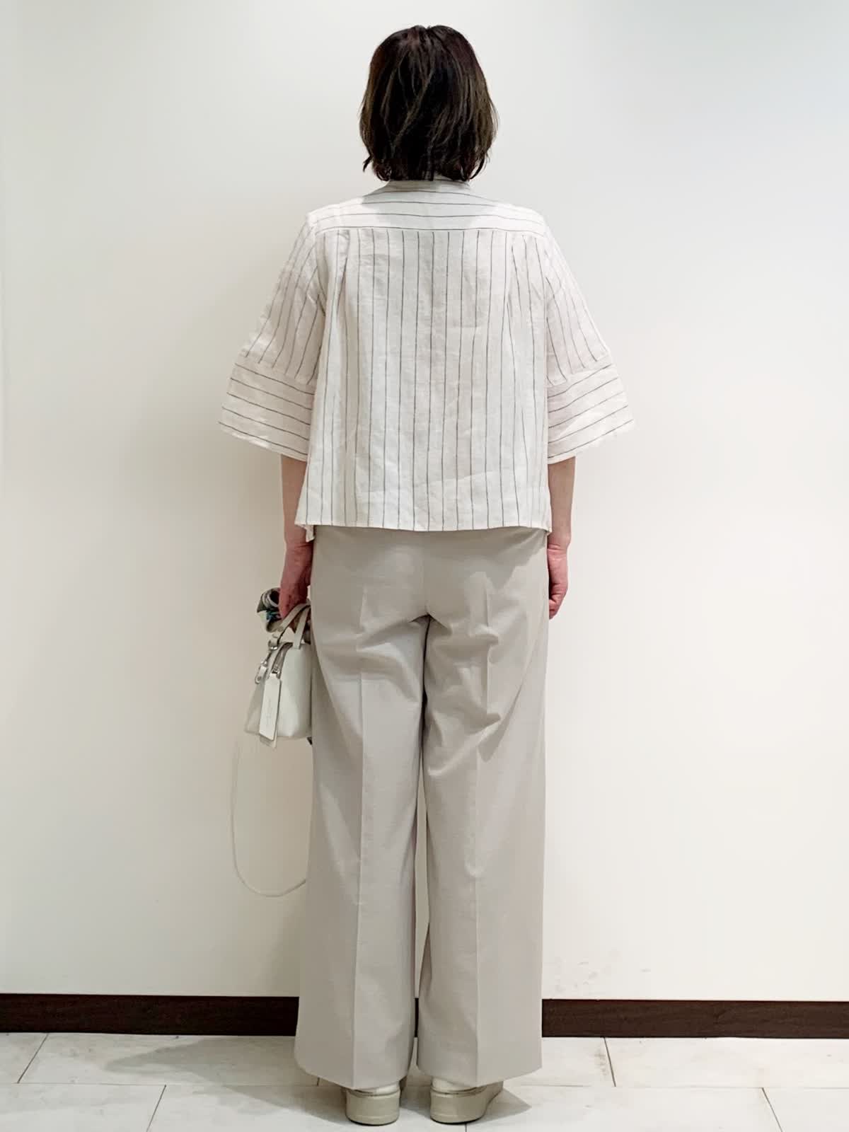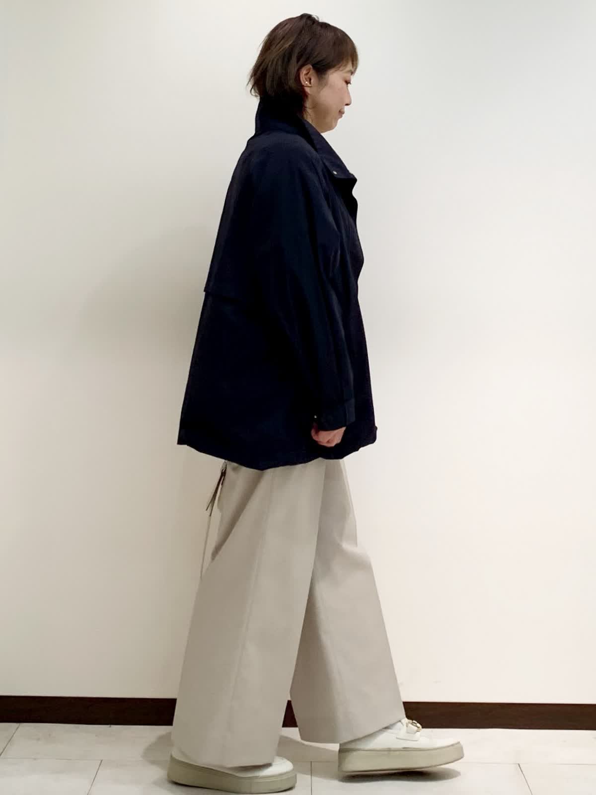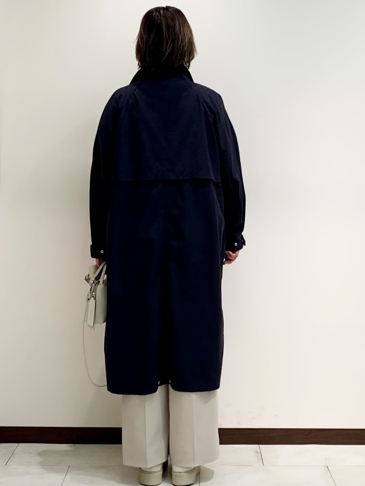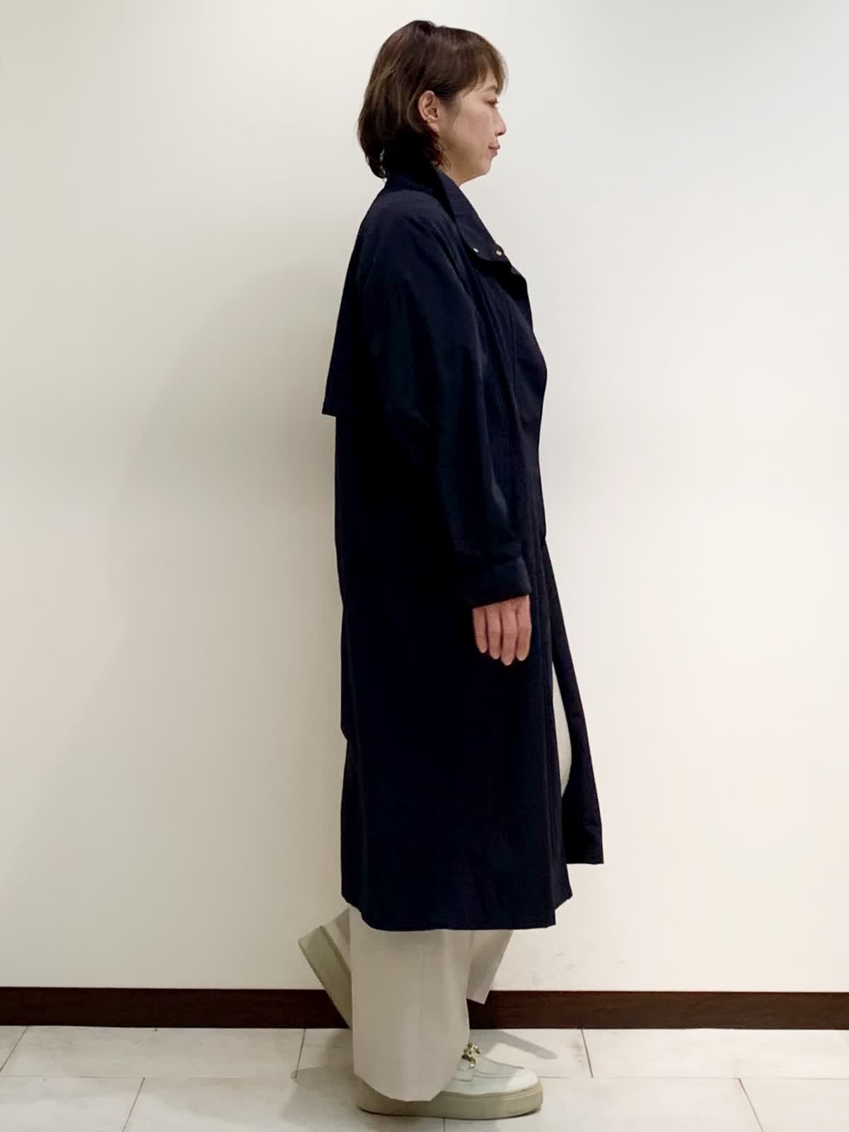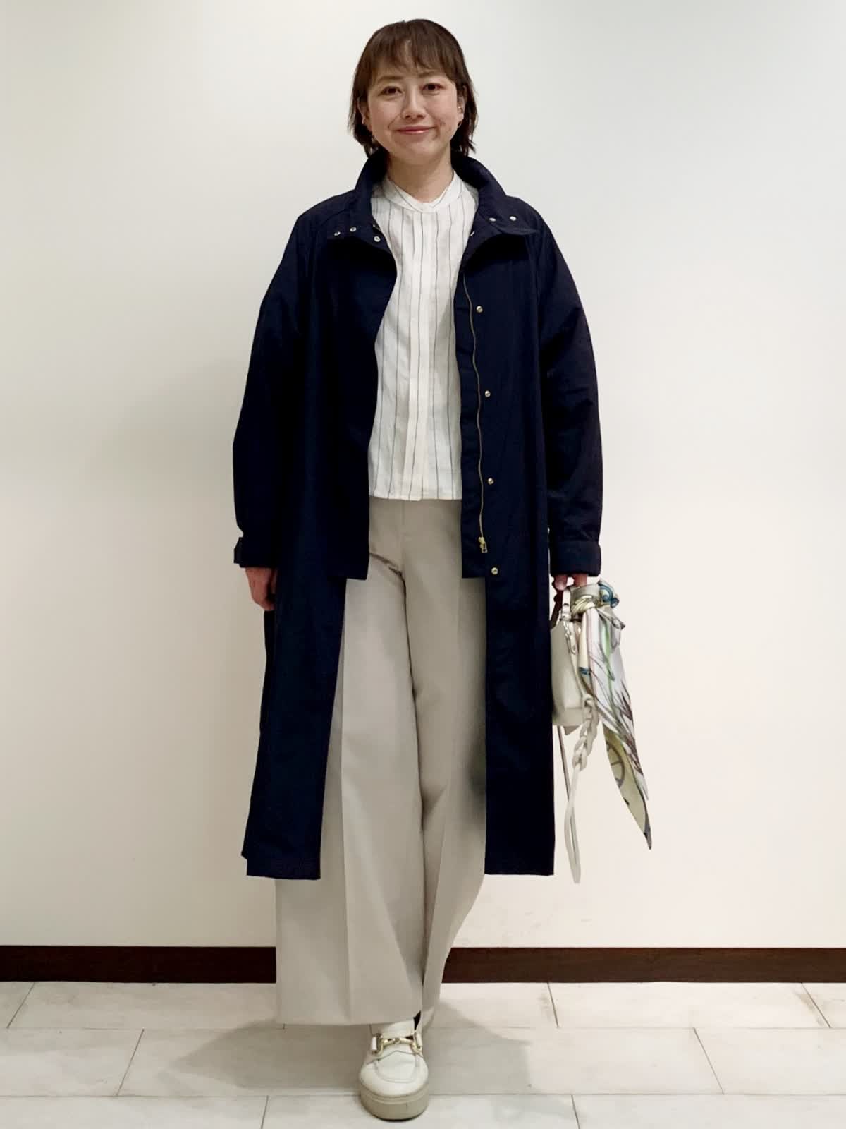 【着用サイズ】コート:全て9号サイズ 【着用カラー】コート:ネイビー ブラウス:ストライプ パンツ:ベージュ バッグ:オフホワイト 長さ調整のできる万能な2wayコートは、行く先々の気温によって変化を楽しめる一着。 リネンの軽やかなブラストパンツを合わせたコーディネート。