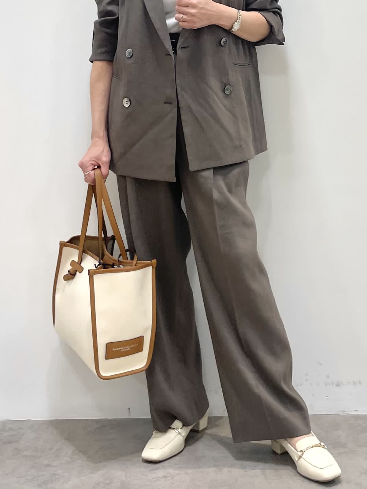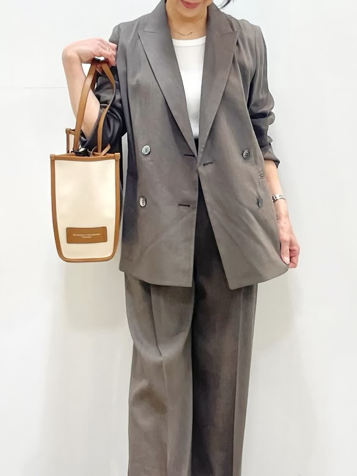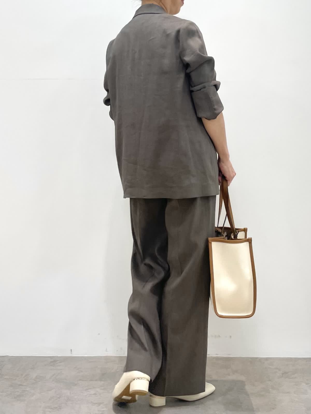 【着用サイズ】全て9号 【着用カラー】ジャケット、パンツ:モカチャ タンクトップ:オフホワイト PONTERORTOの生地を使用したリネンのセットアップ。さらりとした生地がスタイリングに抜け感をプラスします。ジャケットはかっちりとしすぎないラフな印象。羽織るだけでモードな雰囲気に。タックパンツは自然に広がるセミワイドシルエット。分量感がありつつもしなやかな落ち感があり、広がらずにスッキリ見えます。