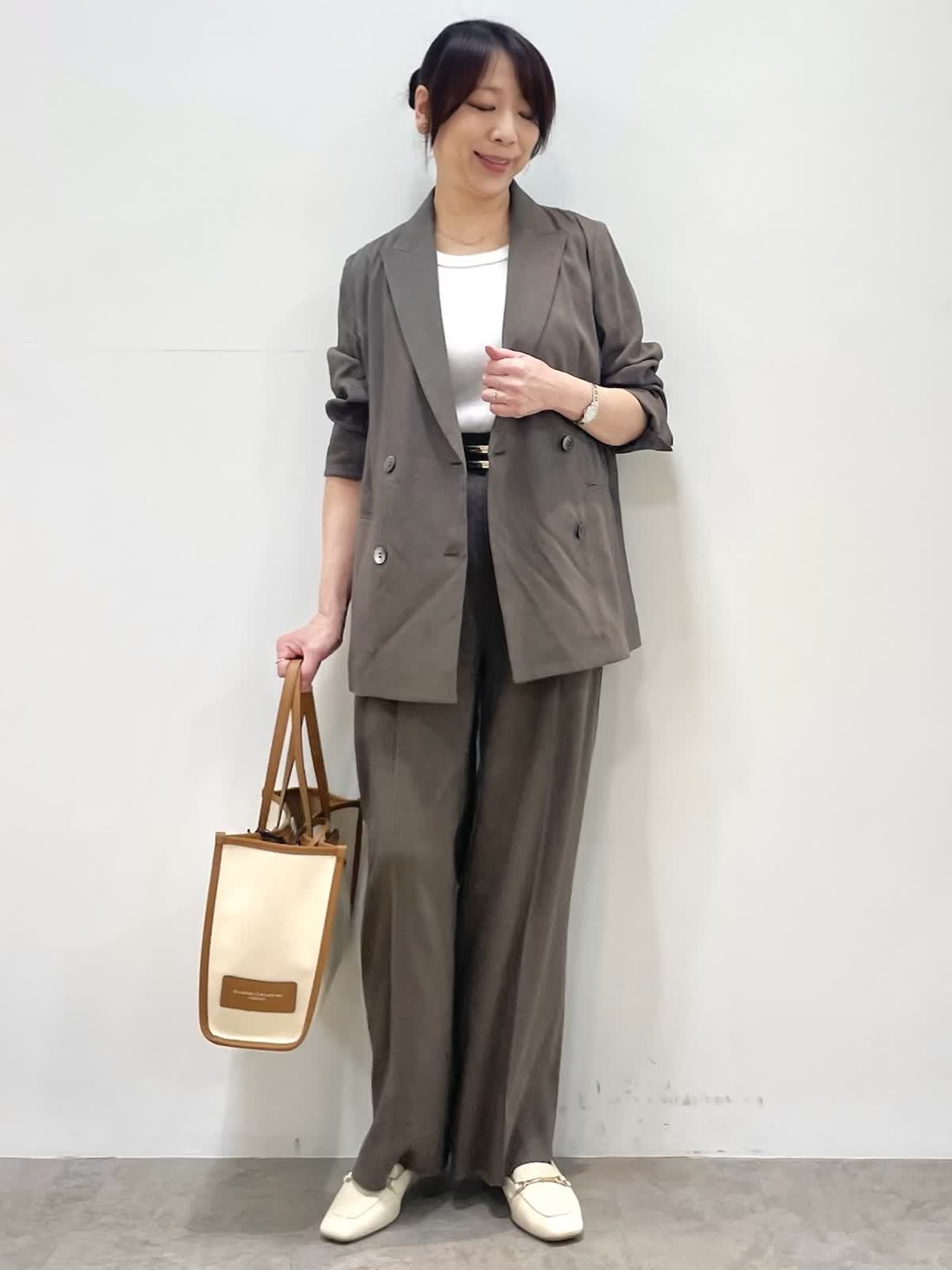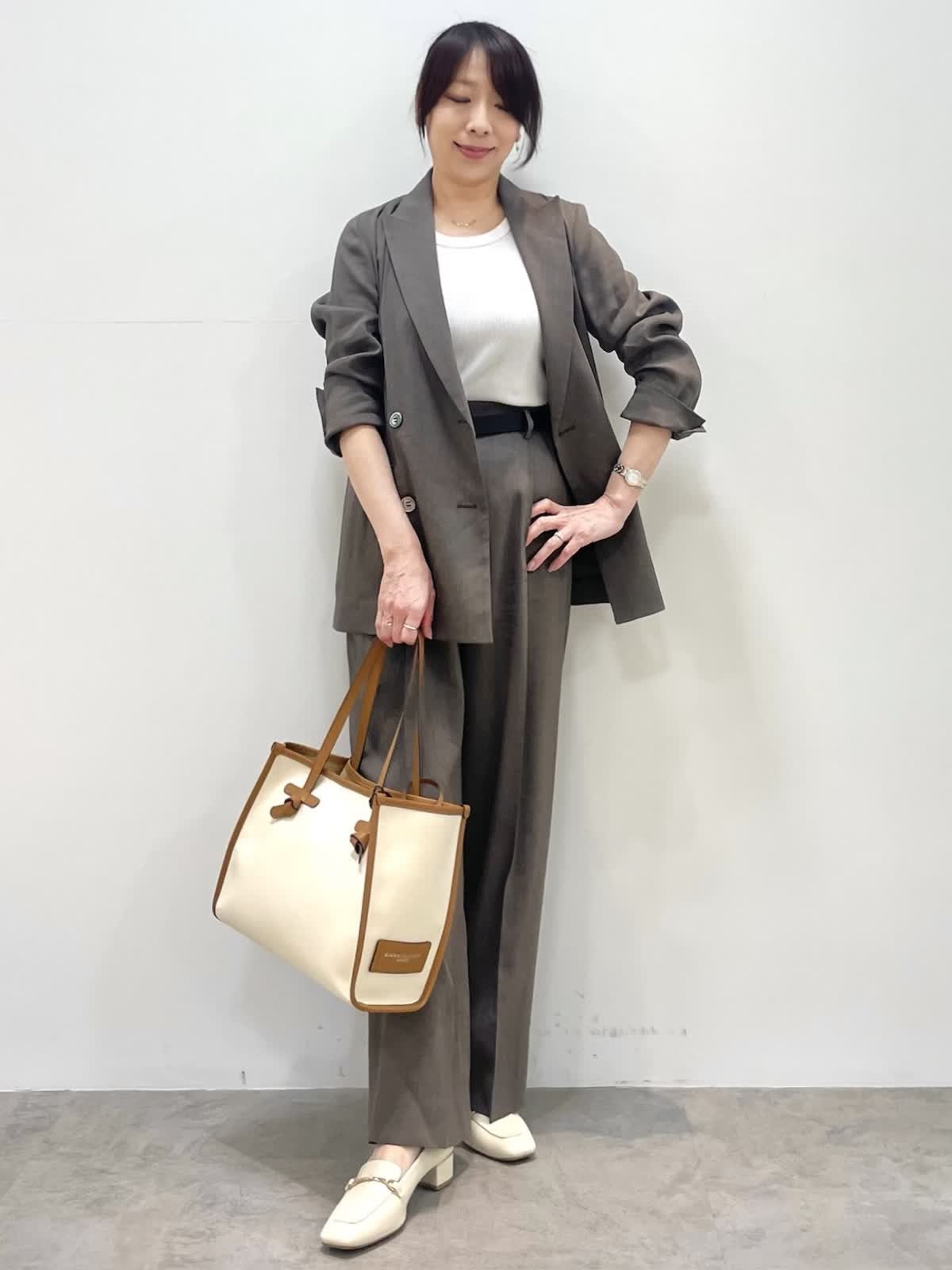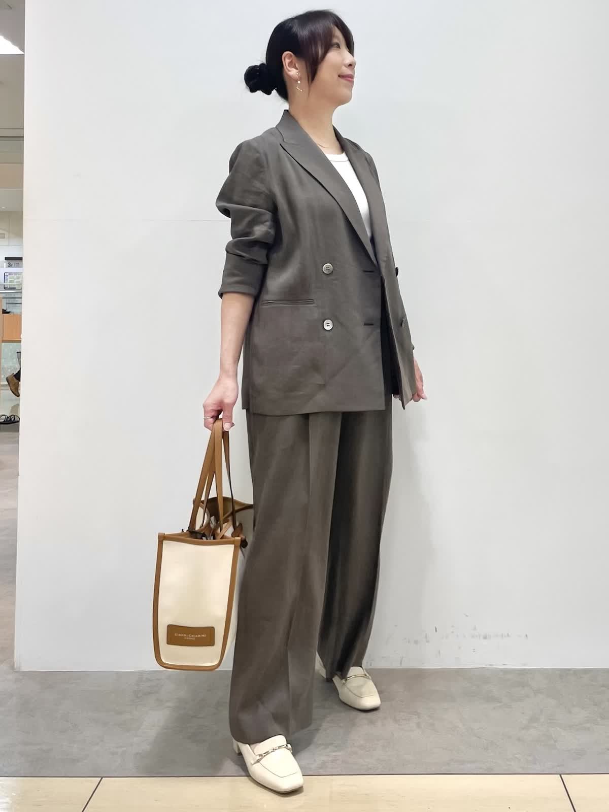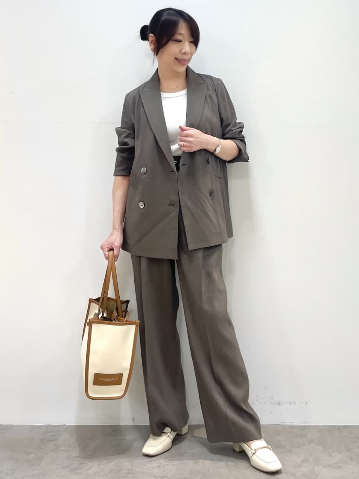 【着用サイズ】全て9号 【着用カラー】ジャケット、パンツ:モカチャ タンクトップ:オフホワイト PONTERORTOの生地を使用したリネンのセットアップ。さらりとした生地がスタイリングに抜け感をプラスします。ジャケットはかっちりとしすぎないラフな印象。羽織るだけでモードな雰囲気に。タックパンツは自然に広がるセミワイドシルエット。分量感がありつつもしなやかな落ち感があり、広がらずにスッキリ見えます。