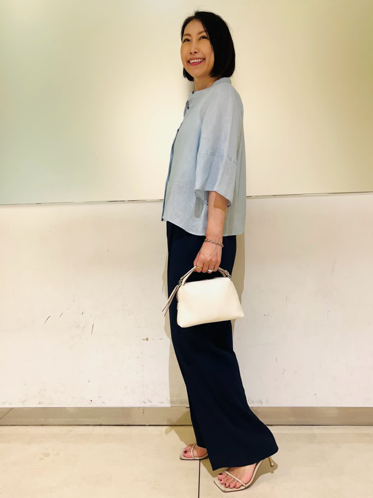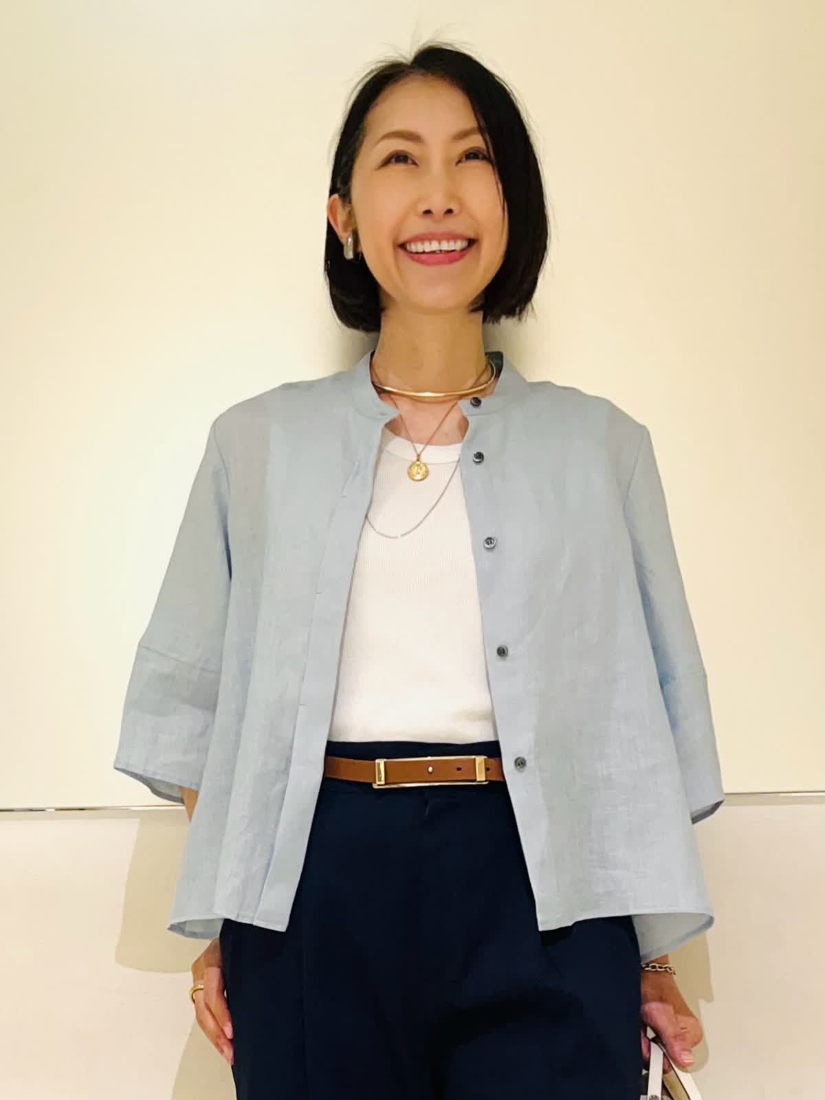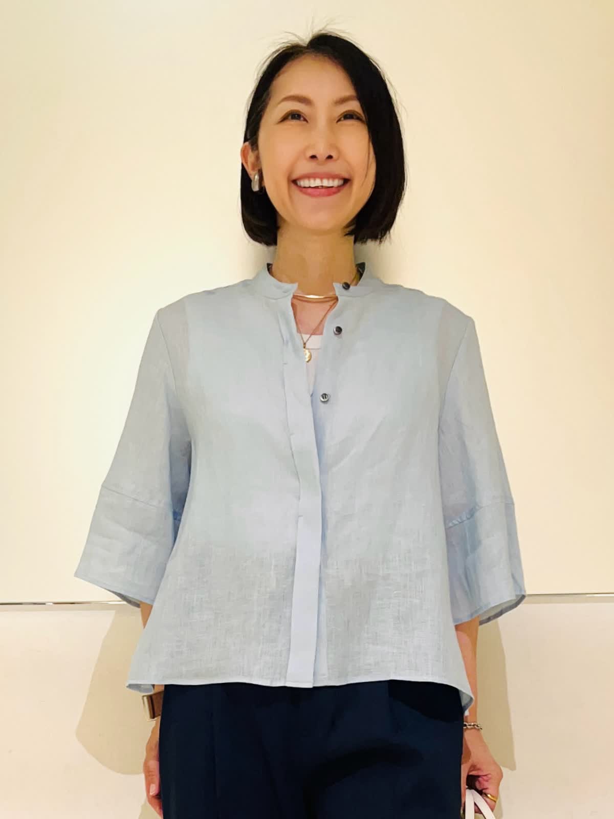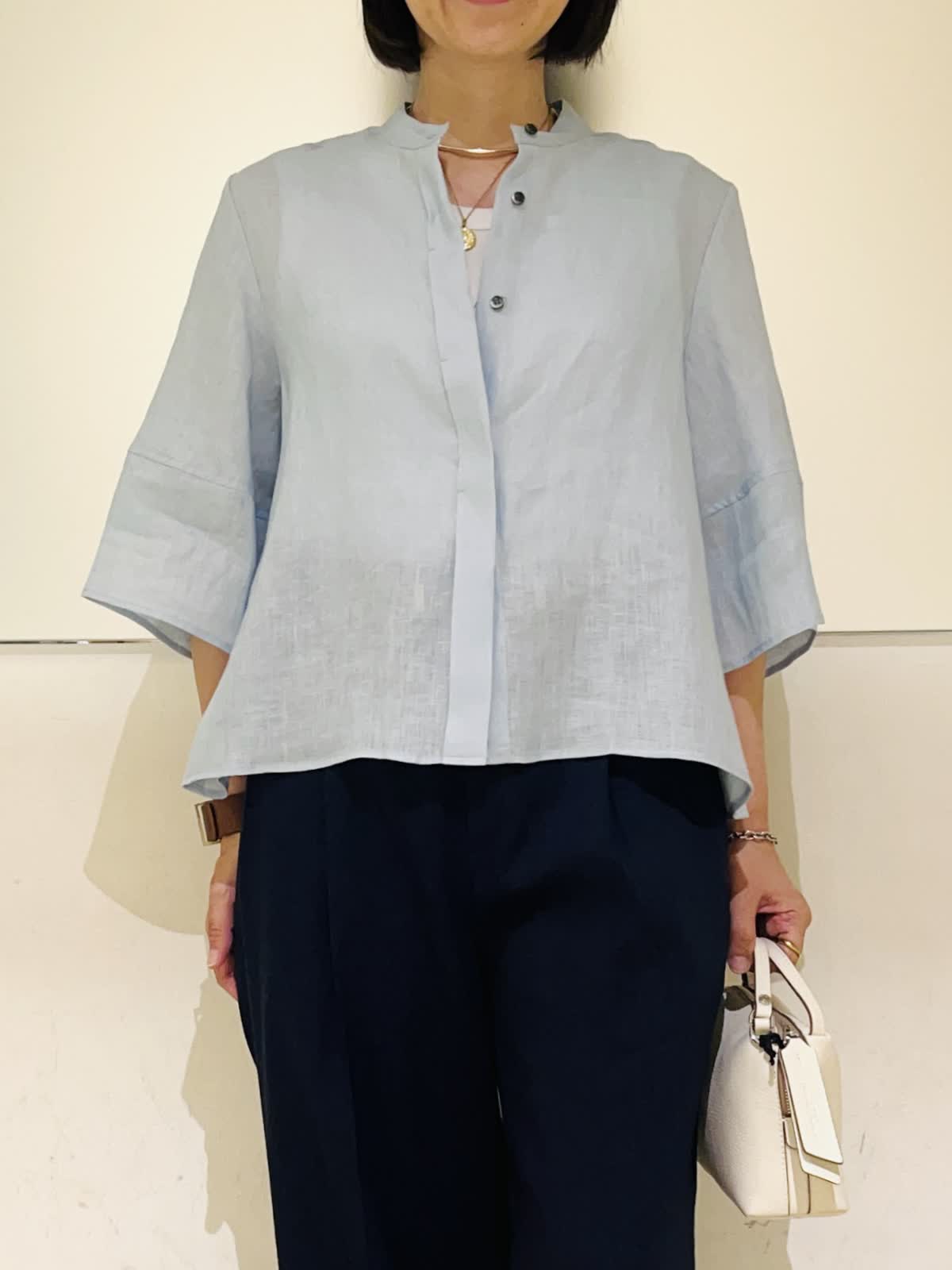【着用アイテム】すべて9号 【着用カラー】シャツ:サックス カットソー:オフホワイト パンツ:ネイビー 羽織りでも1枚でも着られるリネンシャツ。前を開けて着れば羽織りとして着られます。肘まで隠れる5部袖で、気になる二の腕をカバーしつつ、冷房、日焼け対策もしてくれます。爽やかなサックスカラーにマリンカラーのネイビーを合わせた、初夏にぴったりな清涼感のあるスタイリングです。