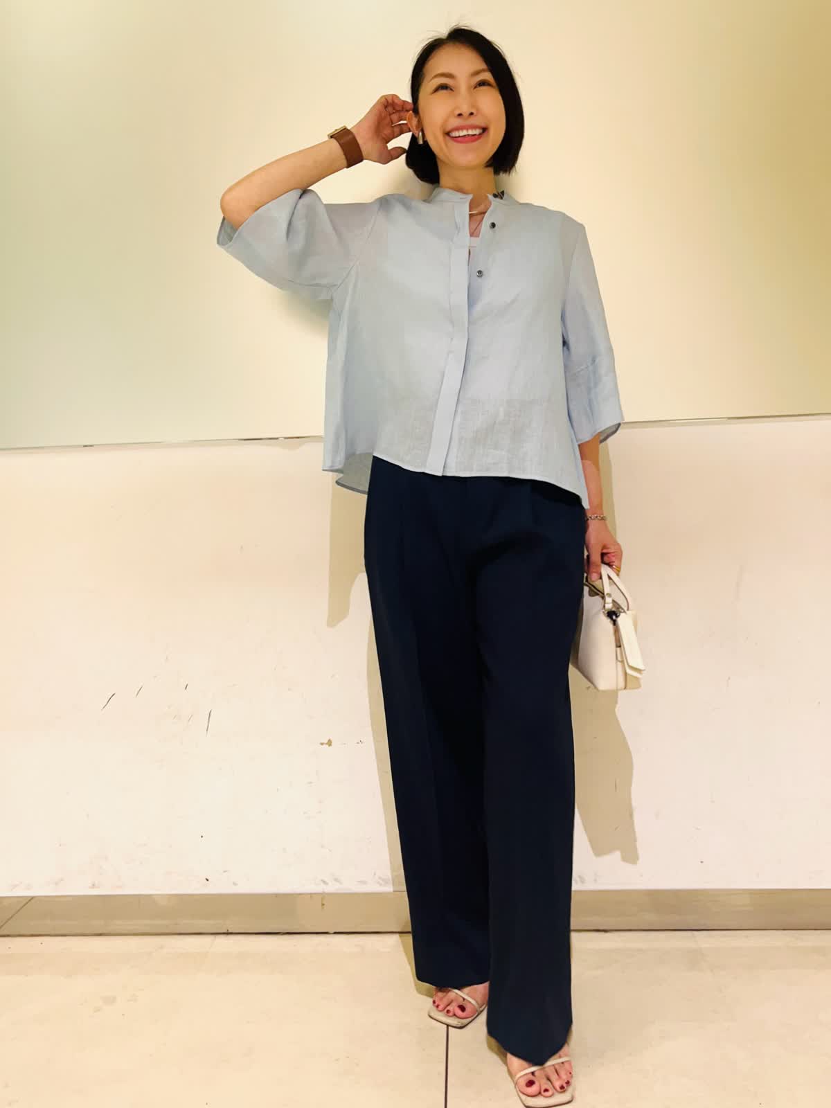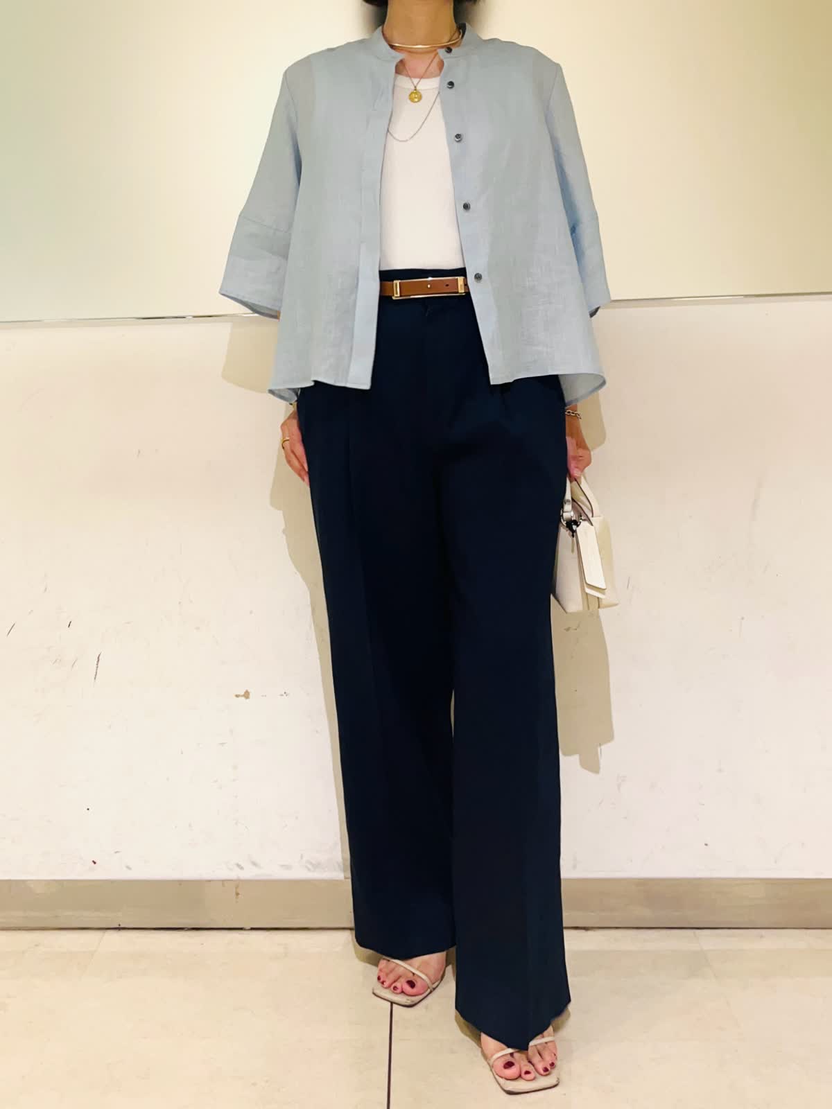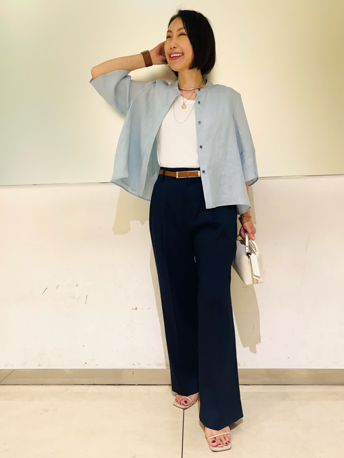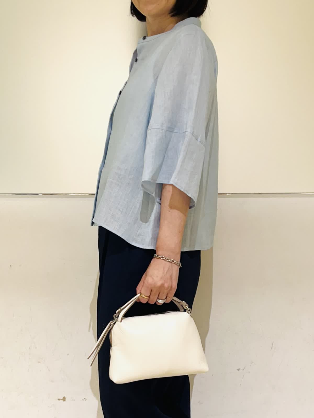 【着用アイテム】すべて9号 【着用カラー】シャツ:サックス カットソー:オフホワイト パンツ:ネイビー 羽織りでも1枚でも着られるリネンシャツ。前を開けて着れば羽織りとして着られます。肘まで隠れる5部袖で、気になる二の腕をカバーしつつ、冷房、日焼け対策もしてくれます。爽やかなサックスカラーにマリンカラーのネイビーを合わせた、初夏にぴったりな清涼感のあるスタイリングです。