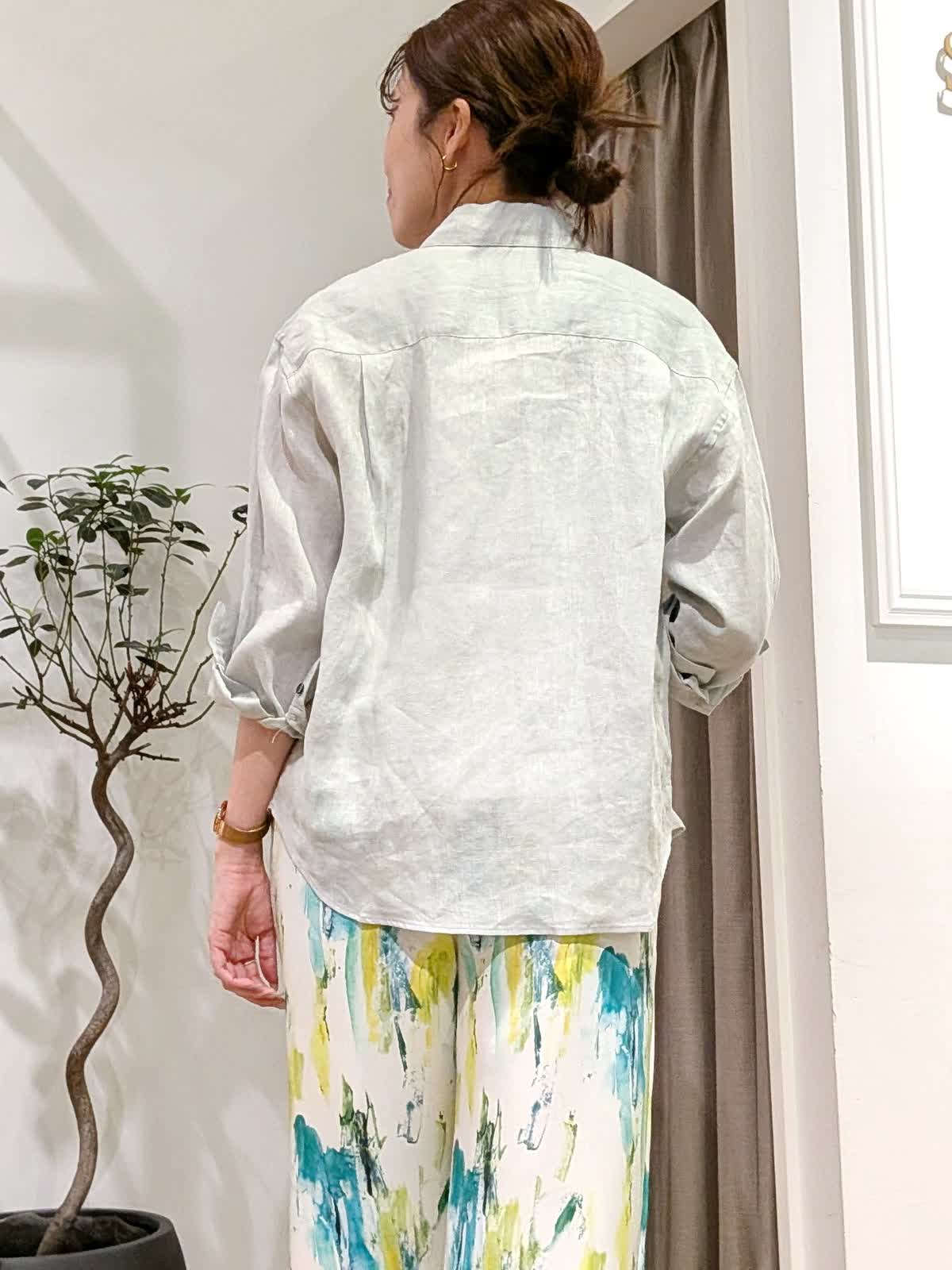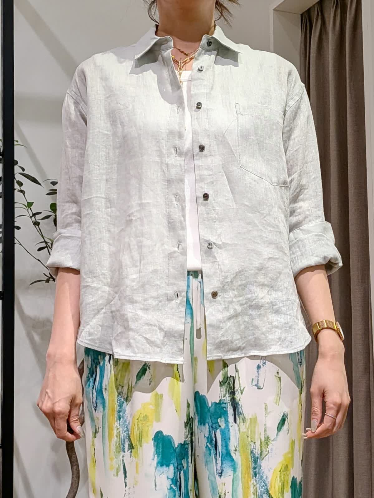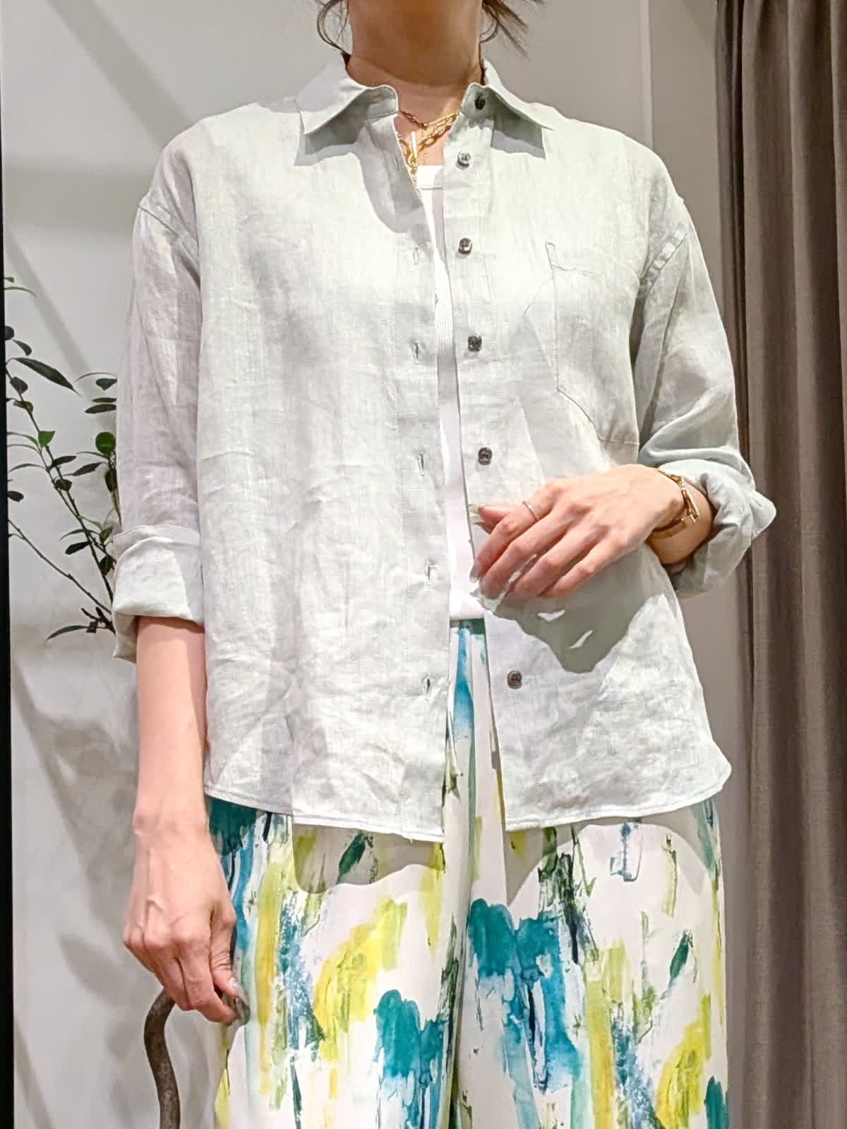 【着用サイズ】ブラウス?ペールグリーン?7号 タンクトップ?オフホワイト?9号 パンツ?ペパーミント?7号 真夏まで着れるリネンブラウススタイル。なかなか出会えないペールグリーンのリネンブラウス。羽織でも一枚着でも着方は自由自在。長袖なので日除けにも◎2回折り曲げて七分袖にしてみました。 タンクトップは肩の幅が広く下着が見えないデザインに。色違いで持っておきたいタンクトップです。カラーが映えるサラッとパンツは総ゴム。ウエストリボンで調節も可能です。