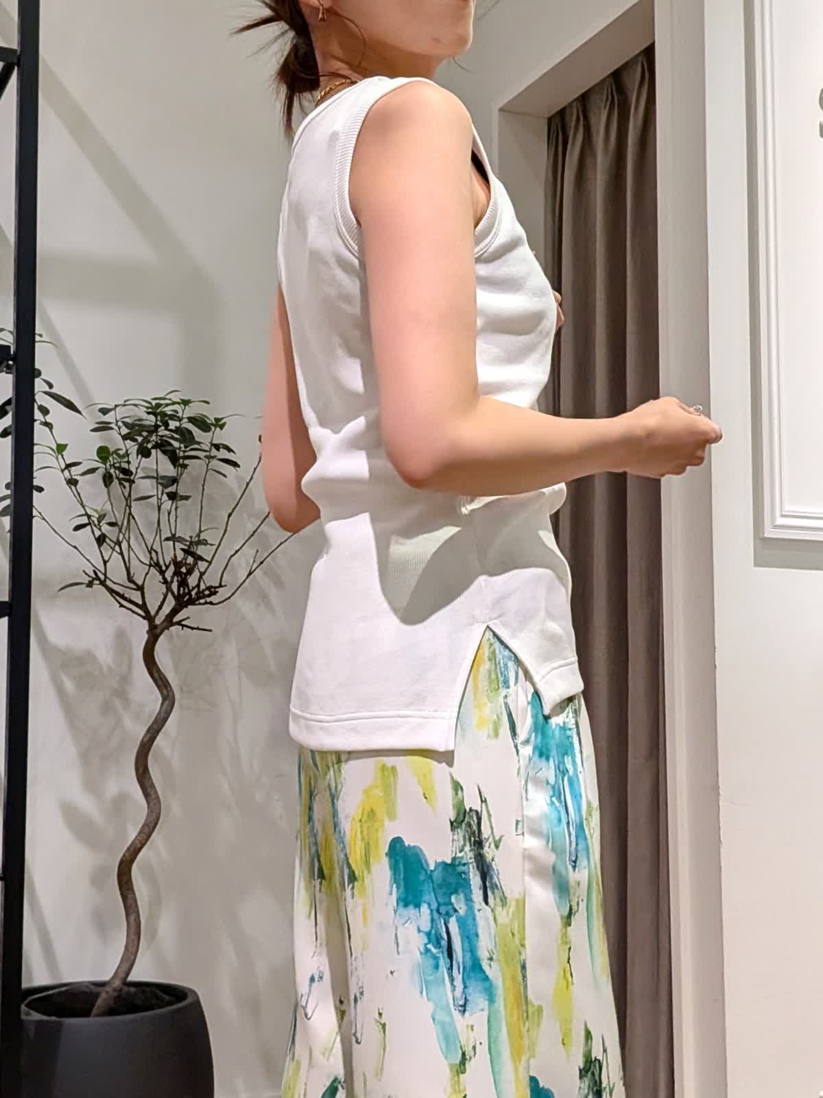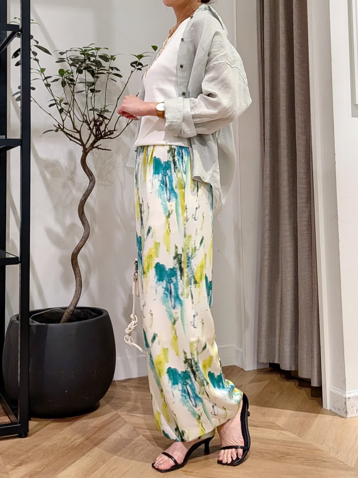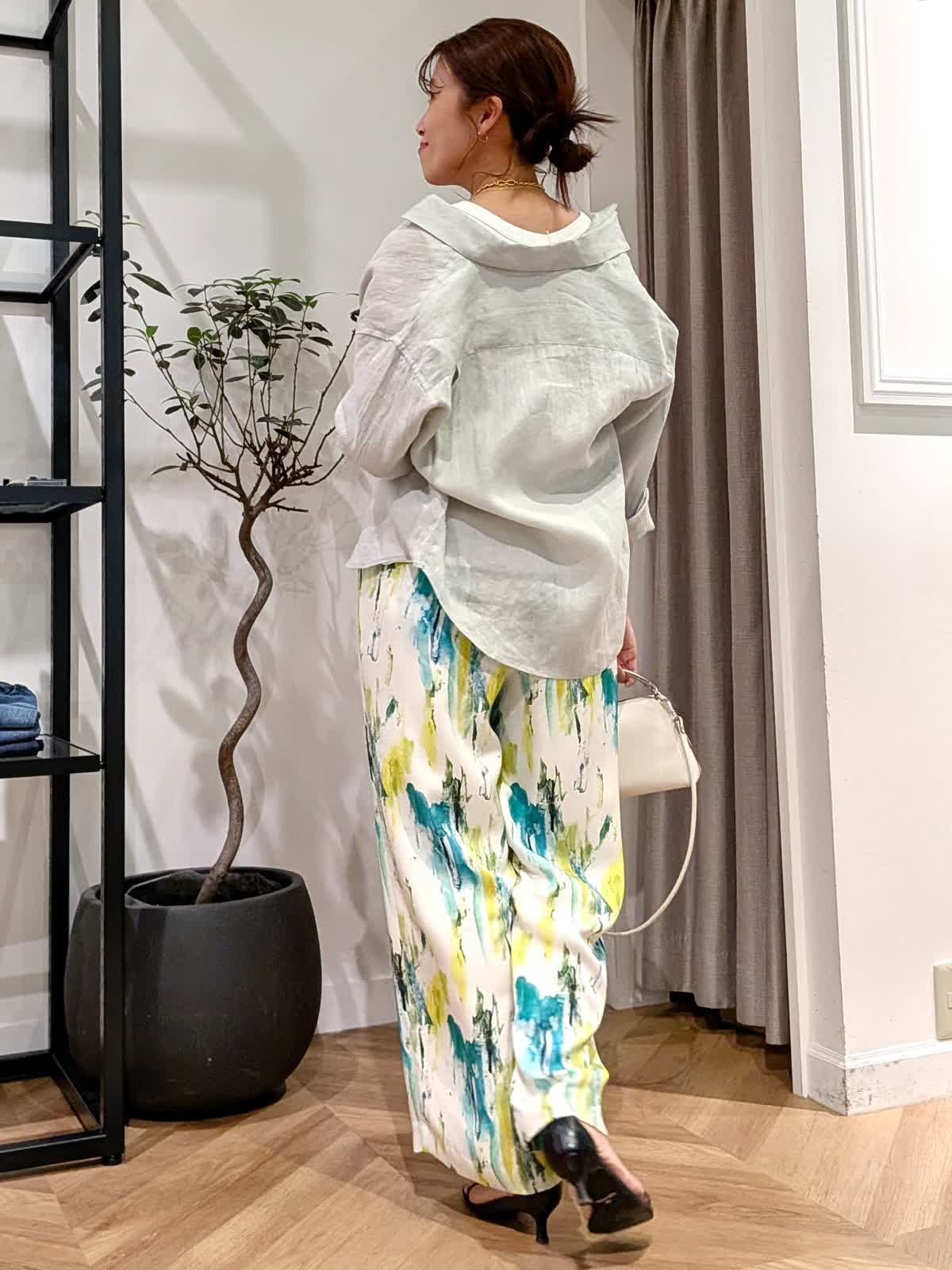 【着用サイズ】ブラウス?ペールグリーン?7号 タンクトップ?オフホワイト?9号 パンツ?ペパーミント?7号 真夏まで着れるリネンブラウススタイル。なかなか出会えないペールグリーンのリネンブラウス。羽織でも一枚着でも着方は自由自在。長袖なので日除けにも◎2回折り曲げて七分袖にしてみました。 タンクトップは肩の幅が広く下着が見えないデザインに。色違いで持っておきたいタンクトップです。カラーが映えるサラッとパンツは総ゴム。ウエストリボンで調節も可能です。