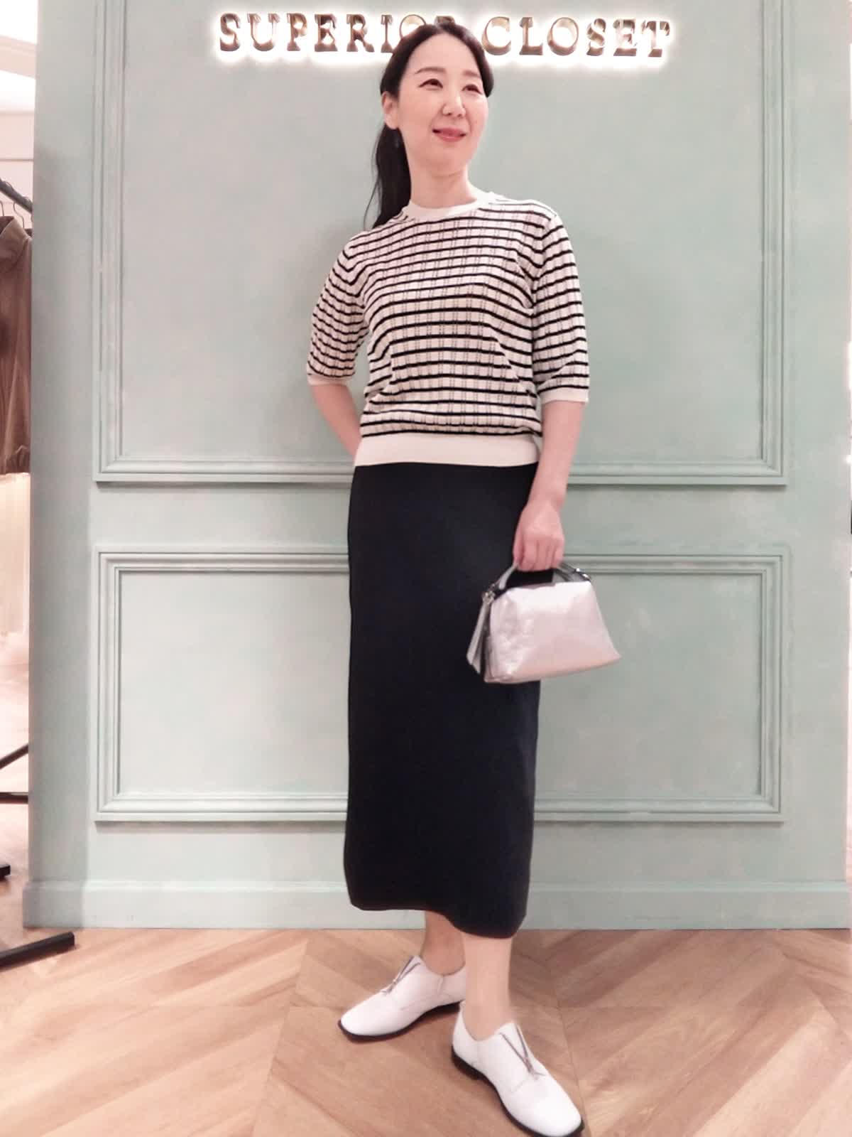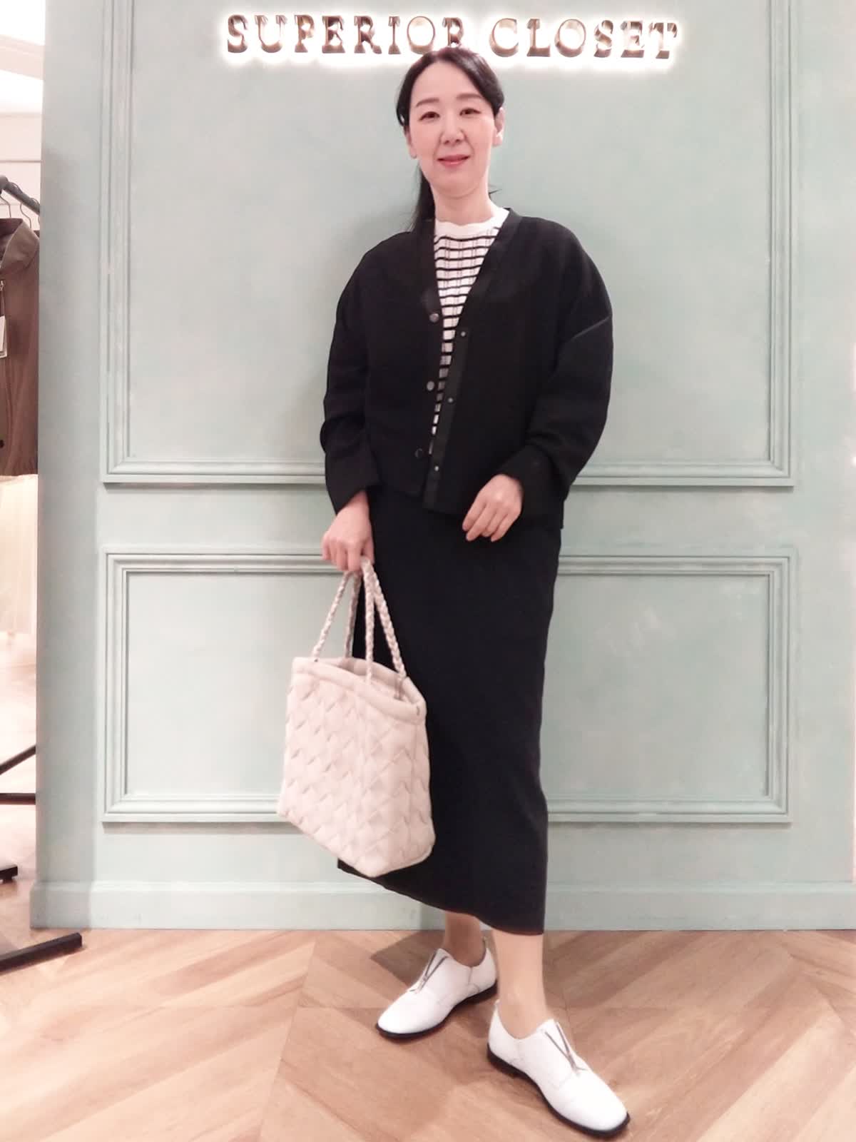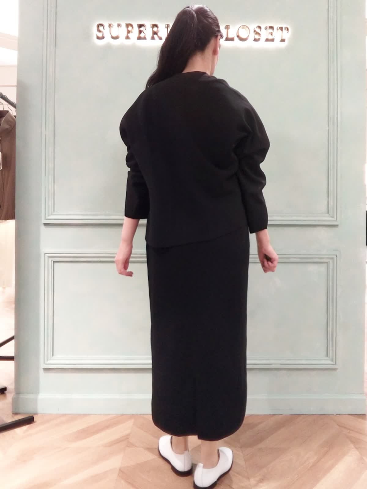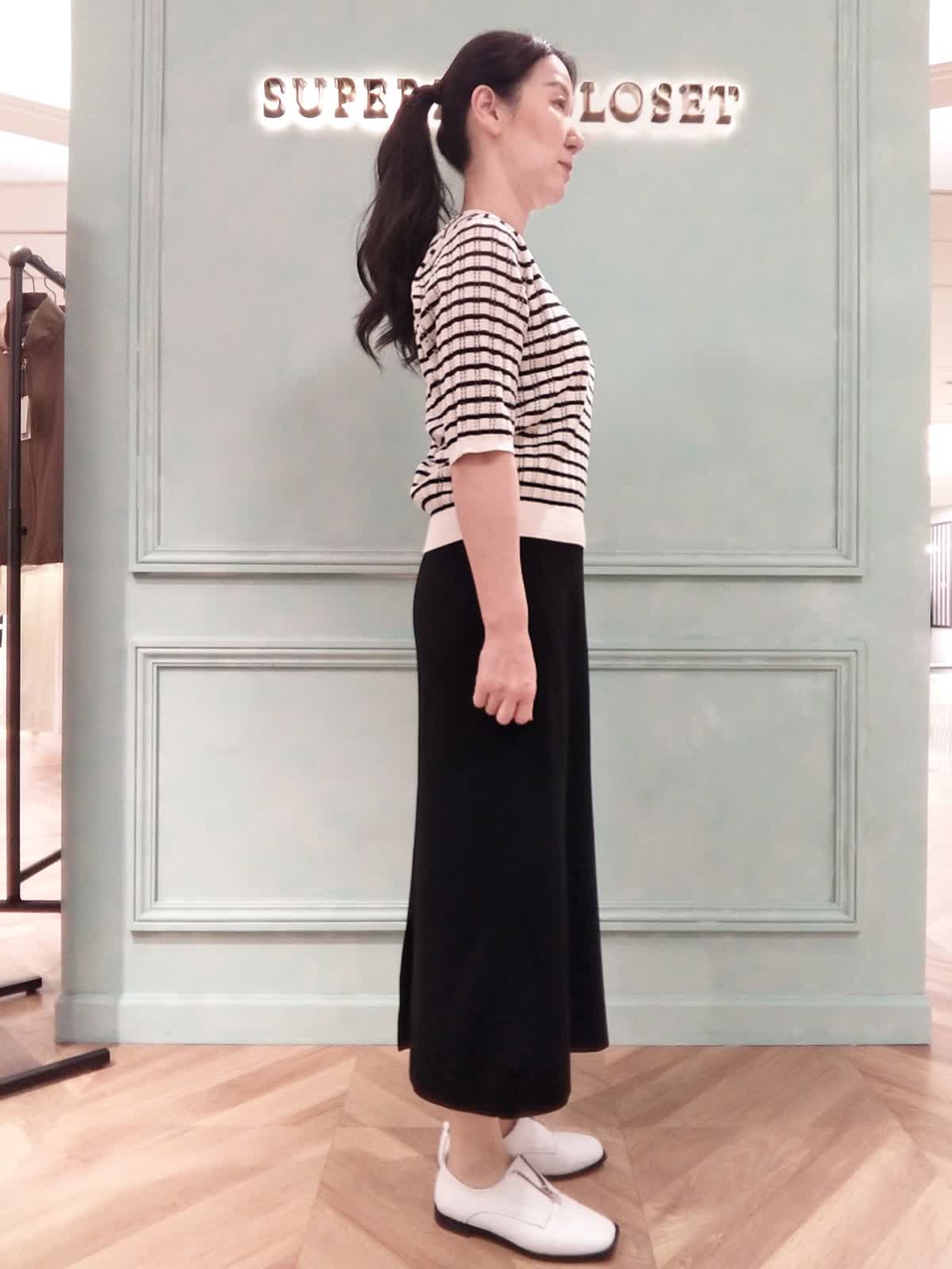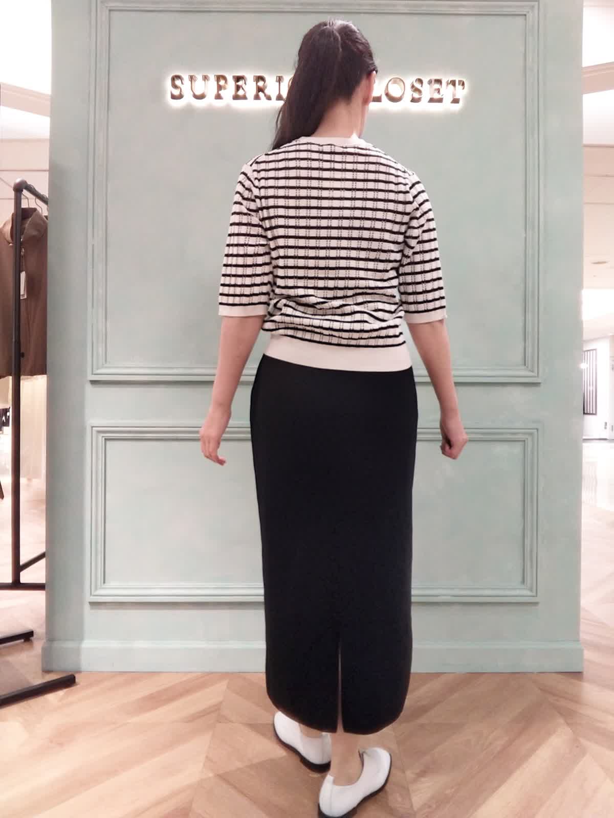 【着用サイズ】カーディガン:フリー、ニット:フリー、スカート:フリー 【着用カラー】カーディガン:ブラック、ニット:ボーダー、スカート:ブラック ニットセットアップでらくちん帰省スタイル。 動きやすくてきれいに見えるニットセットアップにインナーはボーダーの半袖ニットでコーディネート。気温の変化でカーディガンを脱ぎ着できます。カーディガンはドルマンスリーブでゆったりシルエット、スカートはウエストオールゴム仕様です。