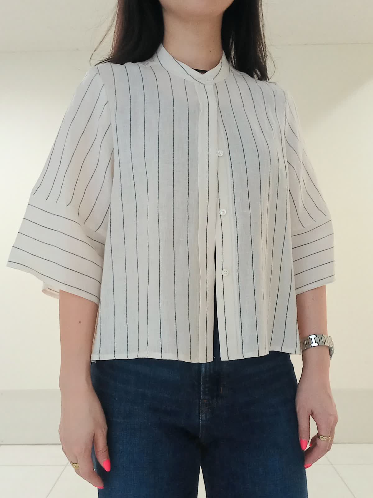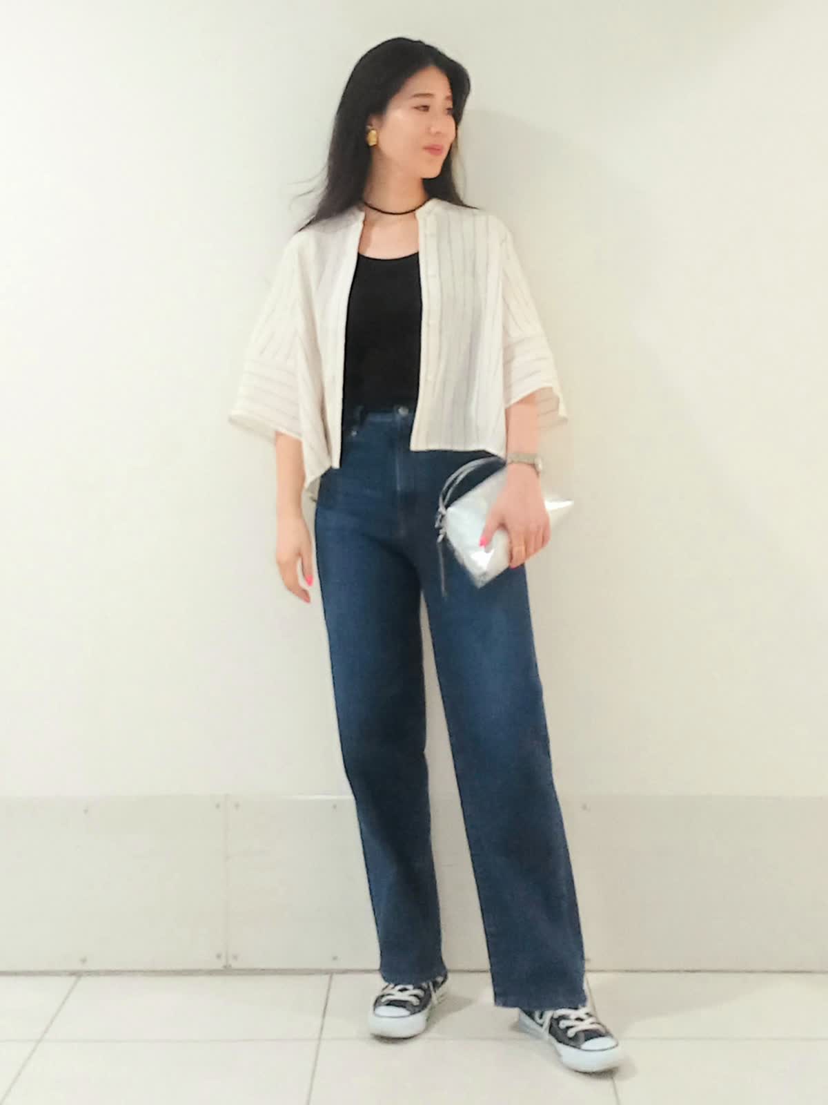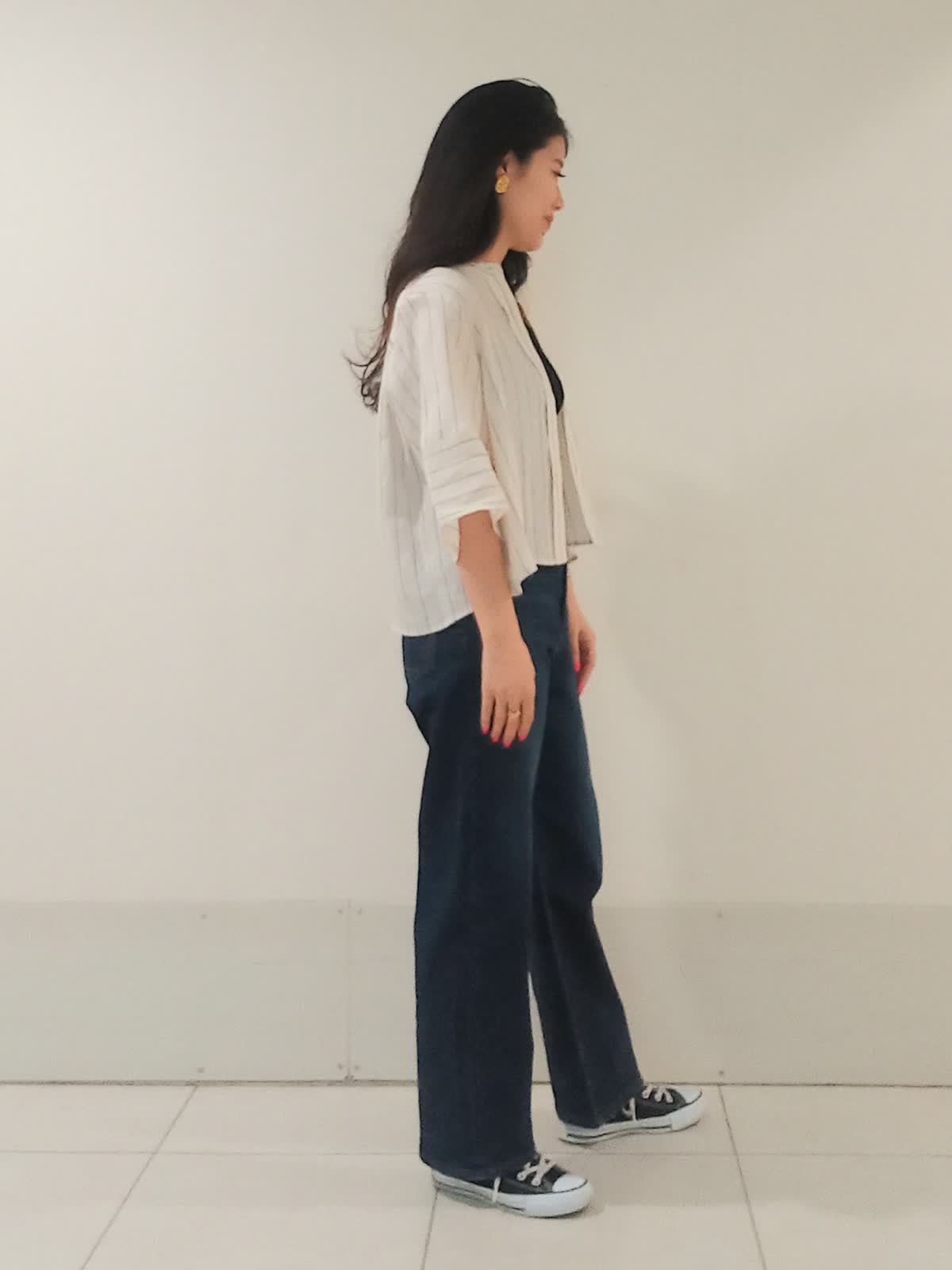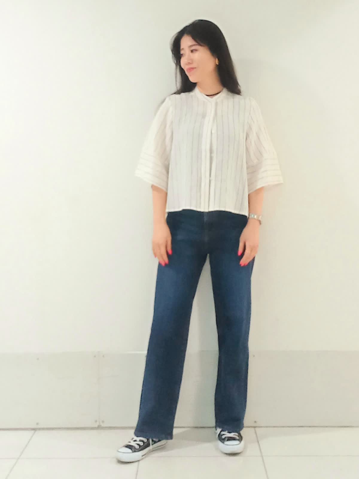 【着用サイズ、リネンブラウス9号、タンクトップ9号、デニム9号】 夏の日差し避けや冷房対策にも最適なリネンブラウス。袖のラインがゆったりしていて腕が細く見えるのもポイントです! ボタンを留めずに羽織ることでサイドにほどよいボリュームが出て、ウエストラインもスッキリ。 腰回りに丸みがありつつ裾に向かってスッキリ綺麗なシルエットのカーヴィーデニム。 深めの股上なので、スニーカーを合わせても脚長効果も抜群です。 これからの季節、アクティブなイベントコーディネートにピッタリです