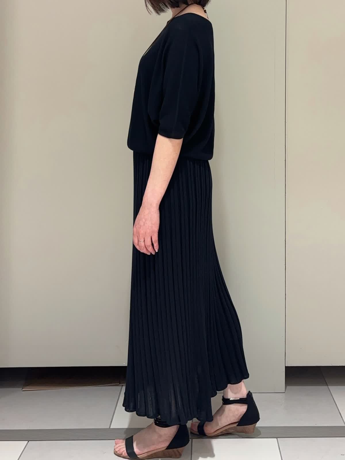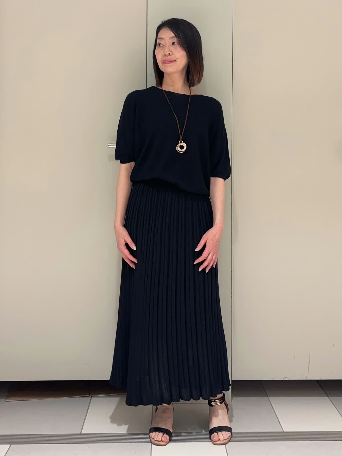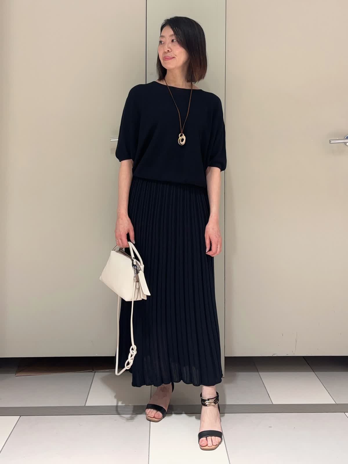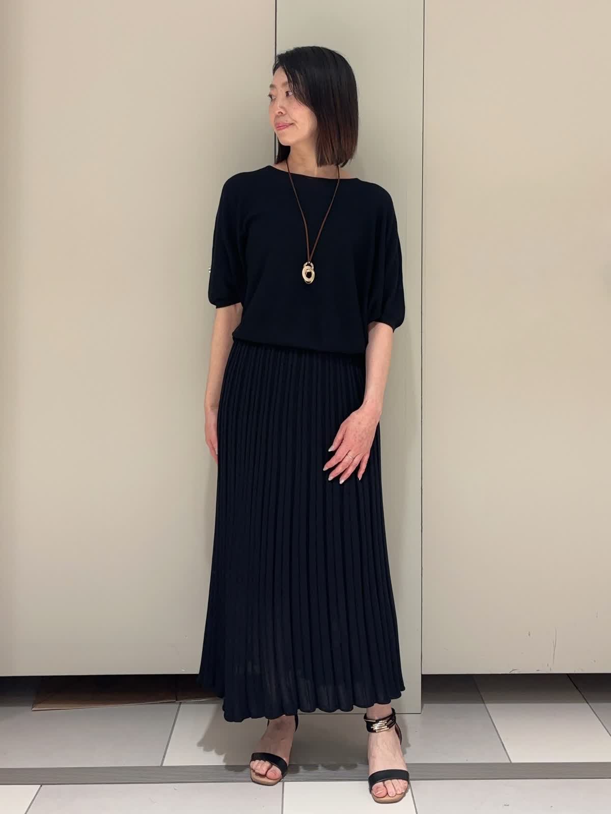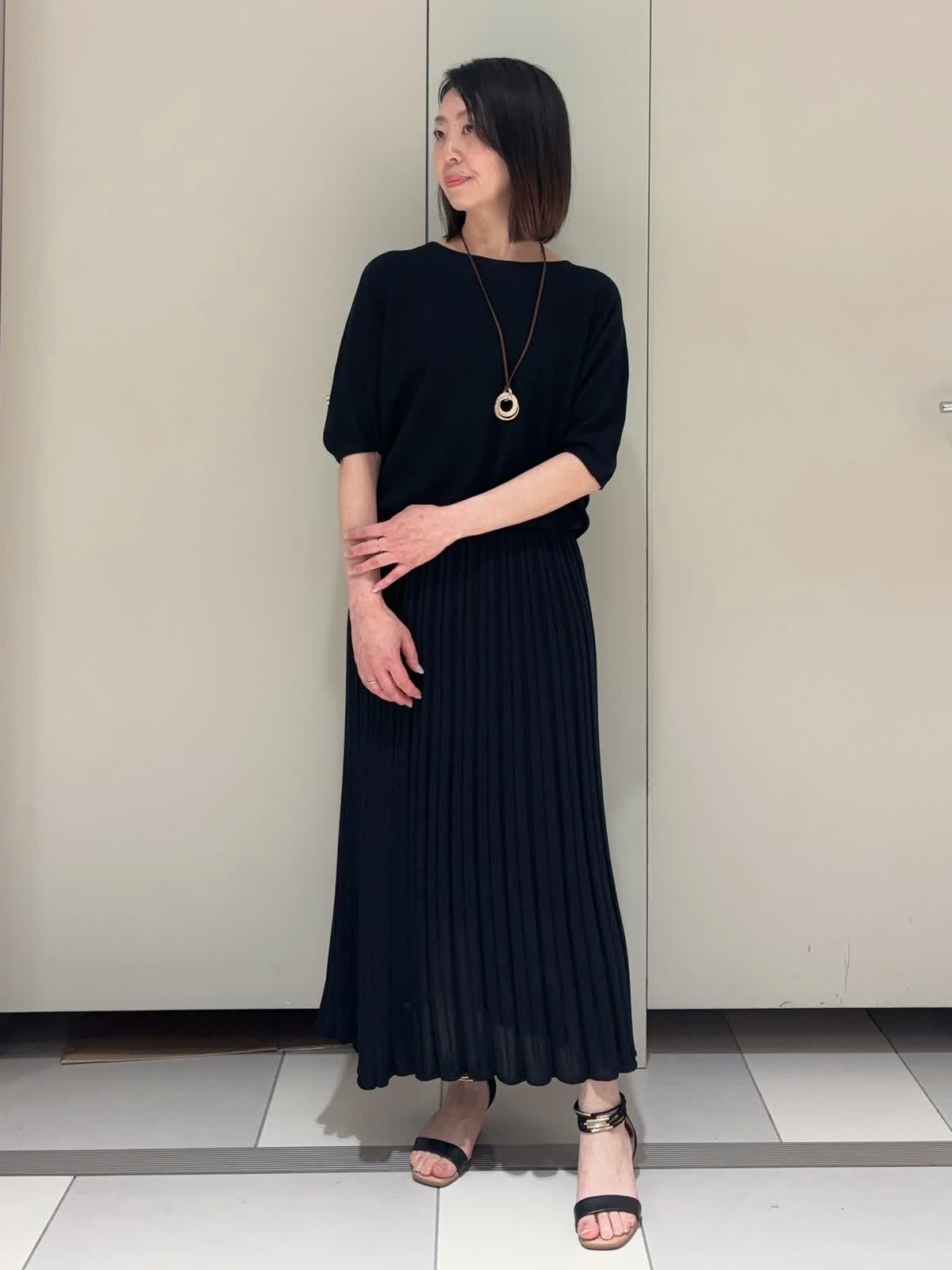 【着用サイズ】ニット:9号 スカート:9号 【着用カラー】ニット:ダークネイビー スカート:ダークネイビー ネックレス:ベージュ バッグ:オフホワイト 縫い目のないホールガーメントニットで快適な着心地。ゆとりのあるシルエットと程よい衿ぐりの開きが上品な印象できれいめスタイルに最適な一枚です。さらっとした素材感と五分袖で、これからの季節にもおすすめです。