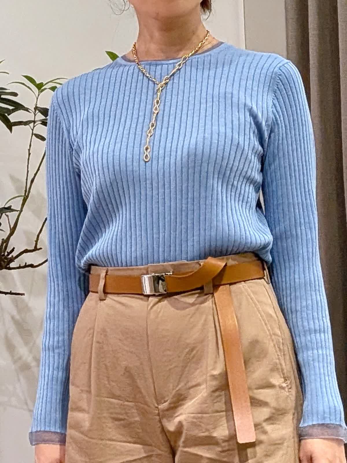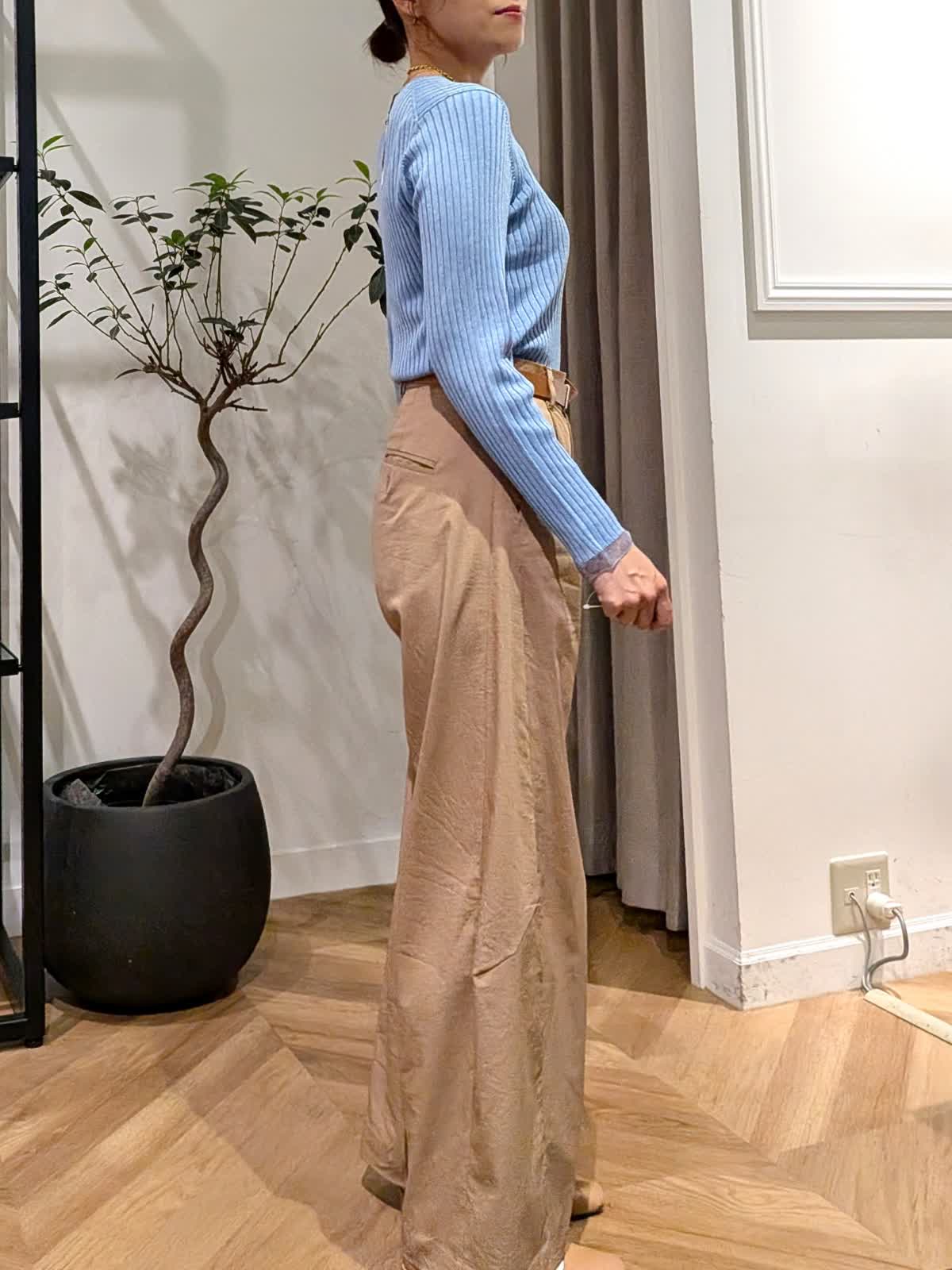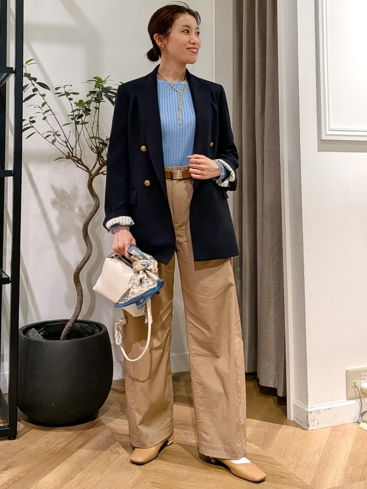 【着用サイズ】ジャケット?ネイビー?11号 ニット?ブルー?9号 パンツ?キャメル?9号 首元と手首のシアーデザインが素敵なリブニットはシルク混で上品な雰囲気に。 バレルパンツはバルーンのような丸みのあるシルエットが特徴。リアルバイしましたが細見えと好評です♪薄手で真夏まではけそうです。 シルエットが綺麗すぎるジャケットと合わせるのもおすすめ。厚手過ぎず長い期間着用いただけます。裏地は背中と袖とでカラーを変えておりお袖は折り返すとストライプがポイントに。