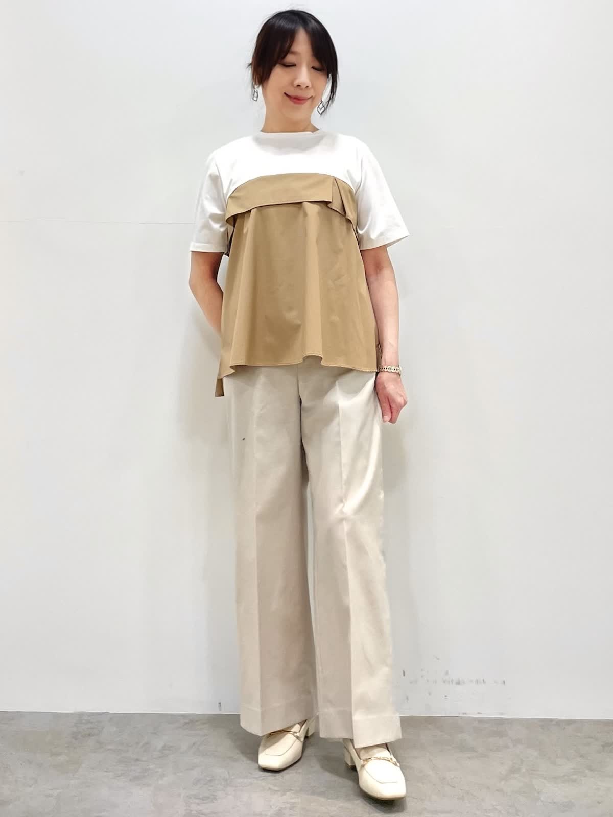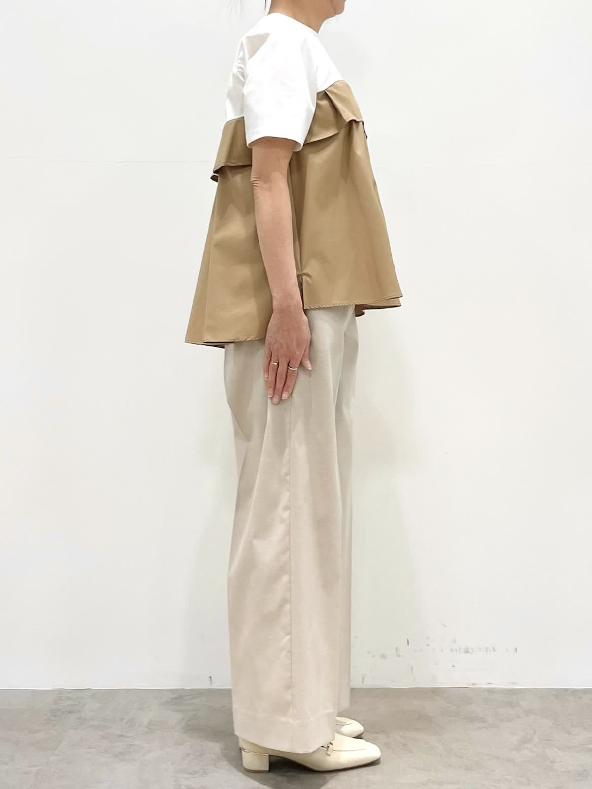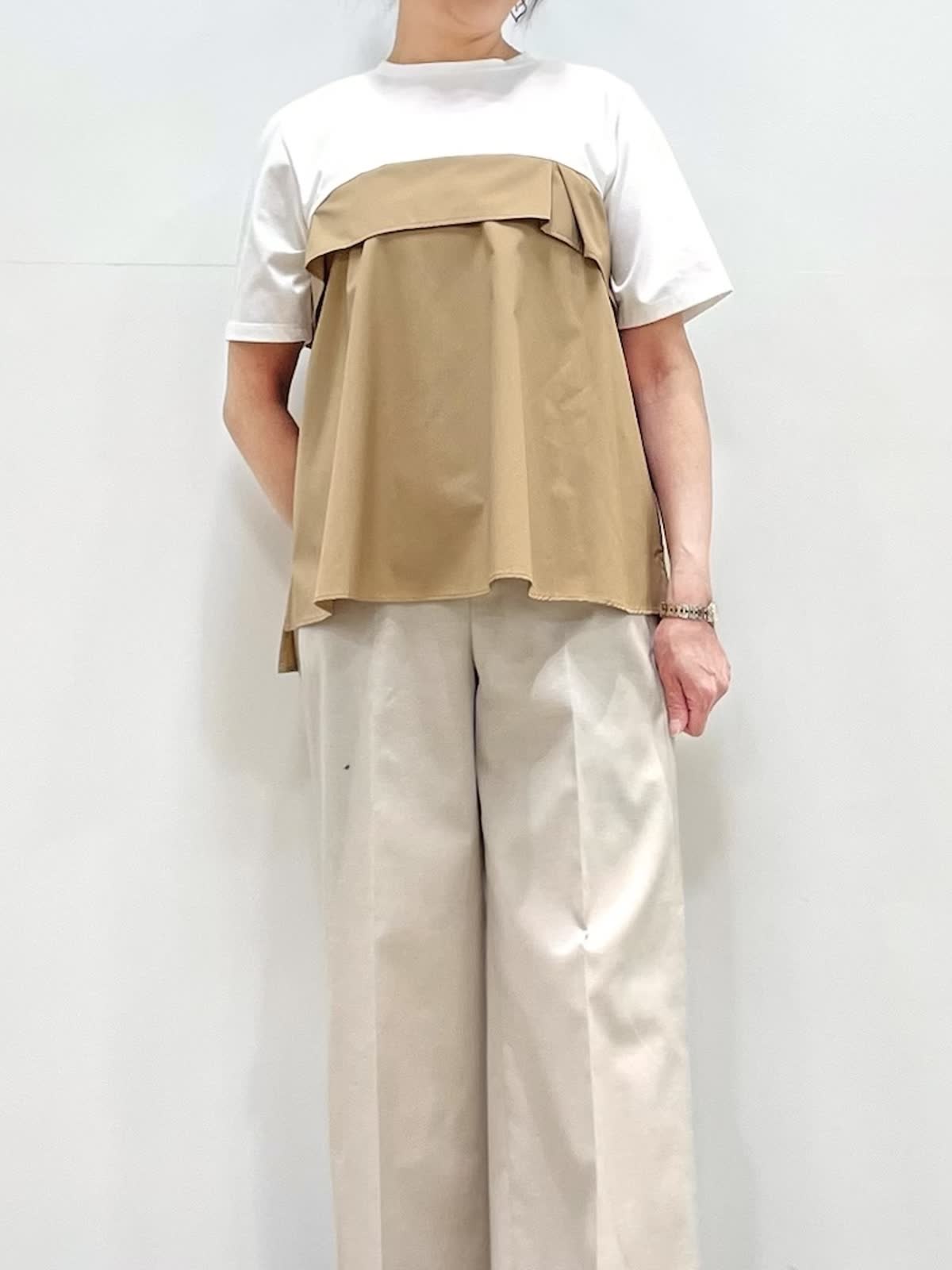 【着用サイズ】全て9号 【着用カラー】コート: ネイビー カットソー: ベージュ パンツ:ベージュ カジュアルになりすぎないキレイめなビスチェ風カットソー。異素材切り替えデザインで1枚でも着映えするおすすめアイテム。胸下からブラウス素材になってるので体に沿わず、ウエスト周りが安心です。ジャケットやカーディガンのインナーにも映えるデザインなので季節長く着用いただけます。