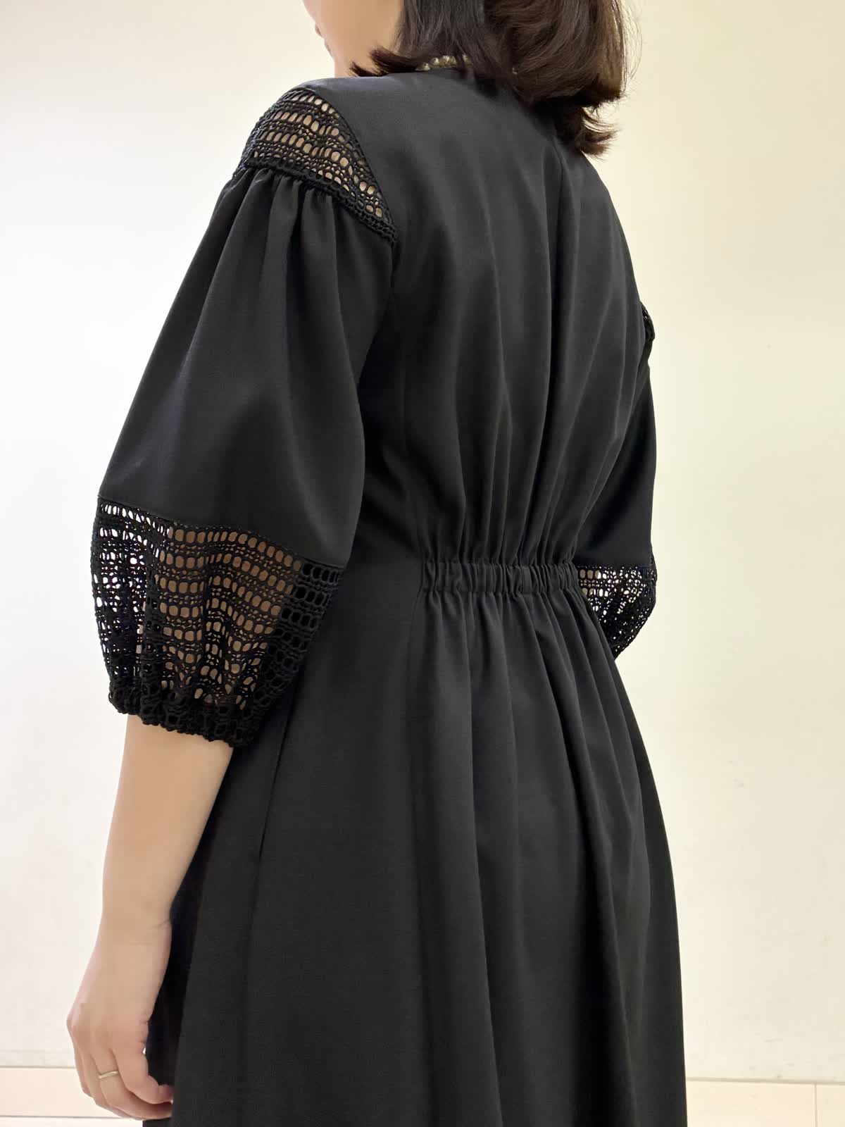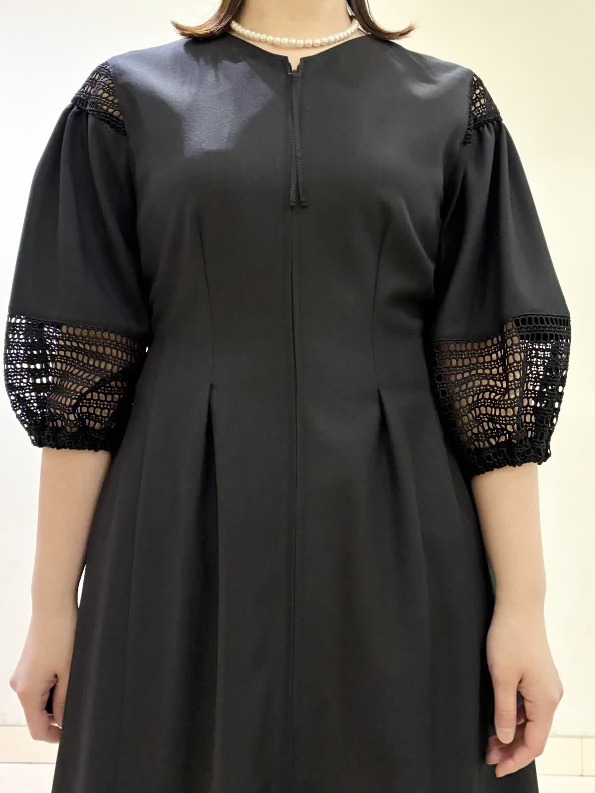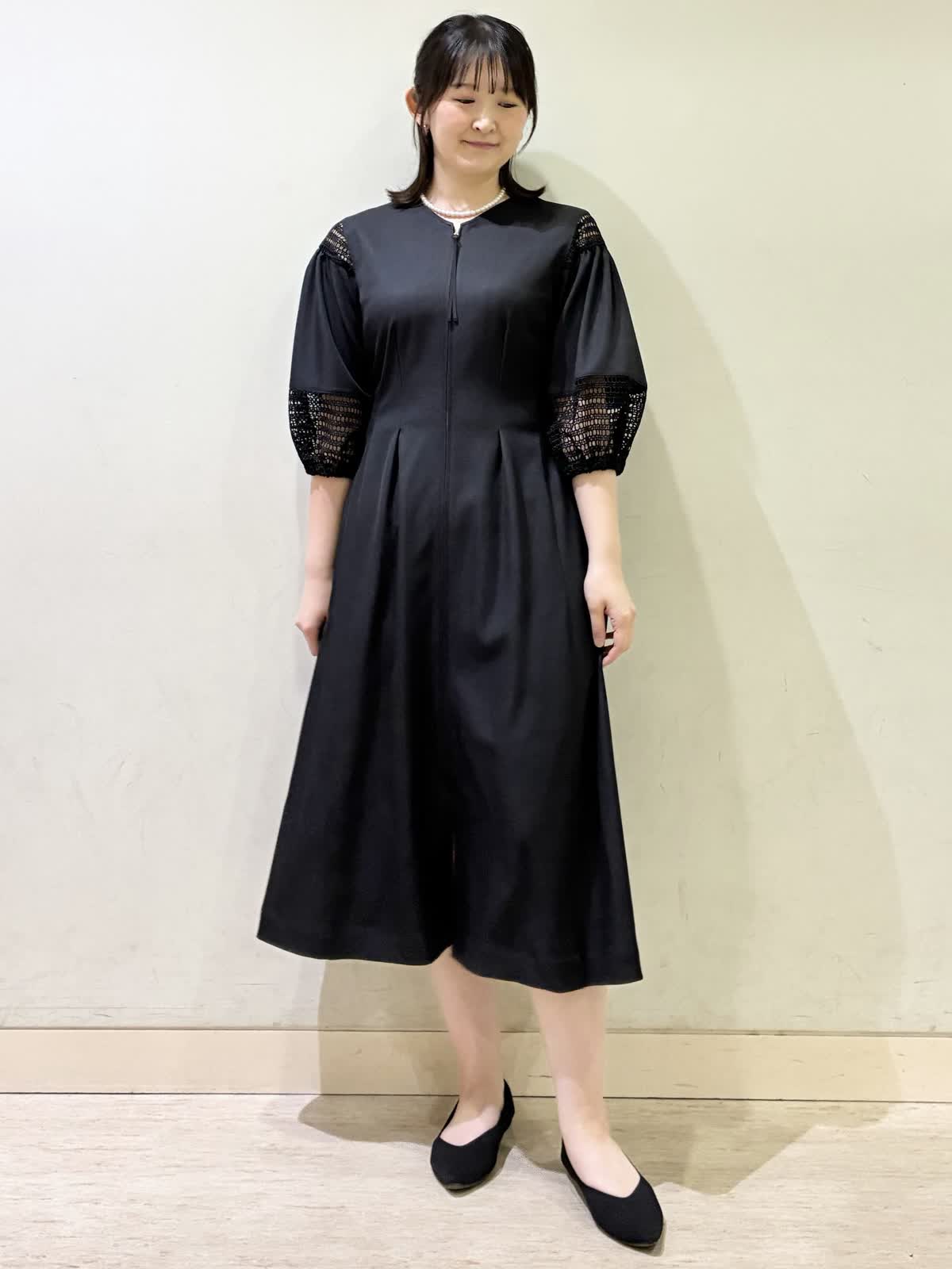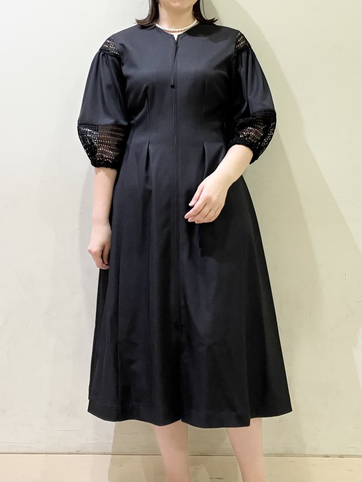 【着用カラー/サイズ】ワンピース:ブラック/フリー11号 お呼ばれや顔合わせに。 袖のさりげないシアー感がおしゃれな黒のワンピース。 メリハリのきいたウエストラインがスタイルが良く見えるポイント。素材は少し厚手です。シワになりにくいポリエステル、ポリウレタンなのでお手入れも安心です。ウエストの後ろがゴム仕様なので、着ていて締め付けがなく、着心地も楽です。脱ぎ着しやすいフロントファスナーです。
