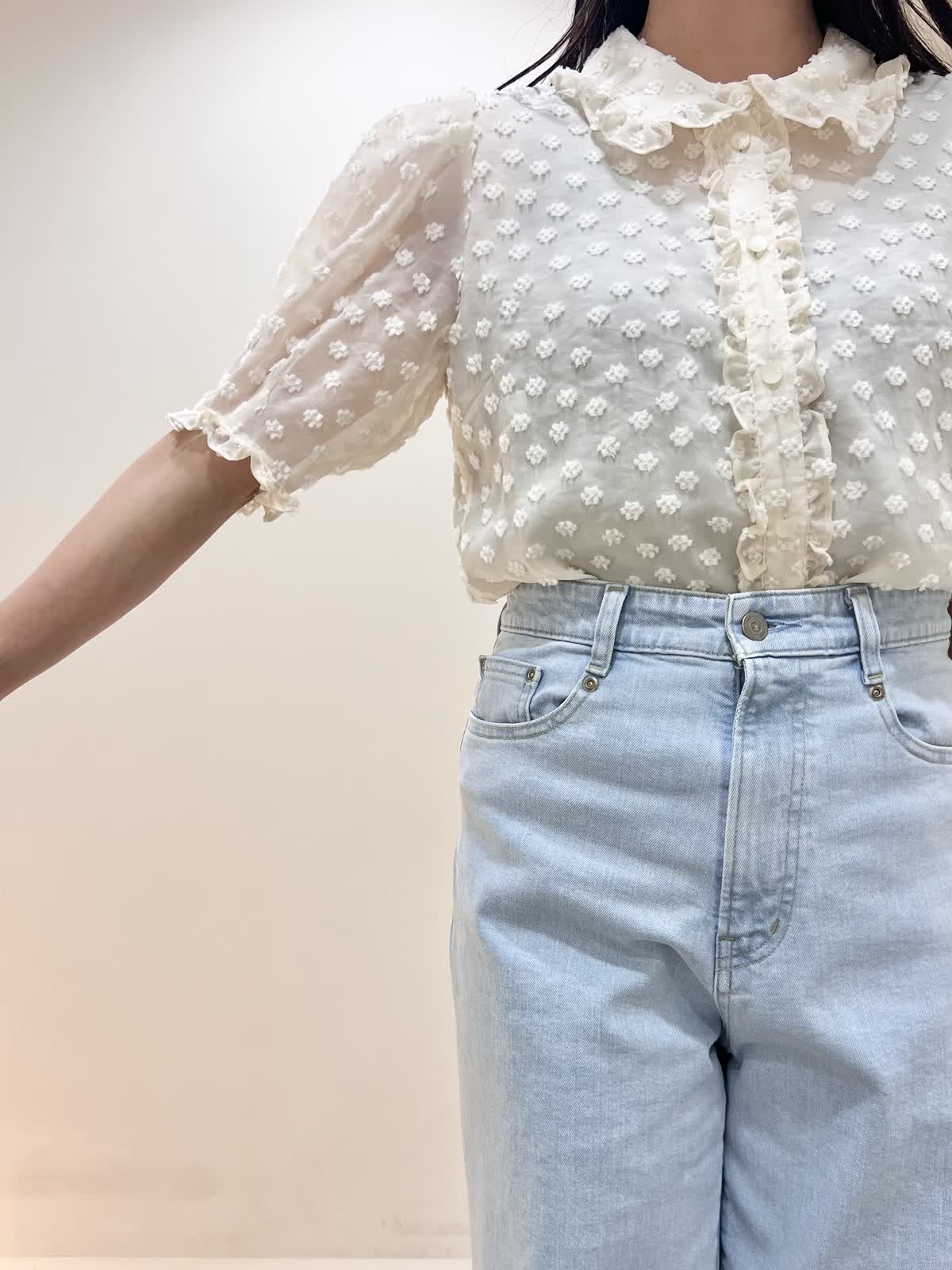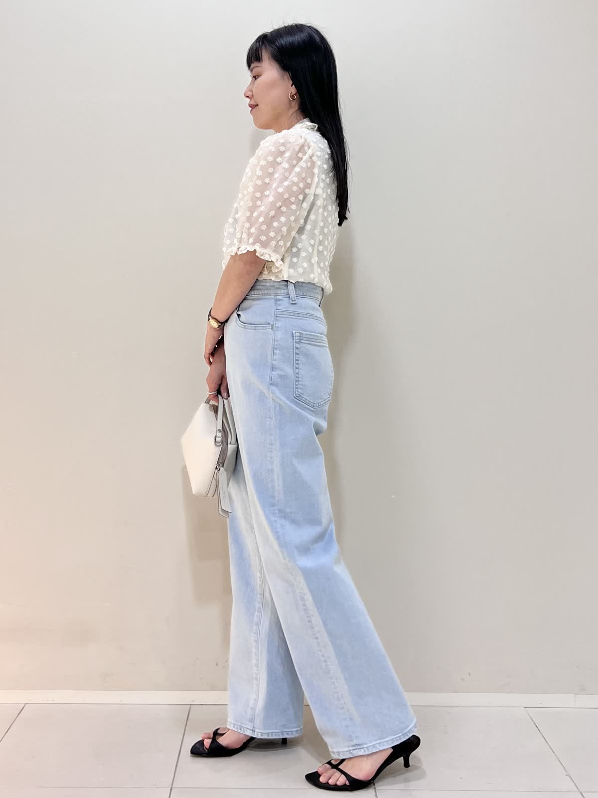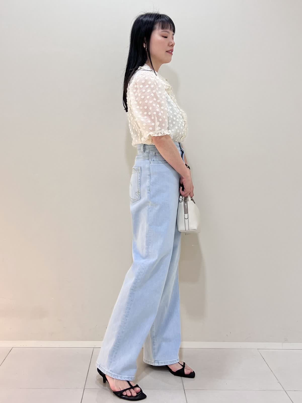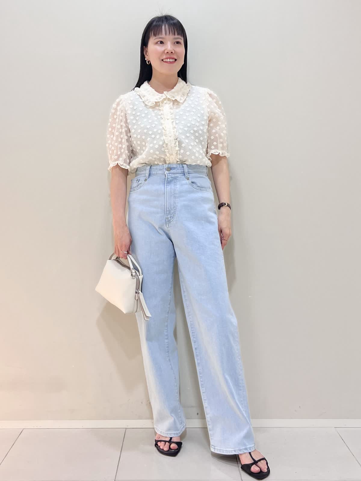 【着用サイズ/カラー】ブラウス:9号 オフホワイト デニム:7号 サックス バッグ:オフホワイト GWにもおすすめのお出かけコーデ。襟のついたきちんと感のあるブラウス。シアーで今からの暑い季節にぴったりのデザイン。デニムはハイウエストで腰位置が高く見えます。柔らかくて履きやすいです。合わせたサンダルのヒールは約5cmです。