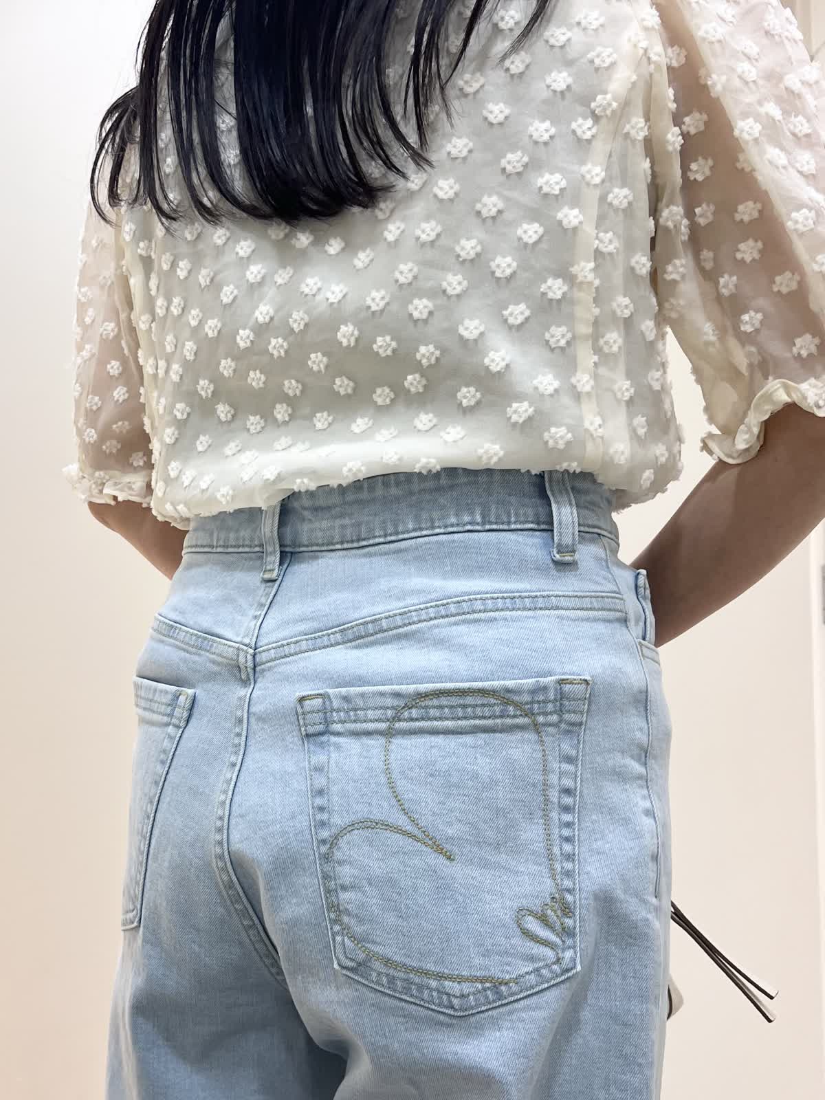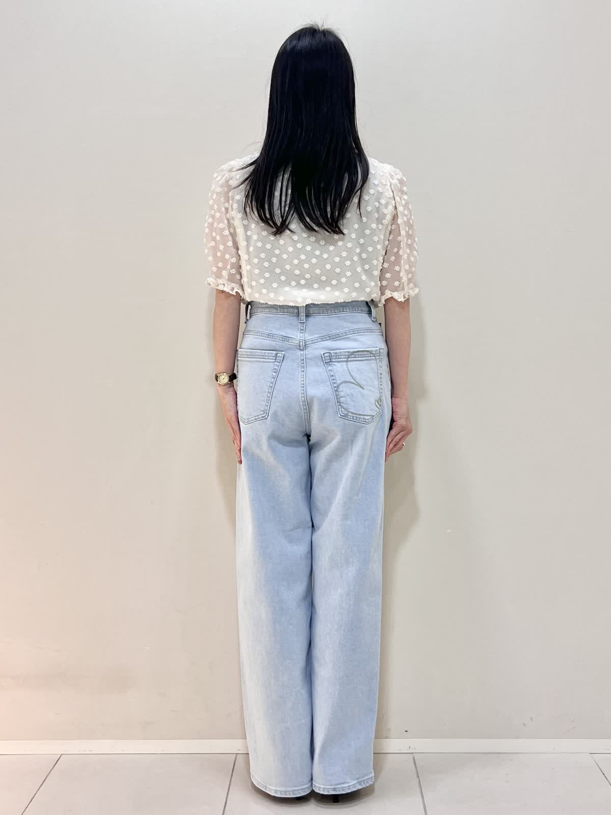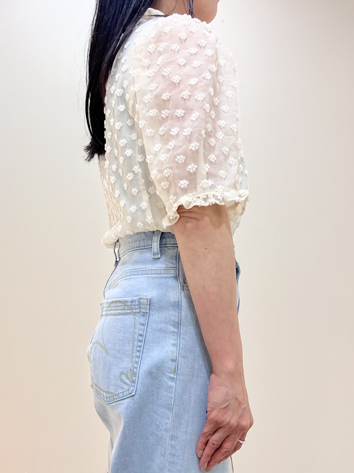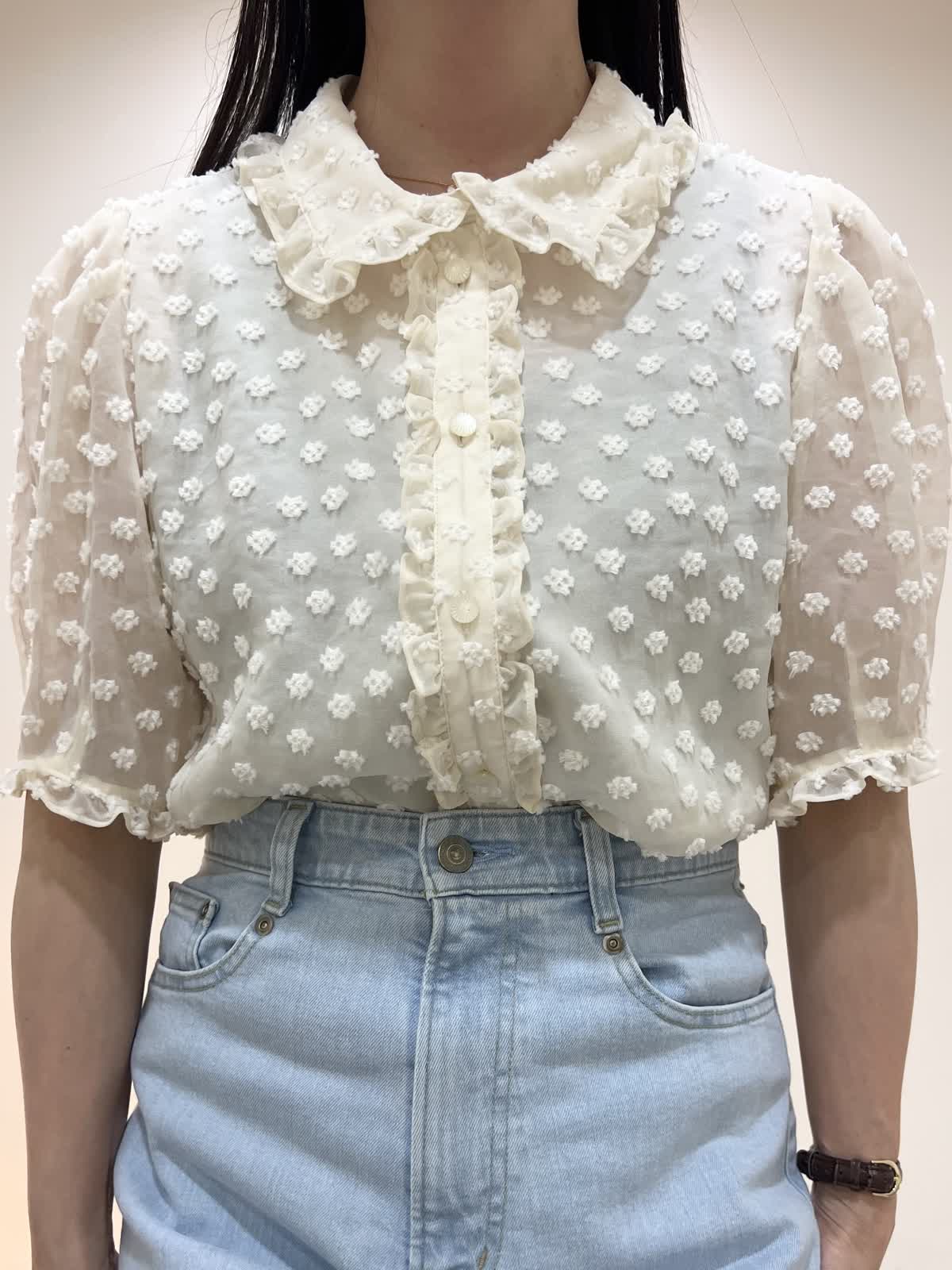 【着用サイズ/カラー】ブラウス:9号 オフホワイト デニム:7号 サックス バッグ:オフホワイト GWにもおすすめのお出かけコーデ。襟のついたきちんと感のあるブラウス。シアーで今からの暑い季節にぴったりのデザイン。デニムはハイウエストで腰位置が高く見えます。柔らかくて履きやすいです。合わせたサンダルのヒールは約5cmです。