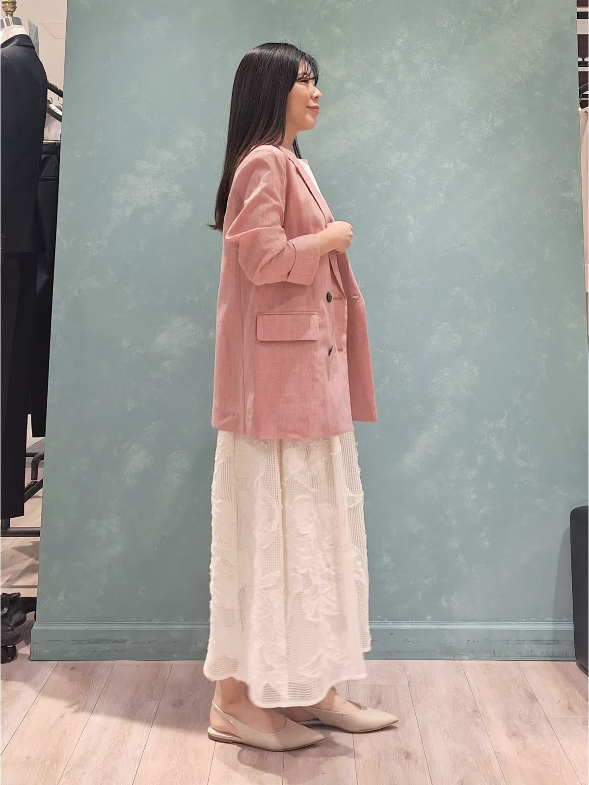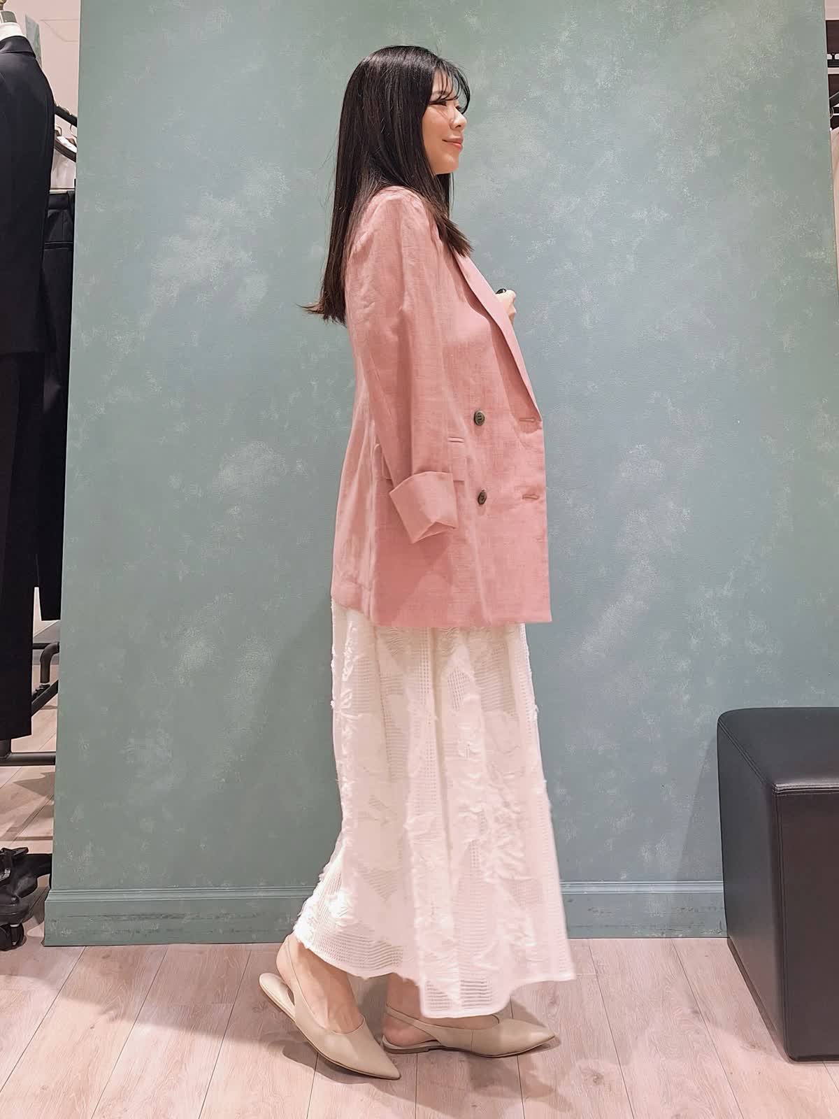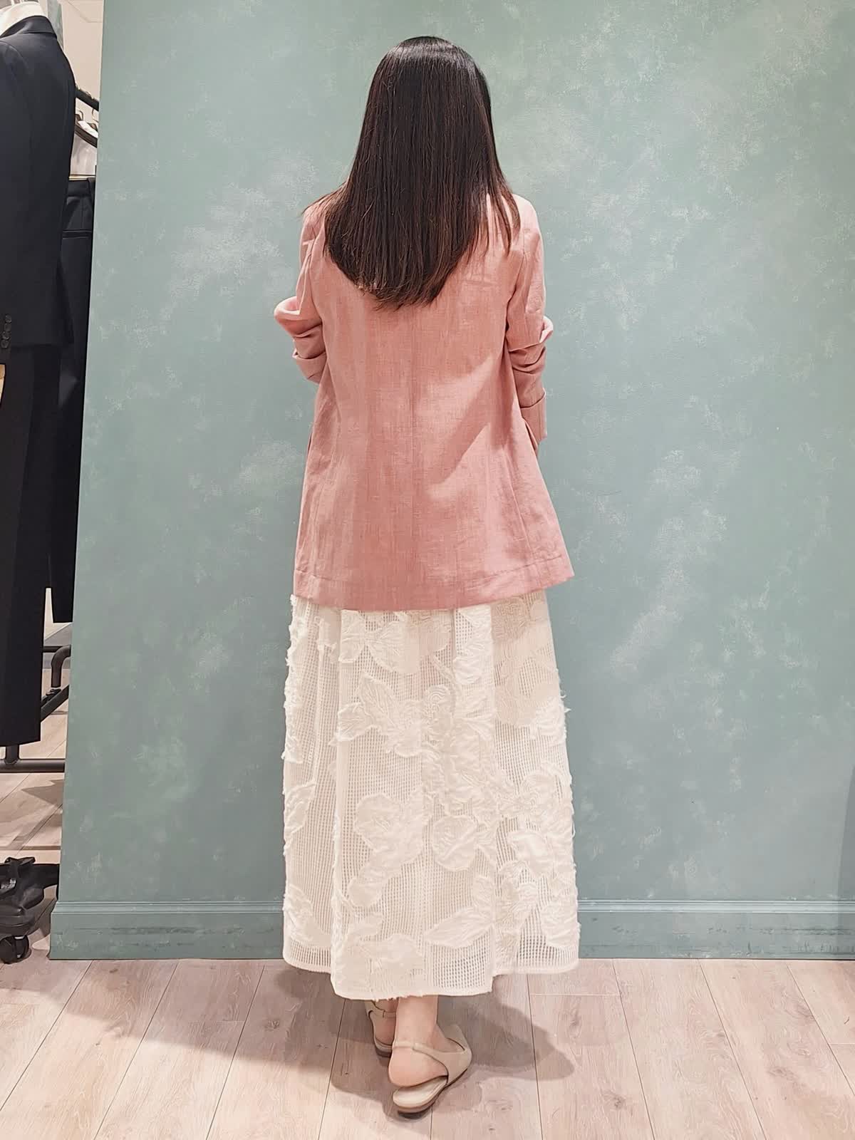 【着用サイズ、カラー】ジャケット:7号、ピンク ワンピース:9号、アイボリー リネンの風合いが春夏らしいダブルブレストジャケット。今シーズントレンドのピンクで、オシャレ格上げ!裏地無しでシャツ感覚、夏まで活躍するアイテムです。異素材ドッキングワンピース。肩にかかるお袖丈で露出感は控えめ。フィット&フレアラインでスタイルUPが叶います♪スカート部分はメッシュ生地に同色のフラワー刺繍が施されていて派手すぎずオシャレ?ホテルランチやお洒落カフェ、美術館巡りなどにお勧めのコーディネートです。