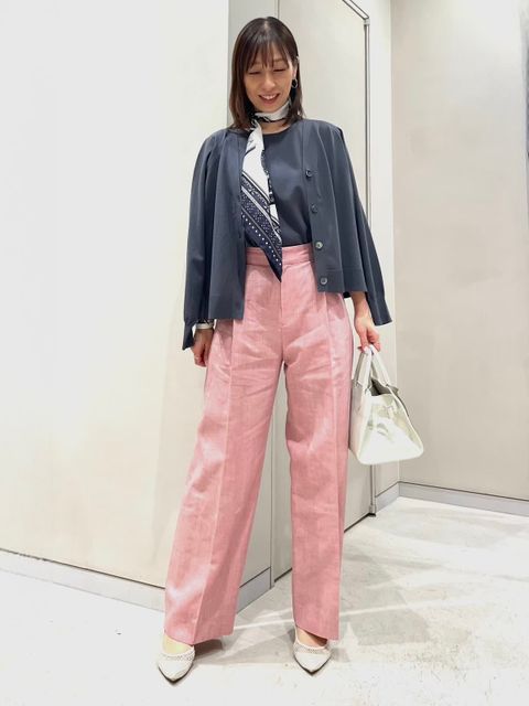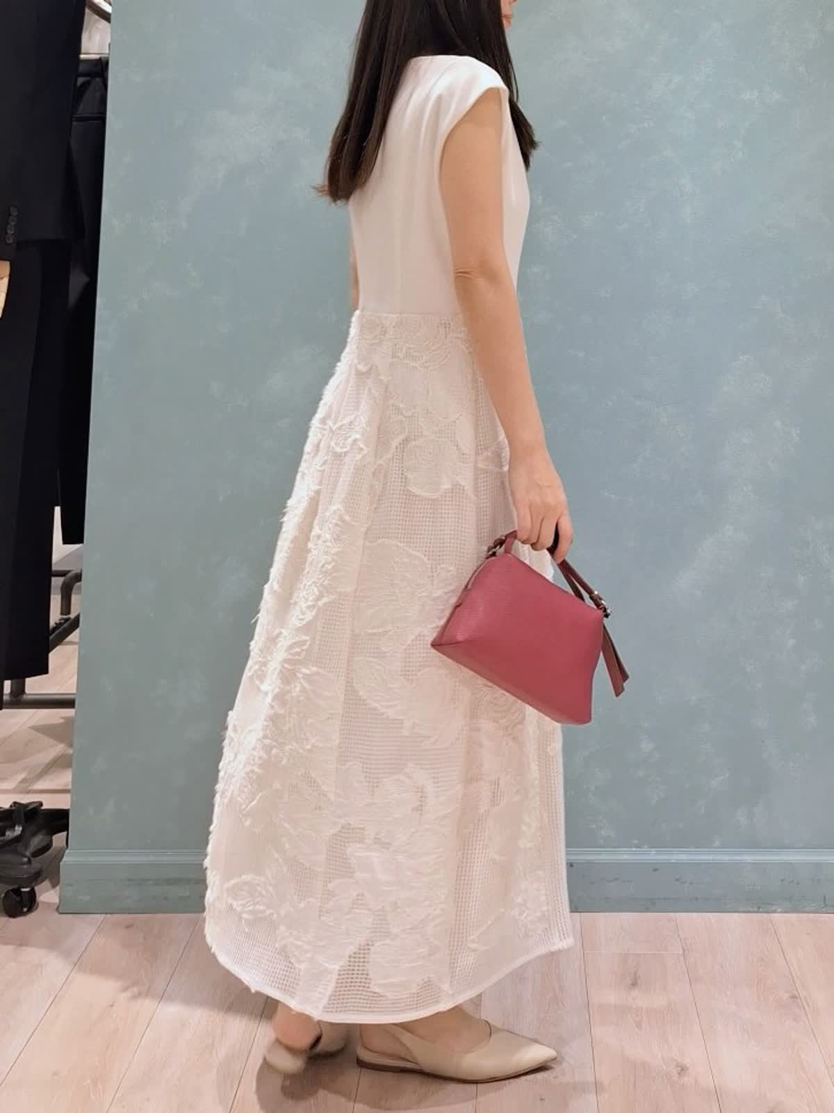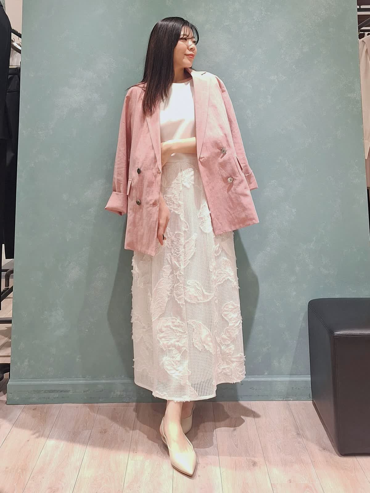 【着用サイズ、カラー】ジャケット:7号、ピンク ワンピース:9号、アイボリー リネンの風合いが春夏らしいダブルブレストジャケット。今シーズントレンドのピンクで、オシャレ格上げ!裏地無しでシャツ感覚、夏まで活躍するアイテムです。異素材ドッキングワンピース。肩にかかるお袖丈で露出感は控えめ。フィット&フレアラインでスタイルUPが叶います♪スカート部分はメッシュ生地に同色のフラワー刺繍が施されていて派手すぎずオシャレ?ホテルランチやお洒落カフェ、美術館巡りなどにお勧めのコーディネートです。