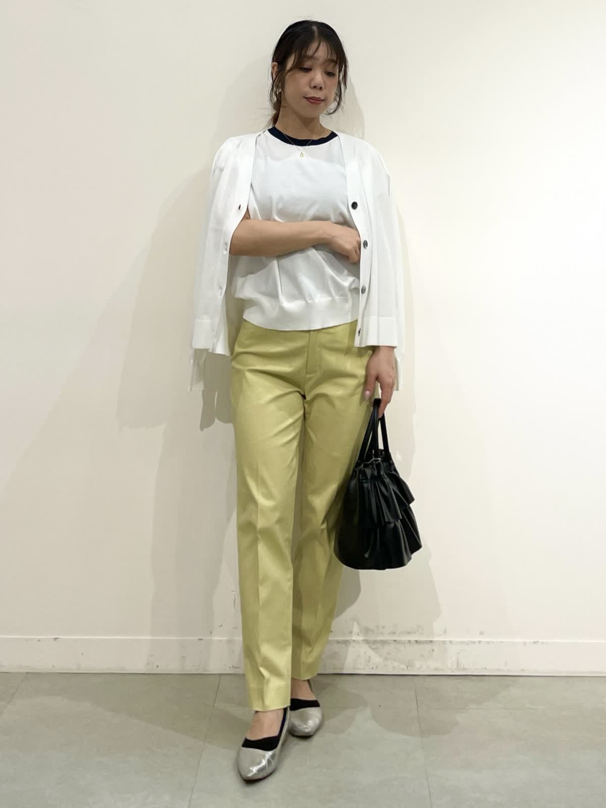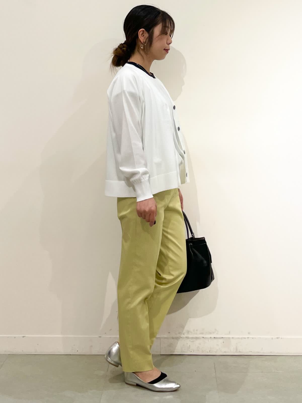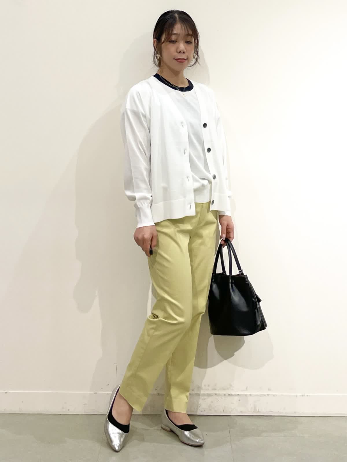 【着用サイズ】ニット:9号/カーディガン:9号/パンツ:5号 ニット・カーディガン:オフホワイト/パンツ:イエロー 休日にも活躍する、綺麗め×スポーティーなスタイリングでお仕事コーデ。アンサンブルとしているニットは清涼感があり、サラッと快適です。ネックラインがポイントでして、カラーパンツ映えアンサンブルです。