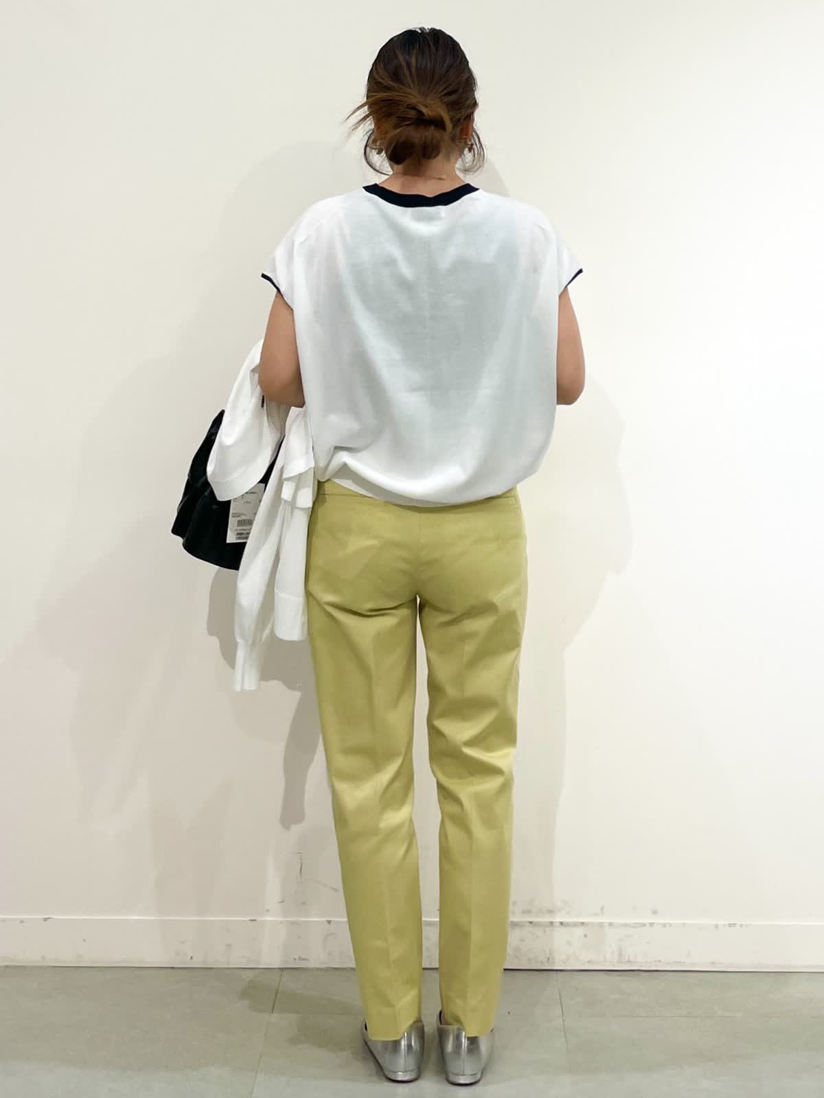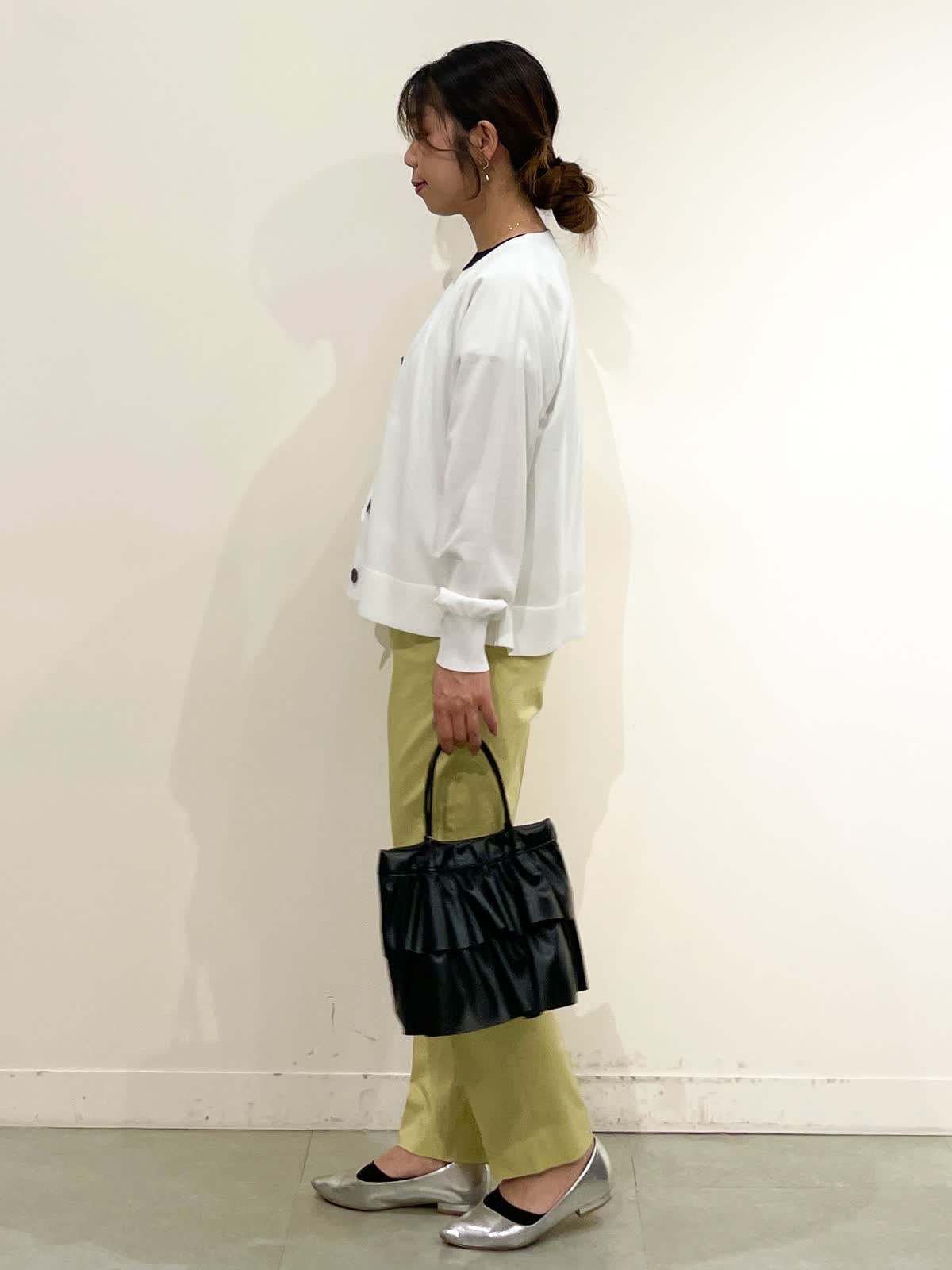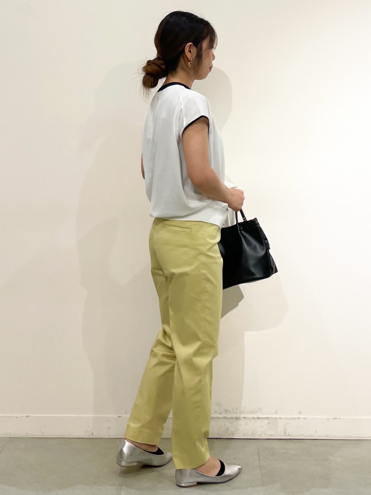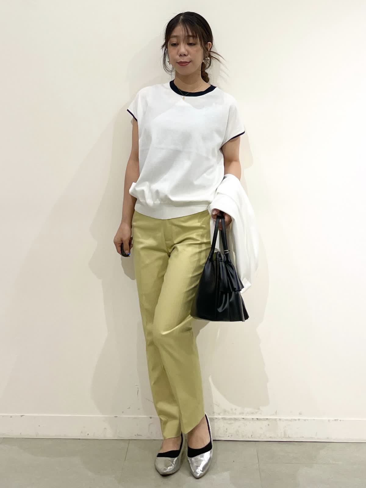 【着用サイズ】ニット:9号/カーディガン:9号/パンツ:5号 ニット・カーディガン:オフホワイト/パンツ:イエロー 休日にも活躍する、綺麗め×スポーティーなスタイリングでお仕事コーデ。アンサンブルとしているニットは清涼感があり、サラッと快適です。ネックラインがポイントでして、カラーパンツ映えアンサンブルです。