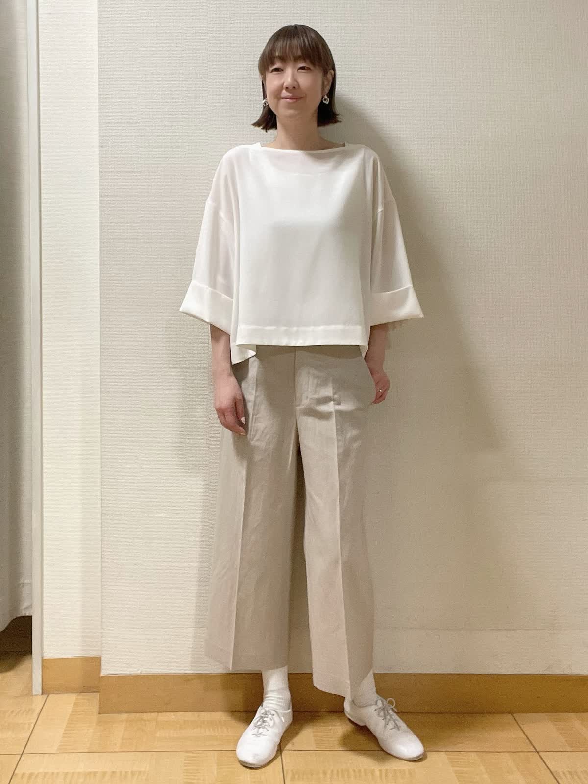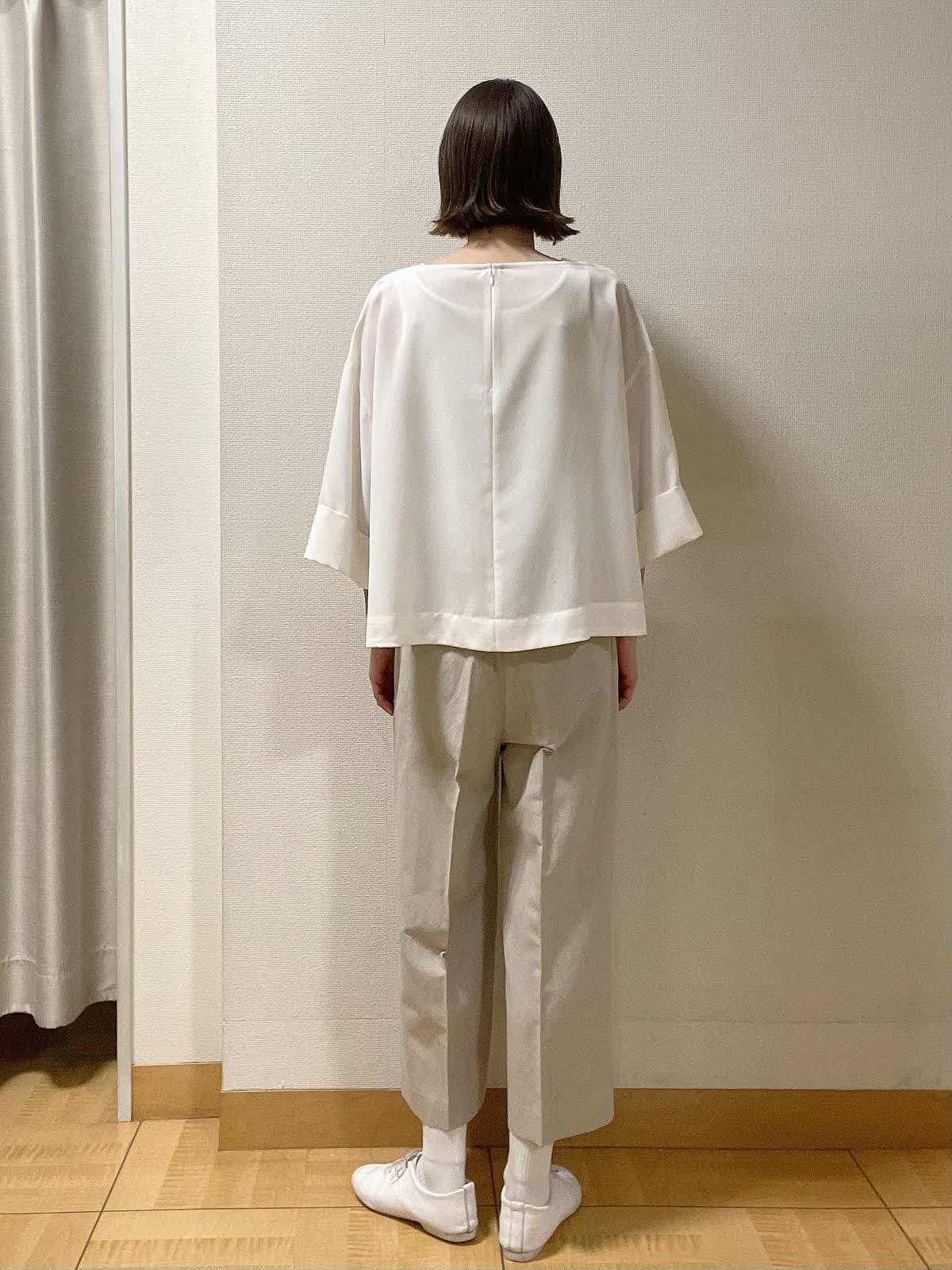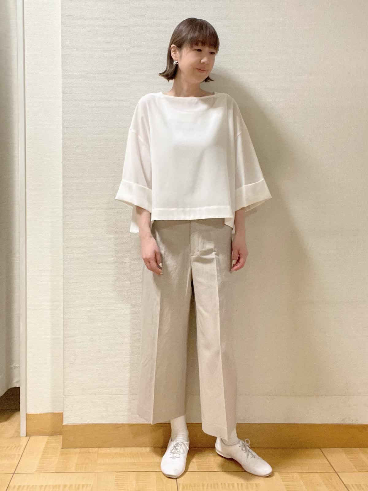 【着用サイズ】ブラウス:フリー インナーカットソー、パンツ共に9号 【着用カラー】ブラウス:オフホワイト インナーカットソー:ホワイトパンツ:ベージュ サラサラした生地で着心地の良いブラウス。程よい着丈とゆとり感がスタイルアップを叶えてくれます。これからのシーズン色違いで欲しいアイテムでおすすめ!
