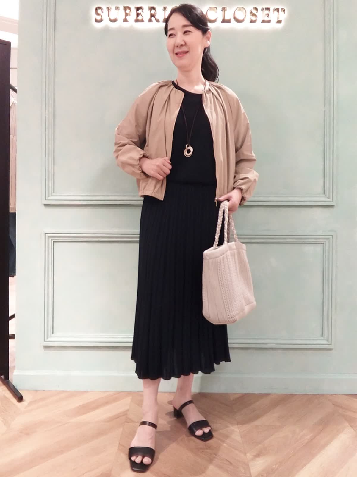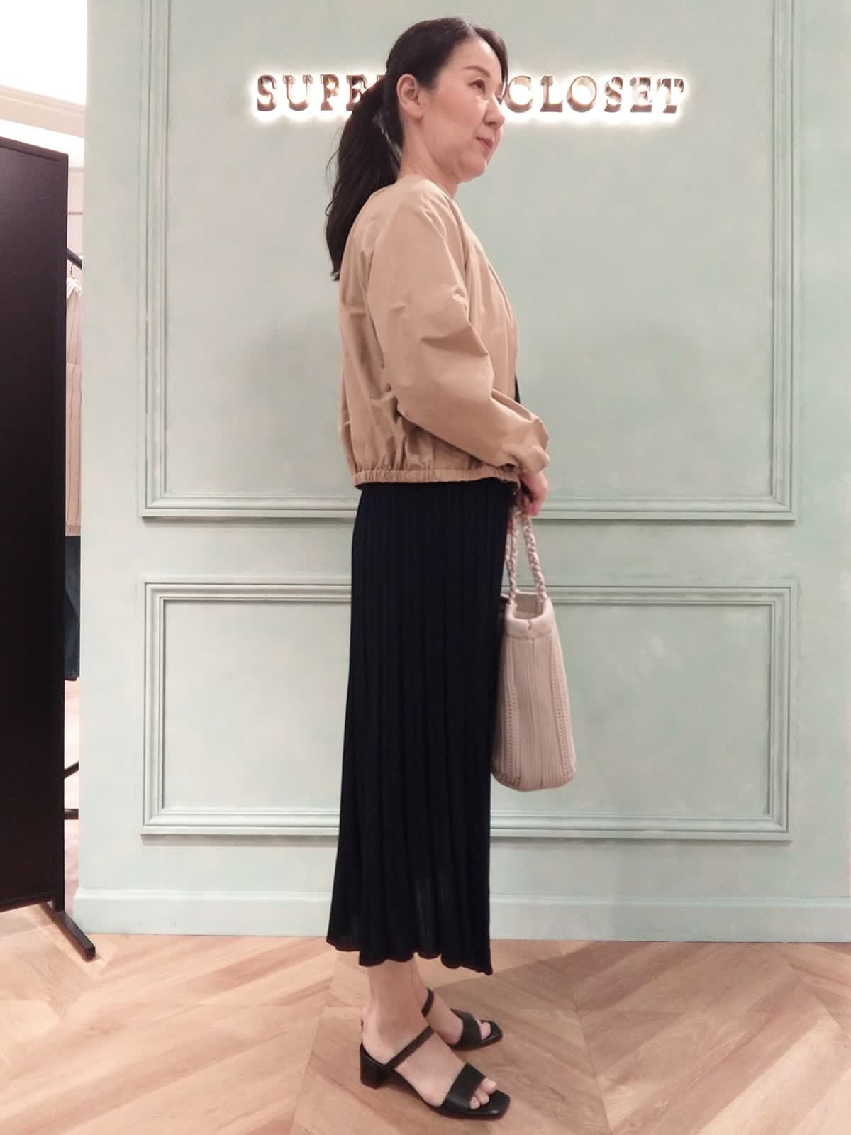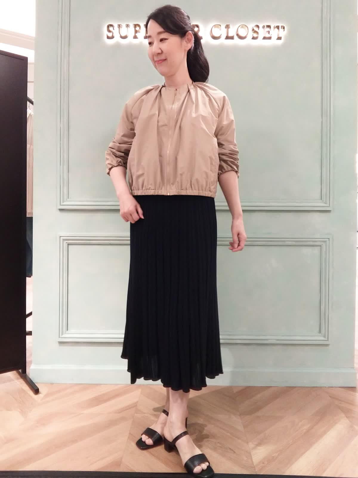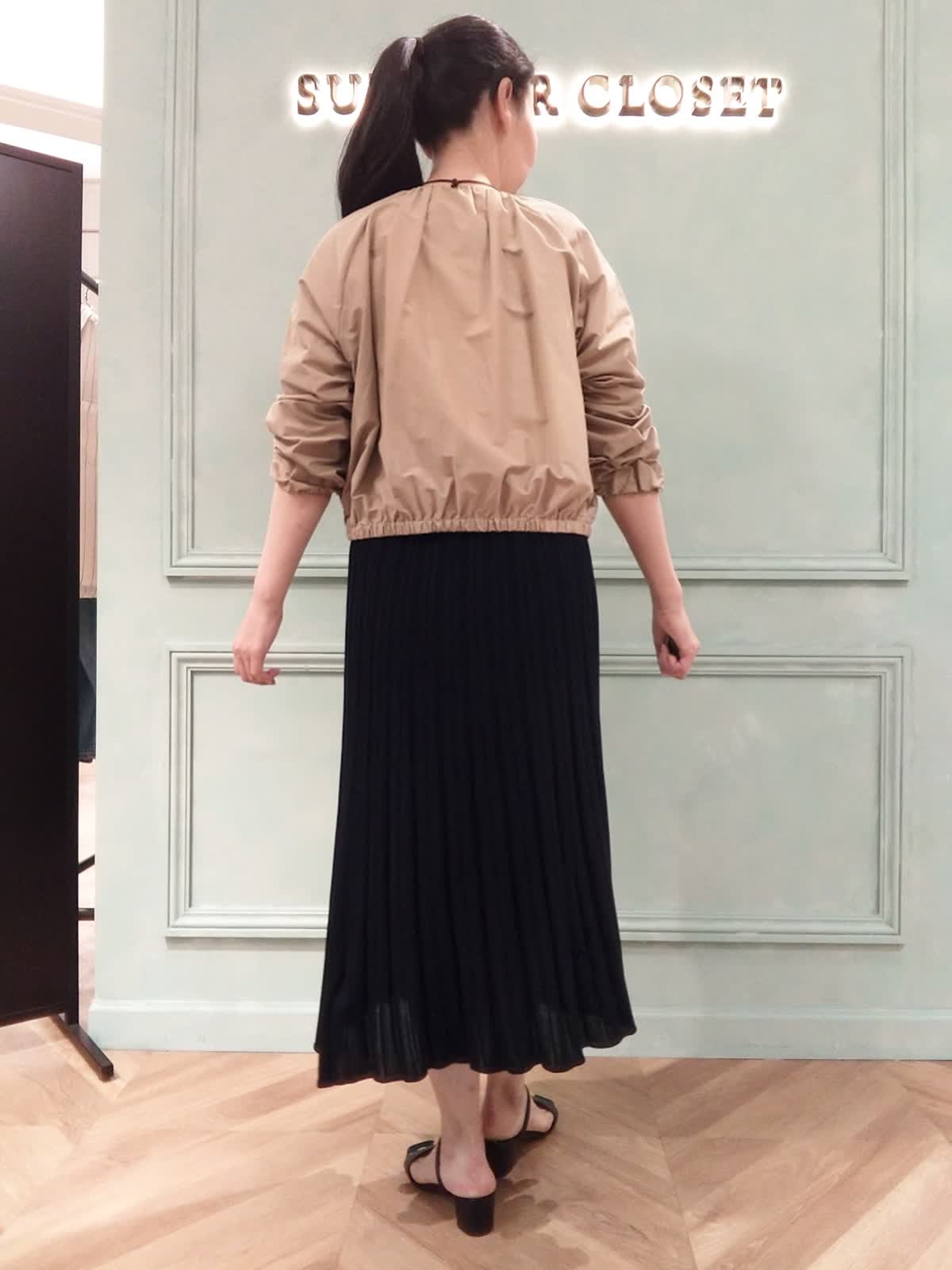 【着用サイズ】ジャケット:9号、ニット:9号、スカート:9号 【着用カラー】ジャケット:ベージュ、ニット:ダークネイビー、スカート:ダークネイビー お出かけランチスタイル。軽羽織りのキャザーブルゾンと着心地らくちんキレイ見えのニットセットアップでコーディネート。ふんわり袖のブルゾンは袖口にゴムが入っているので、キュッと上げてスッキリシルエットに!ドルマンニットとプリーツ風スカートで落ち感があり広がらずストンと落ちるシルエットになります。ウエストはゴムは無しの自然に体に沿う締め付け感のない着心地です。
