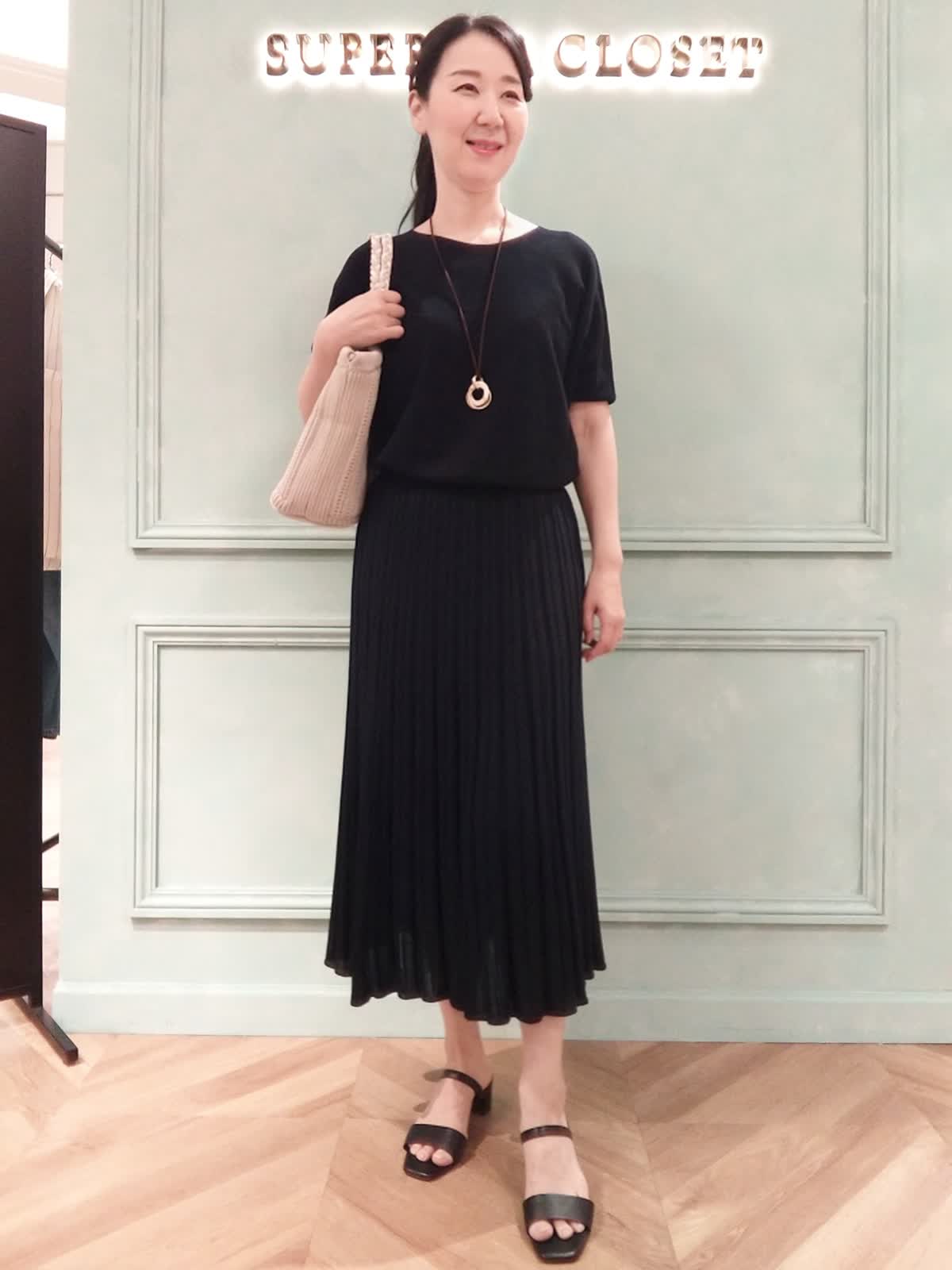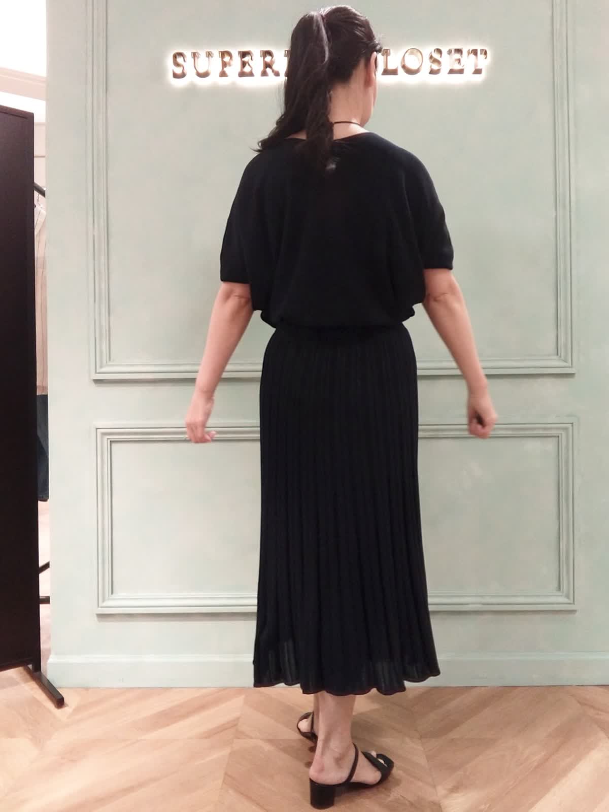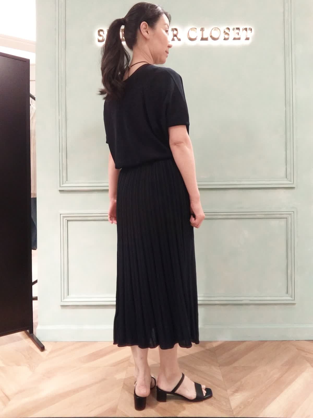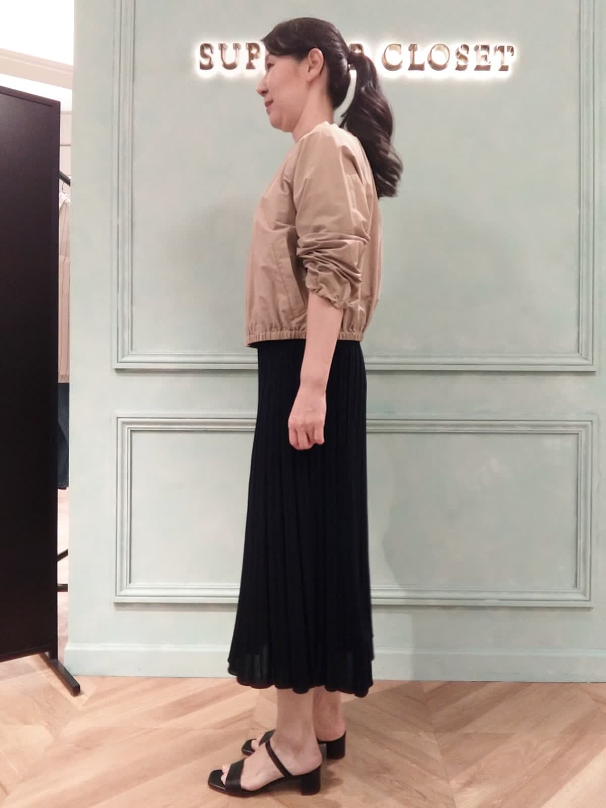 【着用サイズ】ジャケット:9号、ニット:9号、スカート:9号 【着用カラー】ジャケット:ベージュ、ニット:ダークネイビー、スカート:ダークネイビー お出かけランチスタイル。軽羽織りのキャザーブルゾンと着心地らくちんキレイ見えのニットセットアップでコーディネート。ふんわり袖のブルゾンは袖口にゴムが入っているので、キュッと上げてスッキリシルエットに!ドルマンニットとプリーツ風スカートで落ち感があり広がらずストンと落ちるシルエットになります。ウエストはゴムは無しの自然に体に沿う締め付け感のない着心地です。