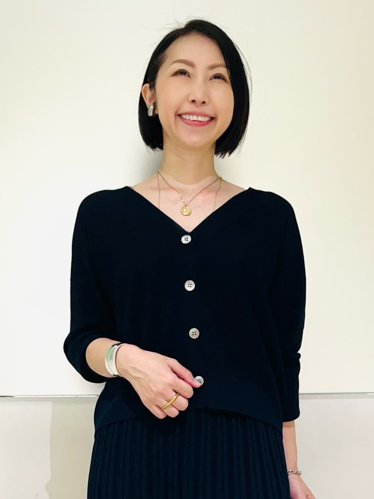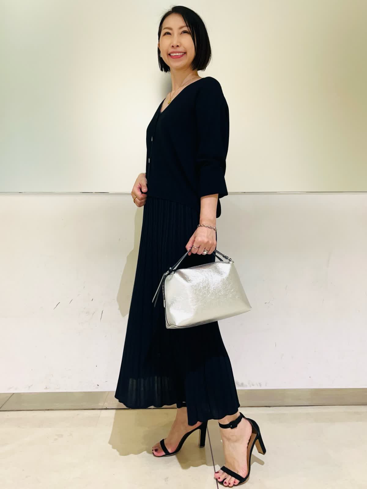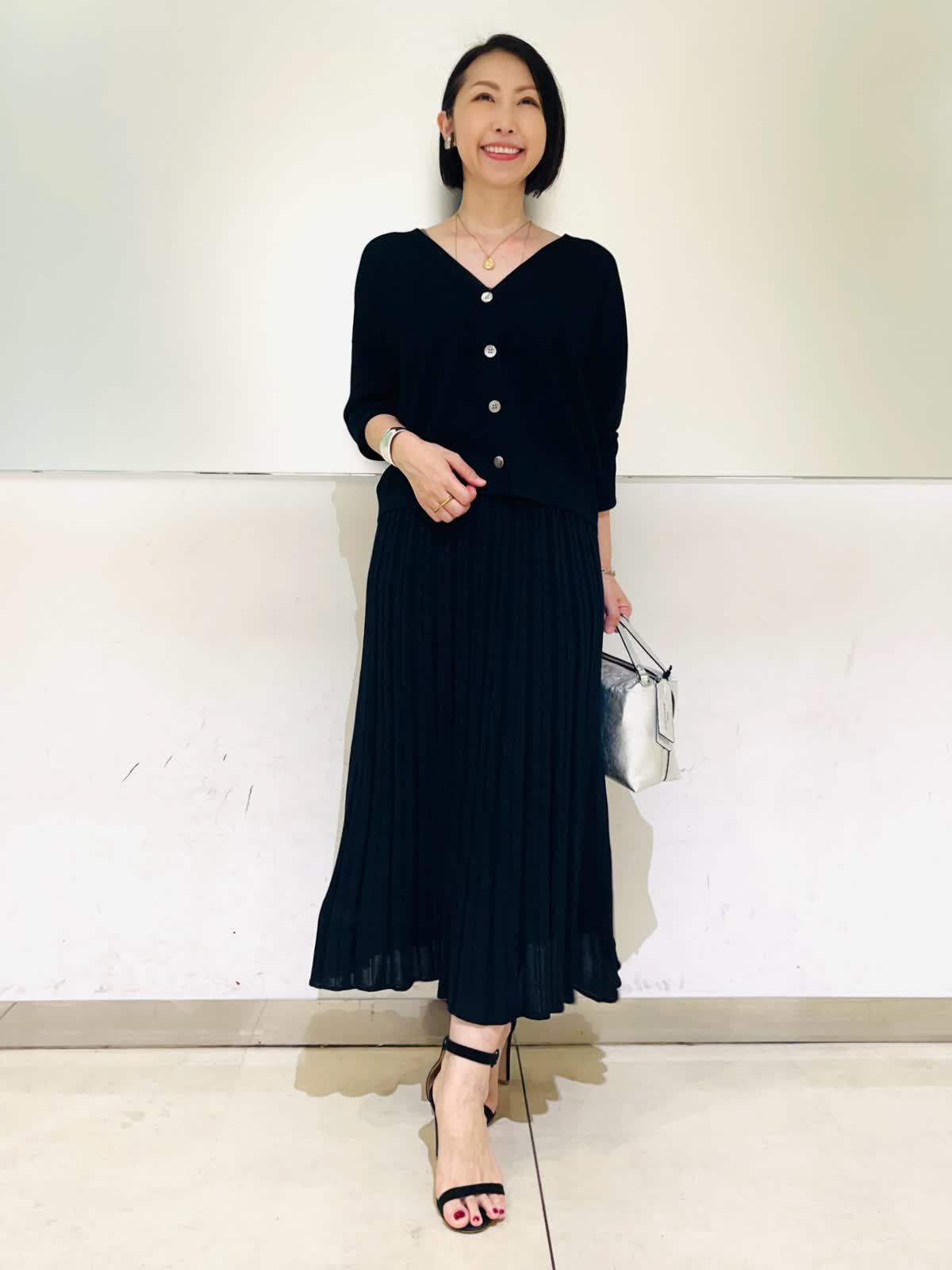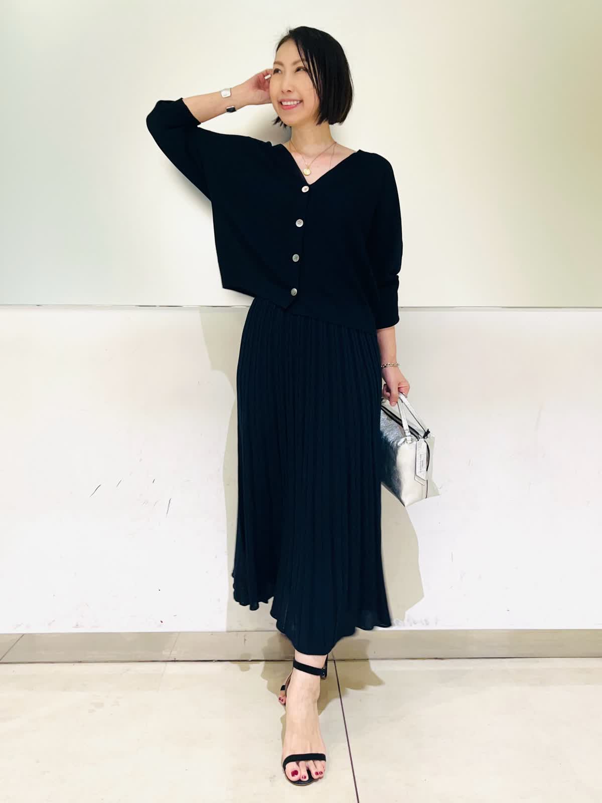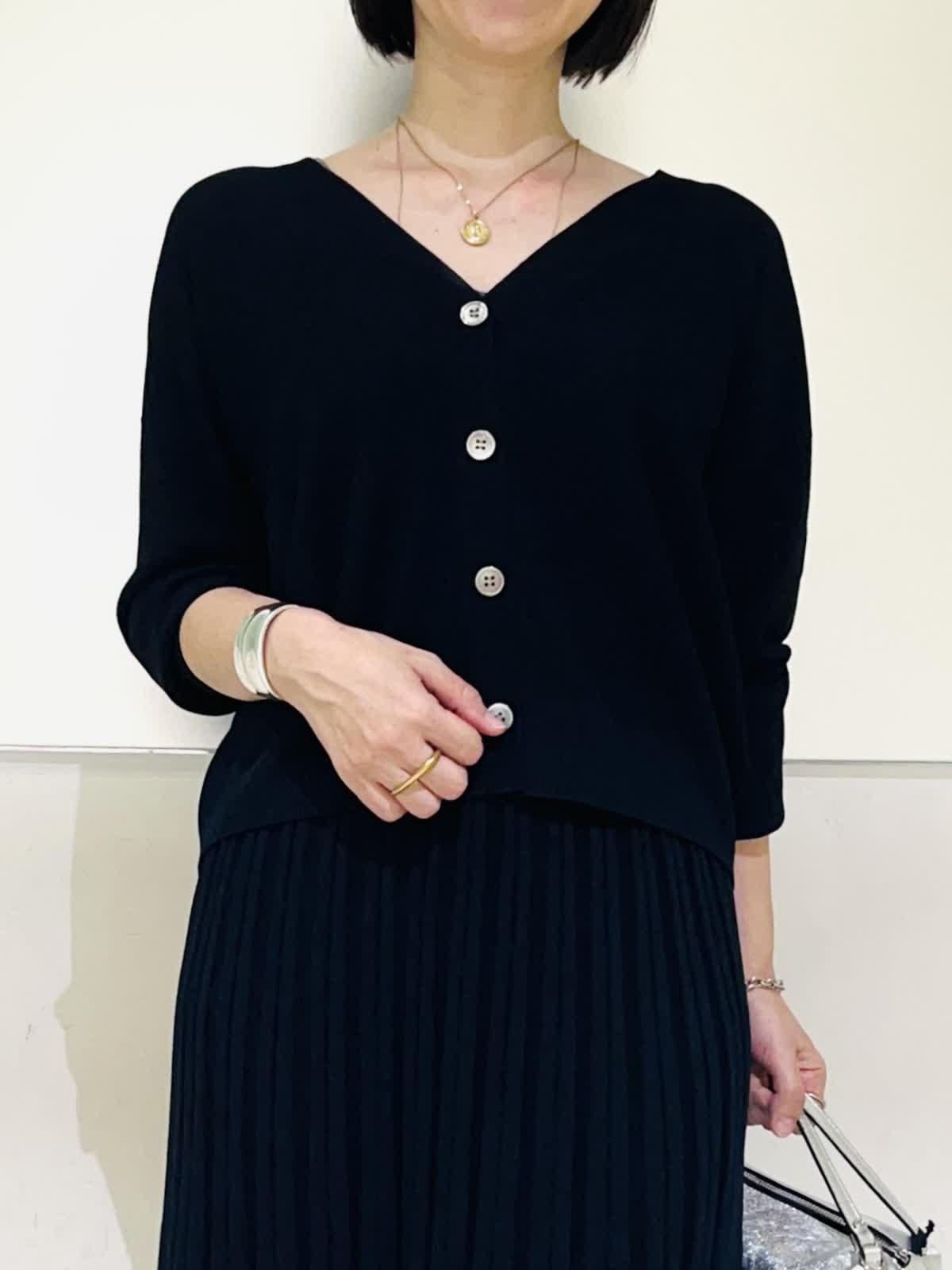 【着用アイテム/カラー】カーディガン、スカート:9号/ネイビー 毎年大人気のキュプラ混ニット。今回はスカートもあるので2ピースで着られます。トップスはVネックカーディガンをボタンを閉じてプルオーバー風に。デコルテがきれいに見える開きですっきりして見えます。プリーツ仕立てのスカートはウエストがゴムなので楽ちんな履き心地。きちんと見えするのにストレスフリーな着心地です。