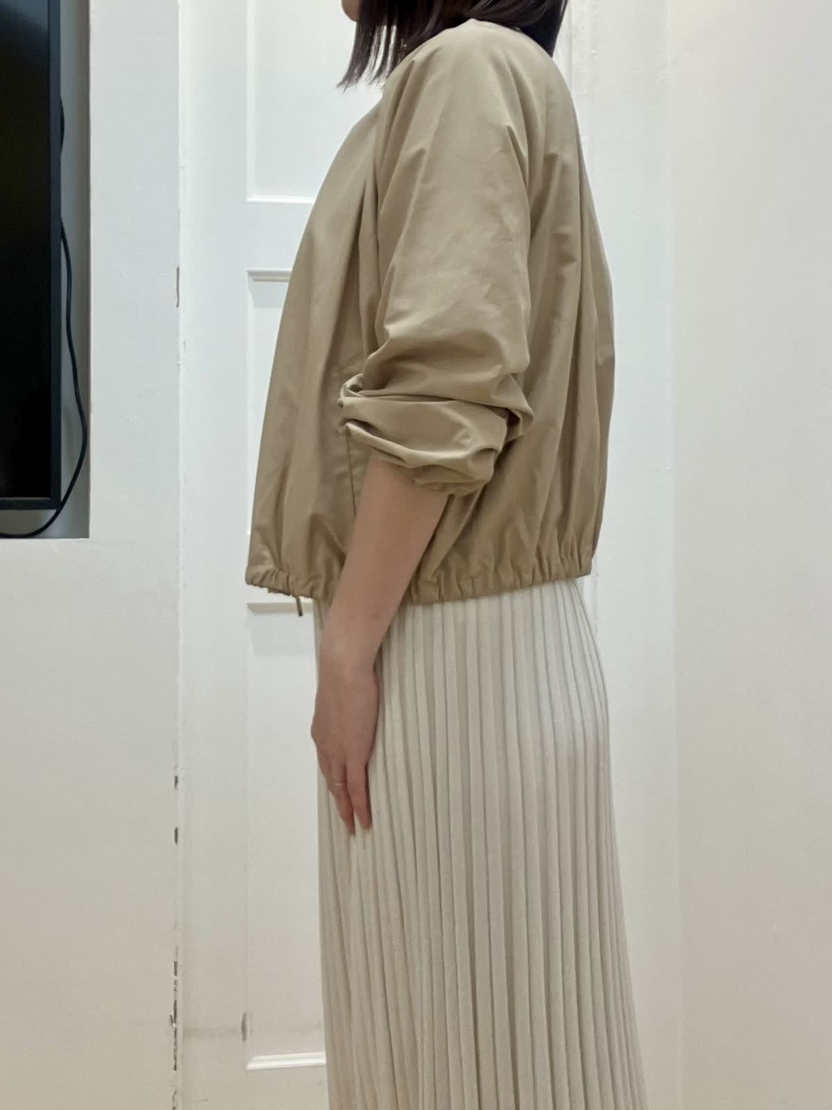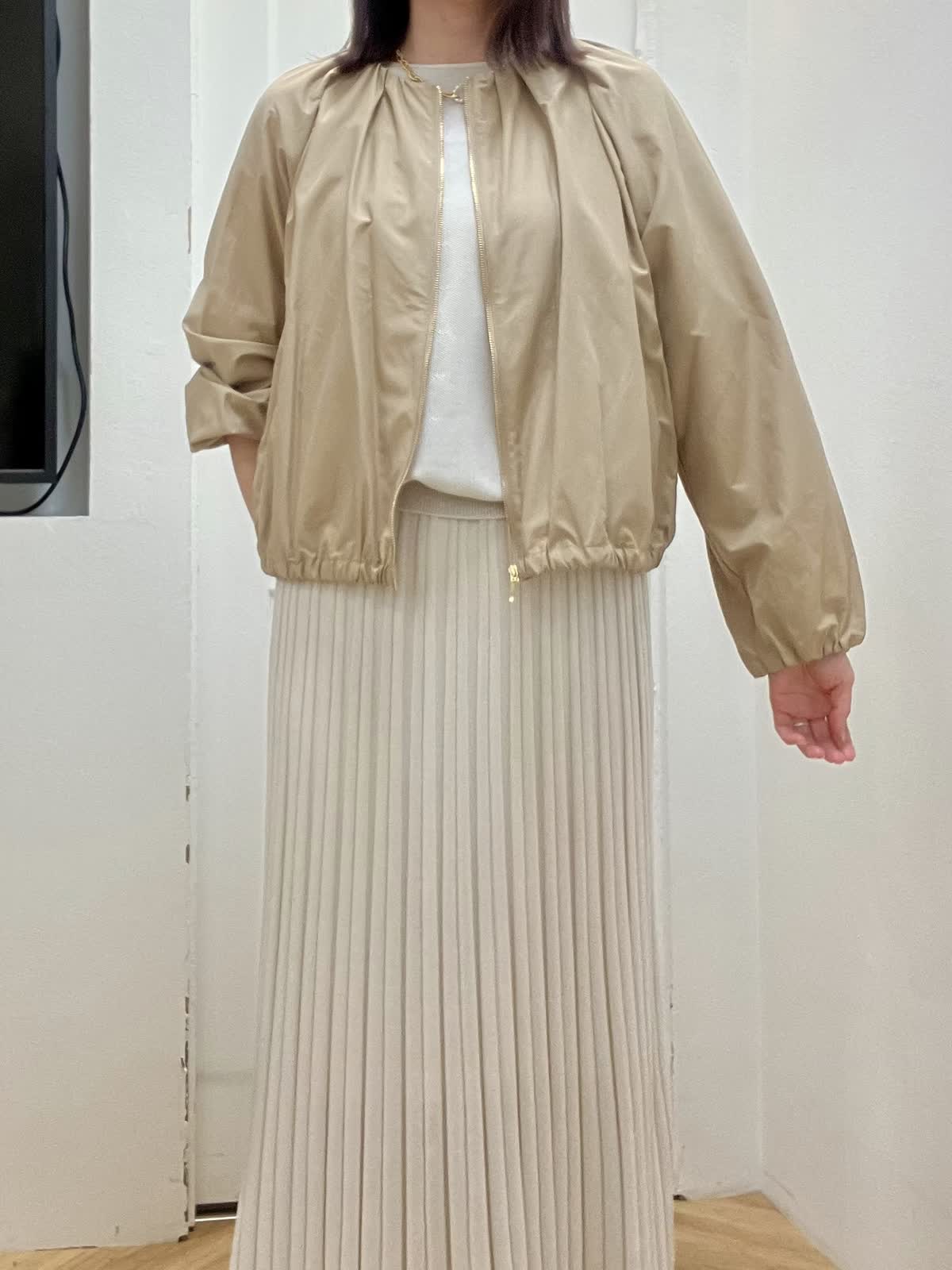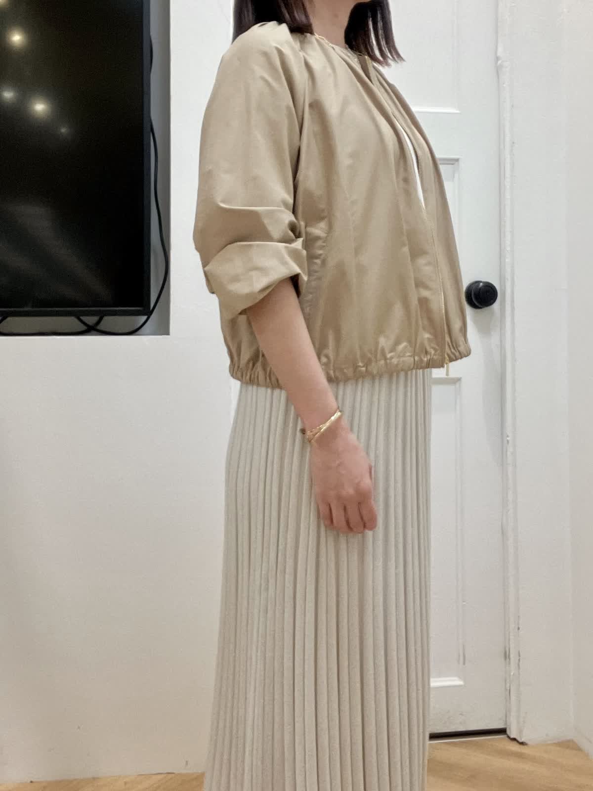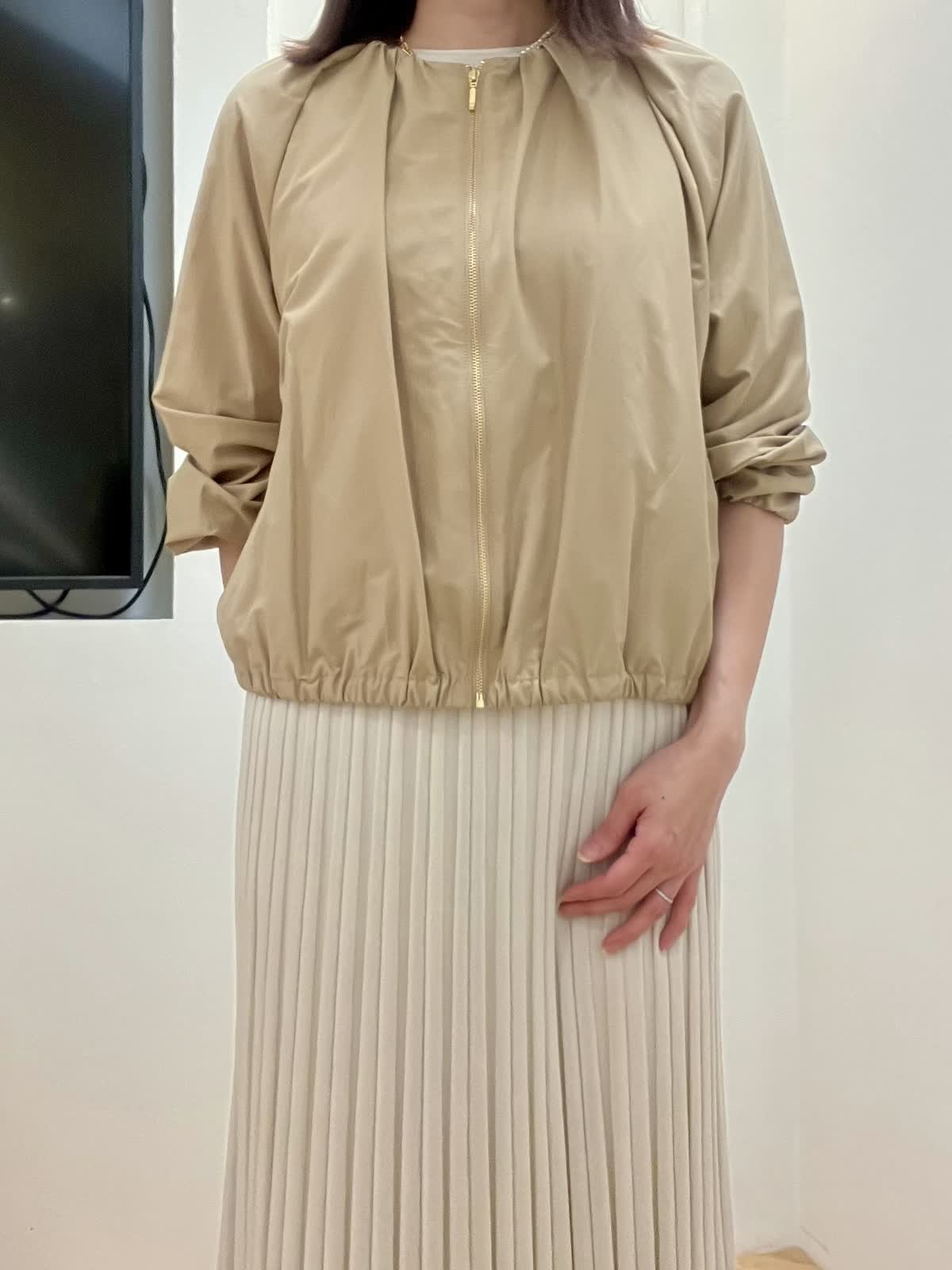 【着用サイズ】全て9号 【着用カラー】ブルゾン:ベージュ ニット/スカート:グレーベージュ 初夏のキレイめお出かけスタイル ブルゾンはギャザーデザインが女性らしく、ショート丈なので羽織るだけで今っぽくなります。裾が柔らかいゴム仕様でとにかく軽く、ストレスフリーな着心地です。 ニットアップはキュプラ混で夏場まで着回して頂ける快適な着心地。ドルマンスリーブのニットとスカートは体型カバー出来るデザイン。縫い目がないのでストレスフリーな着心地と単品でも着回しが効