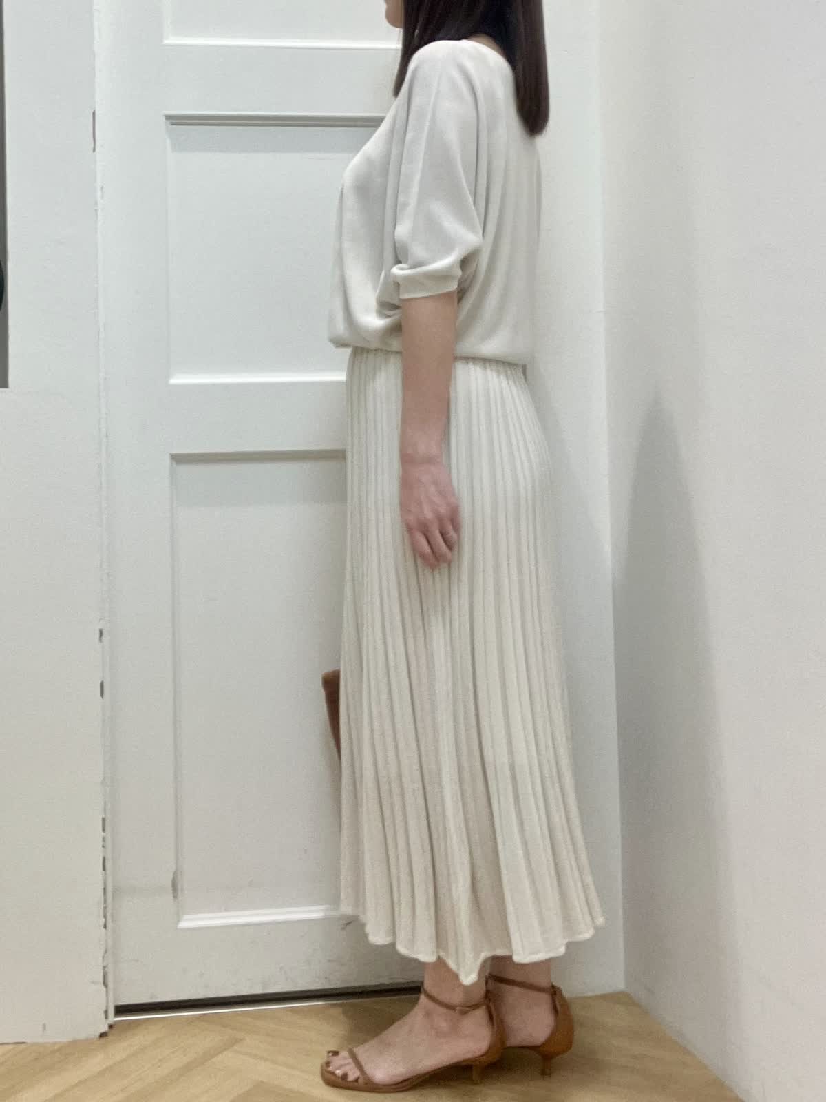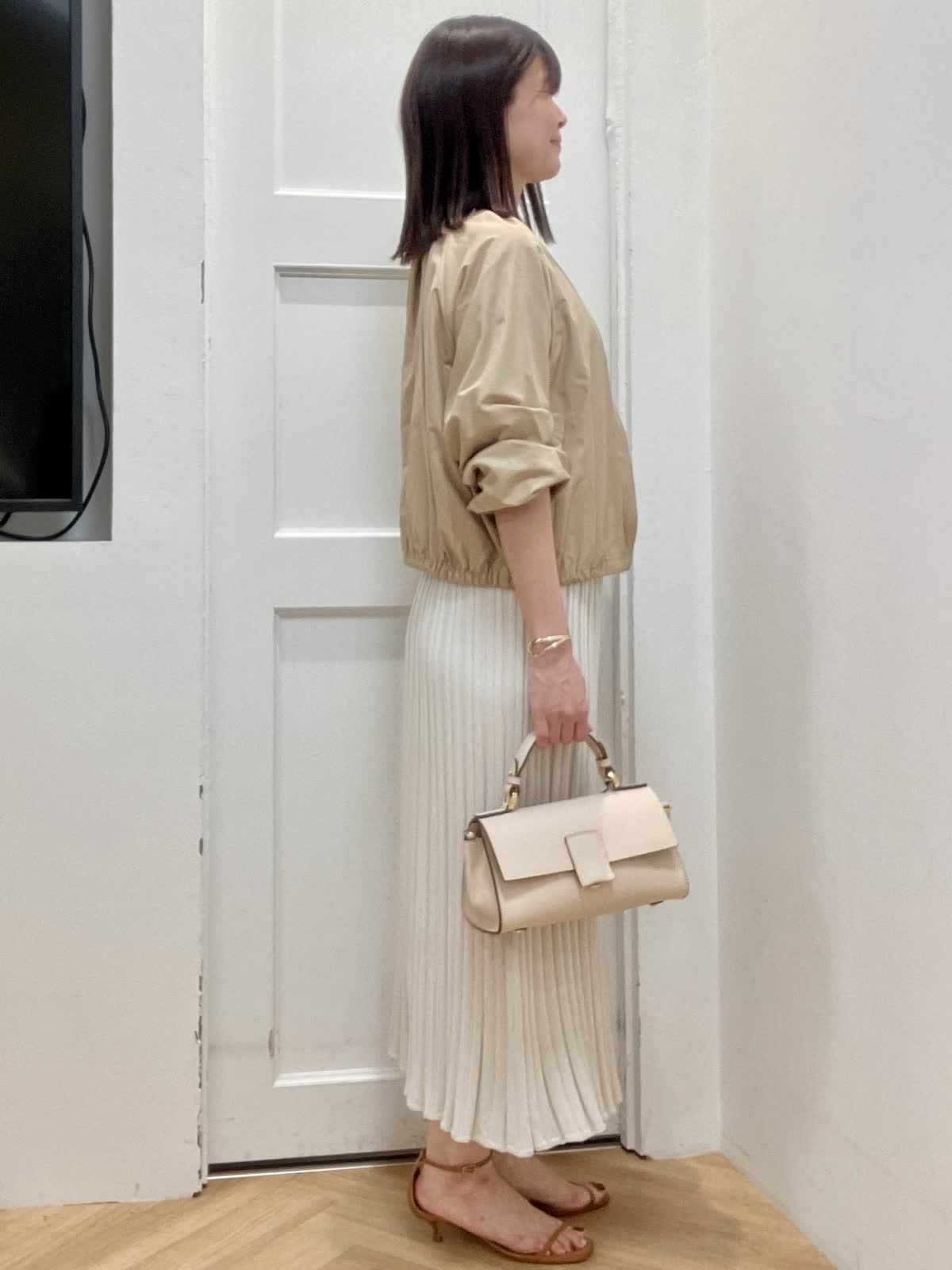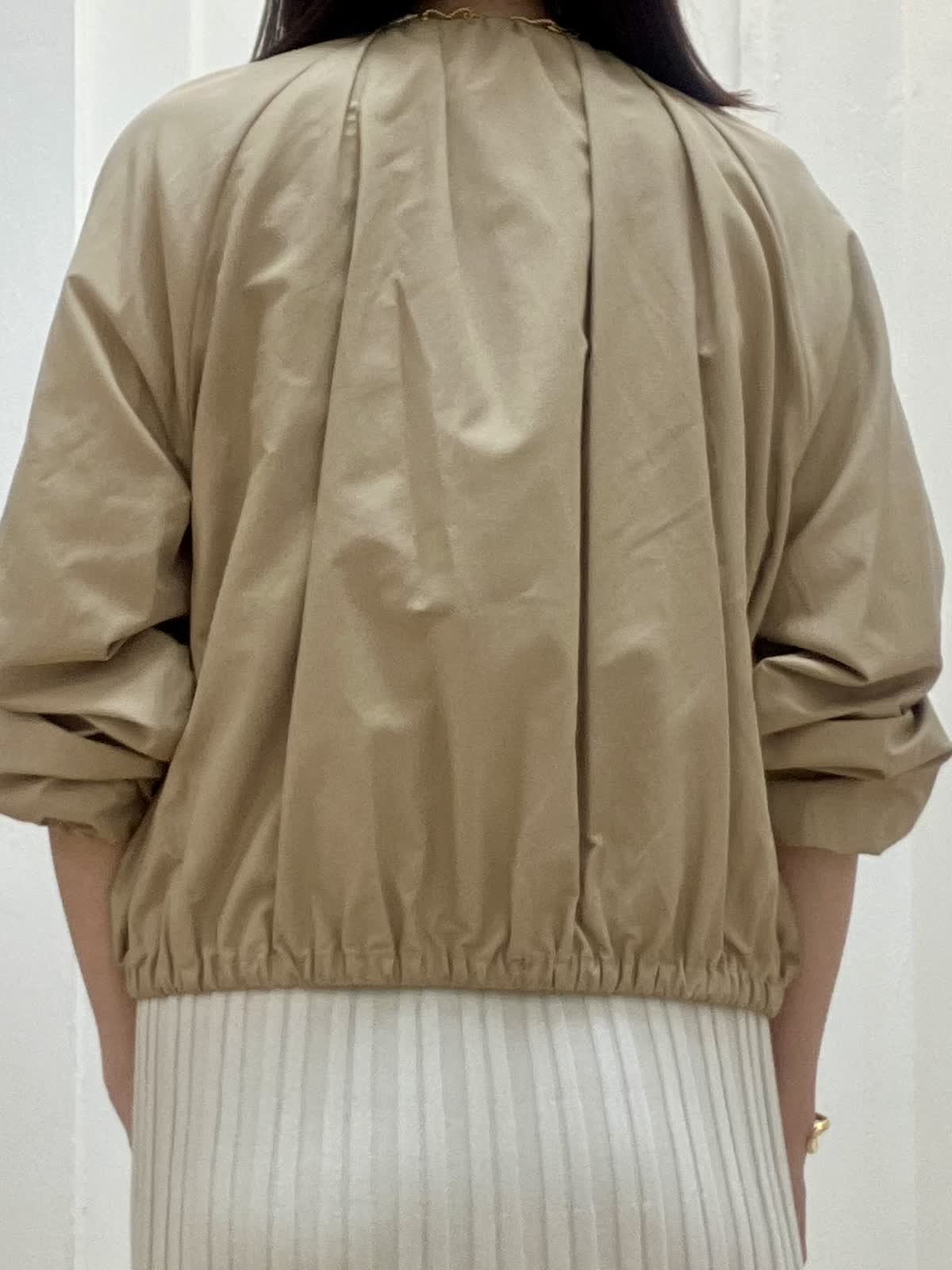 【着用サイズ】全て9号 【着用カラー】ブルゾン:ベージュ ニット/スカート:グレーベージュ 初夏のキレイめお出かけスタイル ブルゾンはギャザーデザインが女性らしく、ショート丈なので羽織るだけで今っぽくなります。裾が柔らかいゴム仕様でとにかく軽く、ストレスフリーな着心地です。 ニットアップはキュプラ混で夏場まで着回して頂ける快適な着心地。ドルマンスリーブのニットとスカートは体型カバー出来るデザイン。縫い目がないのでストレスフリーな着心地と単品でも着回しが効
