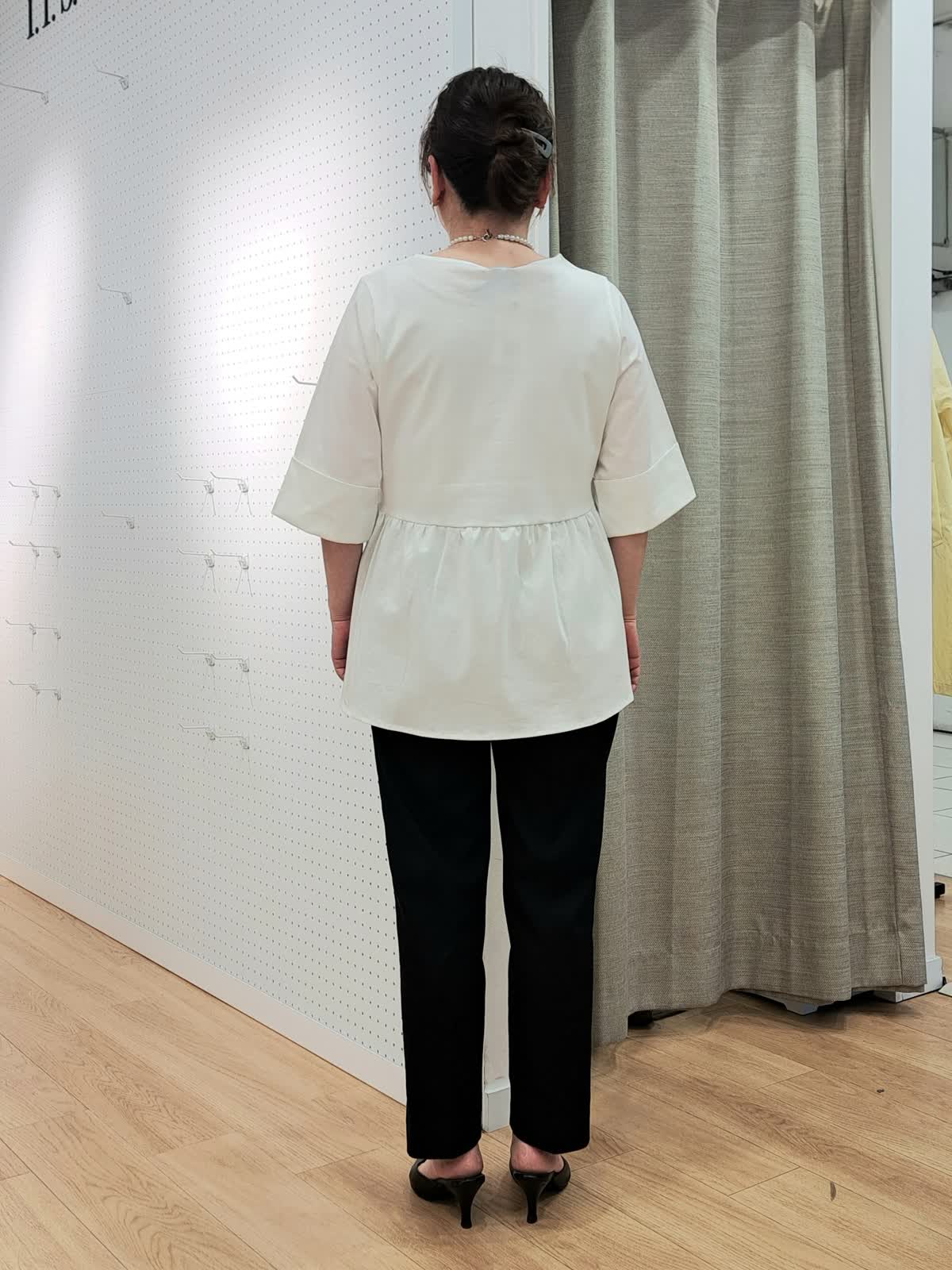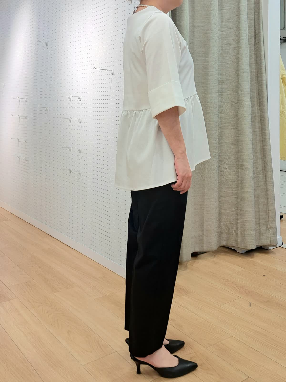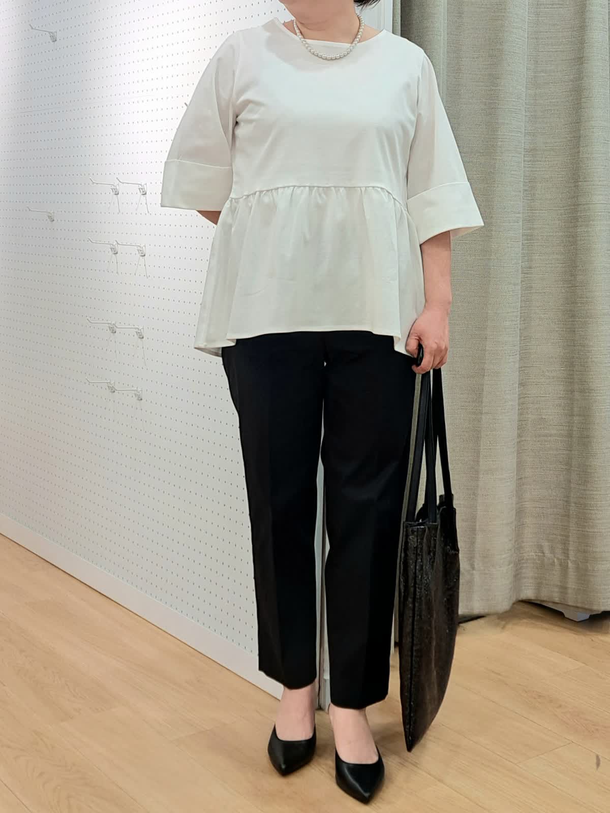 【着用カラー/着用サイズ】ブルゾン:ブラック:フリー/カットソー:ホワイト:フリー/パンツ:ブラック:9号 学校行事に行くときのスタイリング カットソーは袖丈、着丈と長さがあるのでジャケットを脱いだときにも安心です。リネン調のブルゾンはカジュアル過ぎず着られるのでかしこまりすぎない程よい羽織として使えます。
