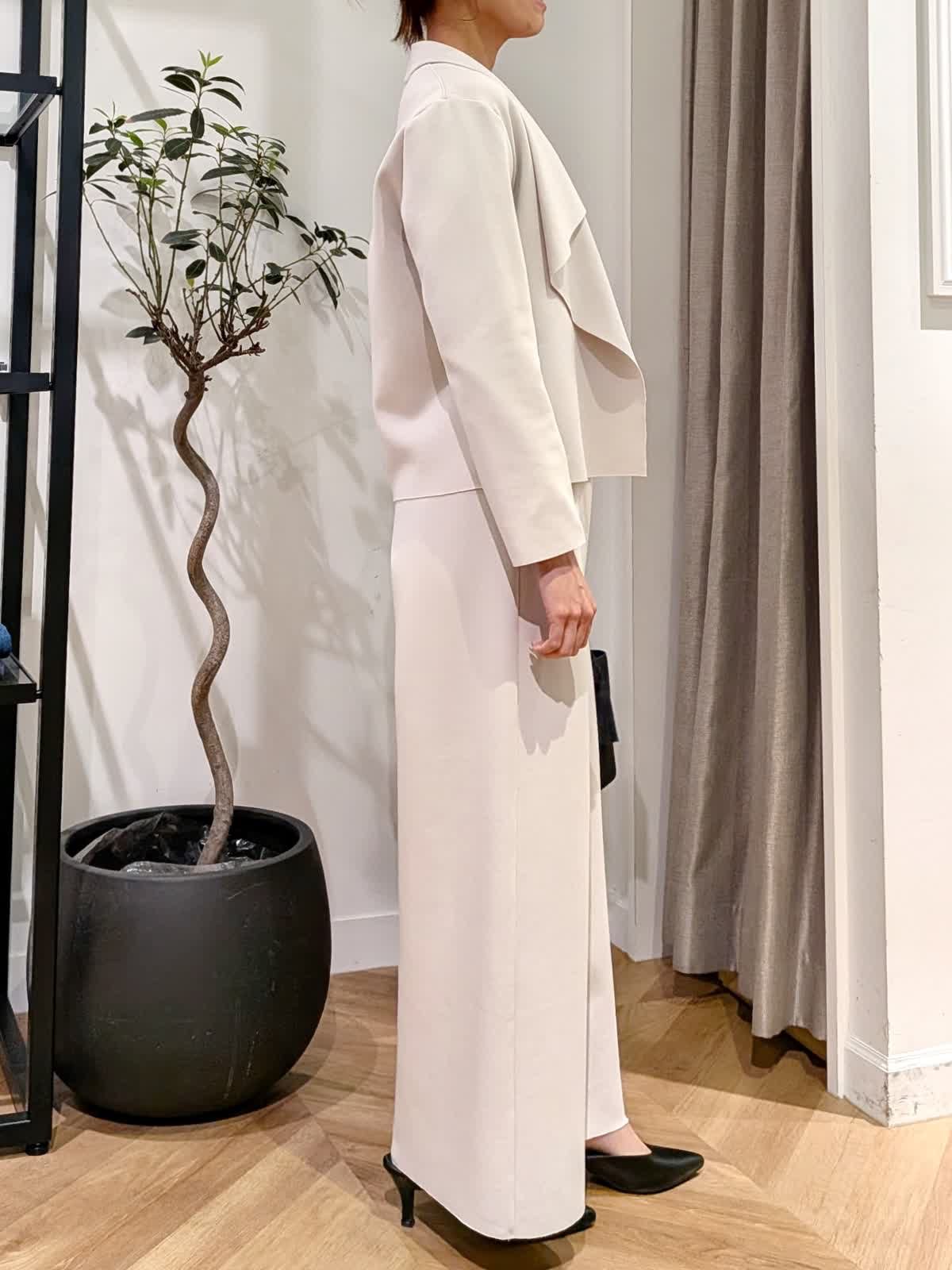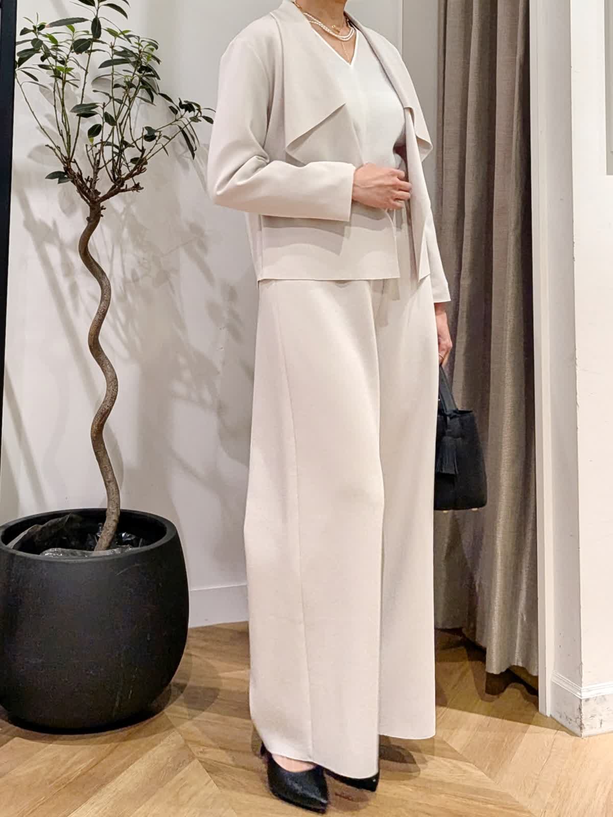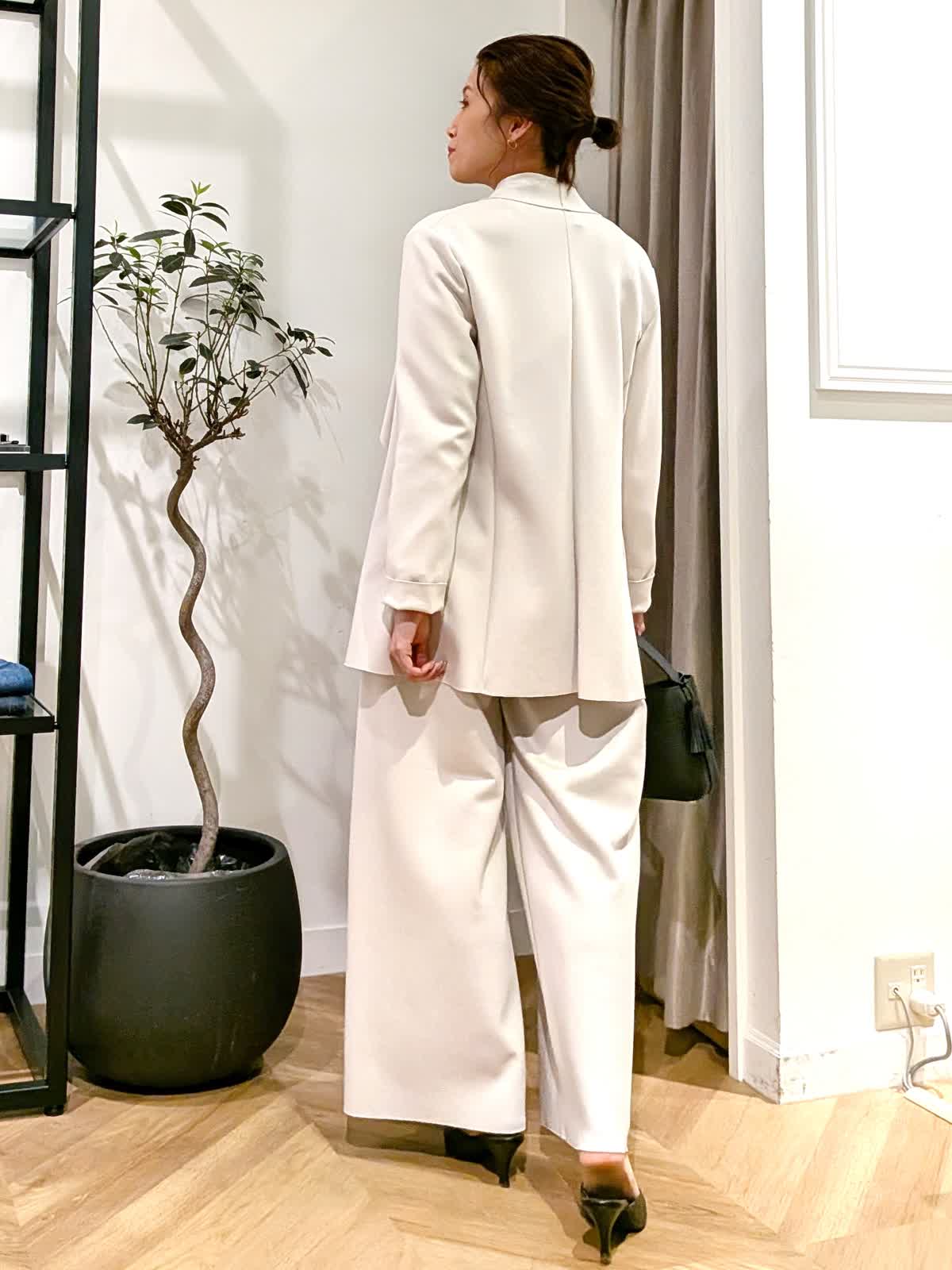 【着用サイズ】ジャケットショート、ロング:ベージュ:11号 パンツ:ベージュ:9号 ブラウス:オフホワイト:9号 ダンボール素材で伸縮性抜群。生地も薄手過ぎず肉感も拾いにくい素材感。 楽に着れますがフォーマルな場でもお使いいただけます。 ブラウスは表面感の動きも美しくくびれラインの美しい一着。