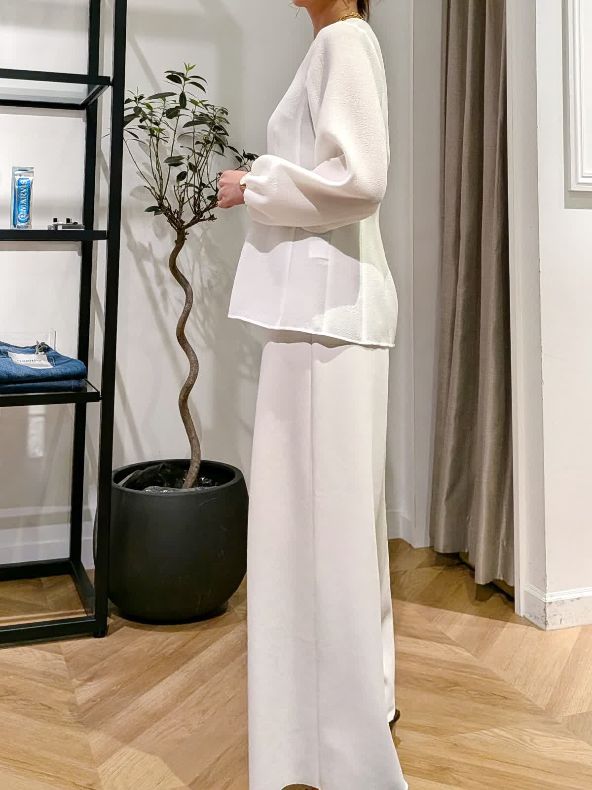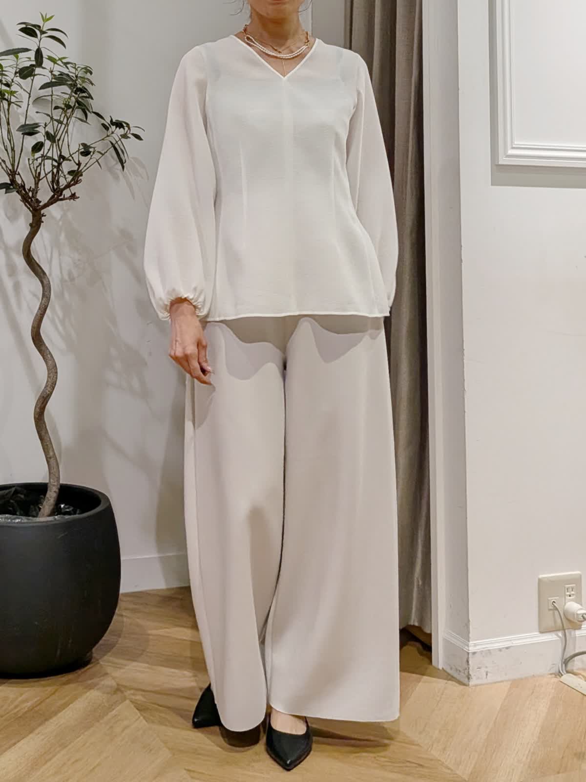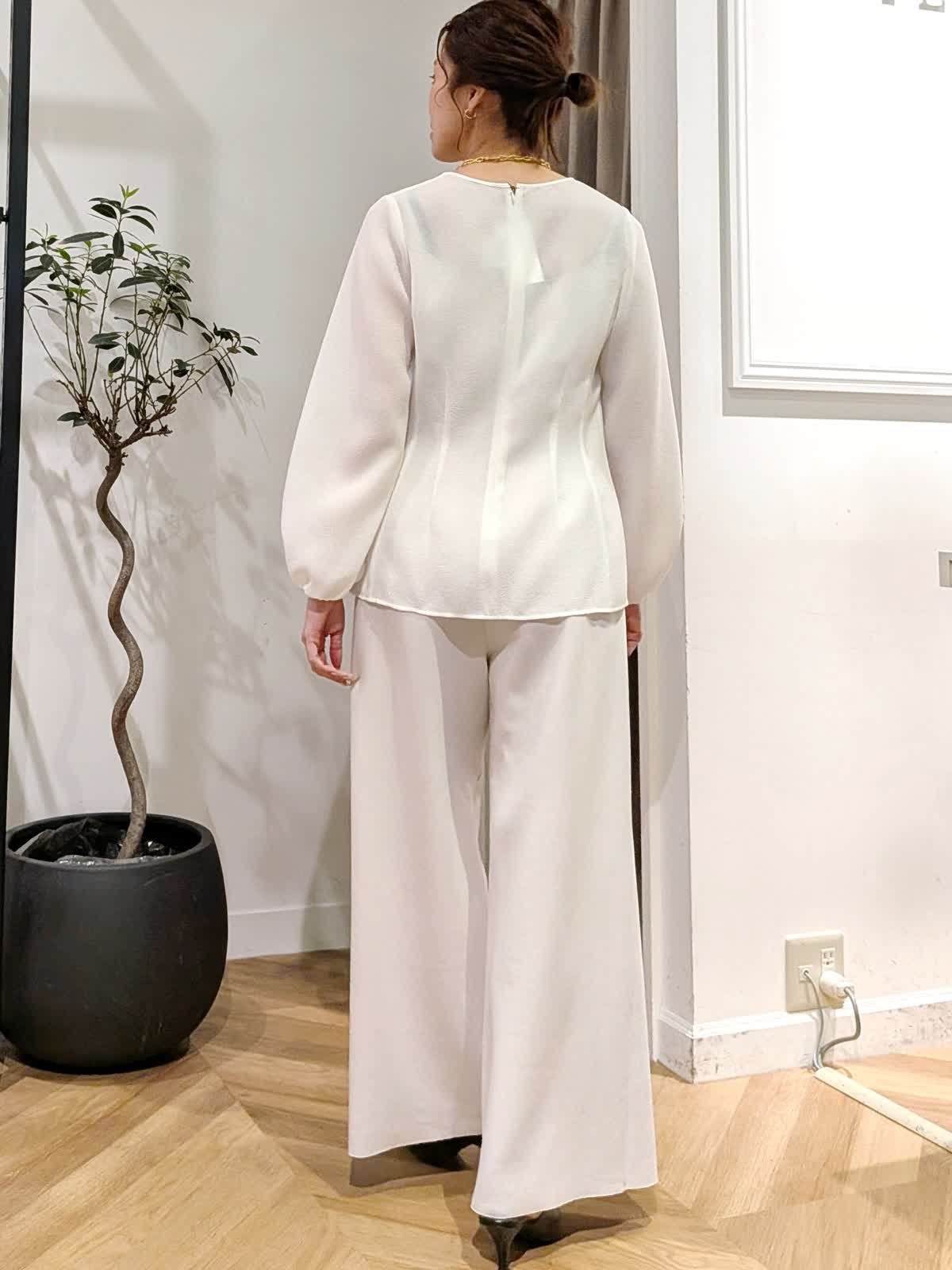 【着用サイズ】ジャケットショート、ロング:ベージュ:11号 パンツ:ベージュ:9号 ブラウス:オフホワイト:9号 ダンボール素材で伸縮性抜群。生地も薄手過ぎず肉感も拾いにくい素材感。 楽に着れますがフォーマルな場でもお使いいただけます。 ブラウスは表面感の動きも美しくくびれラインの美しい一着。