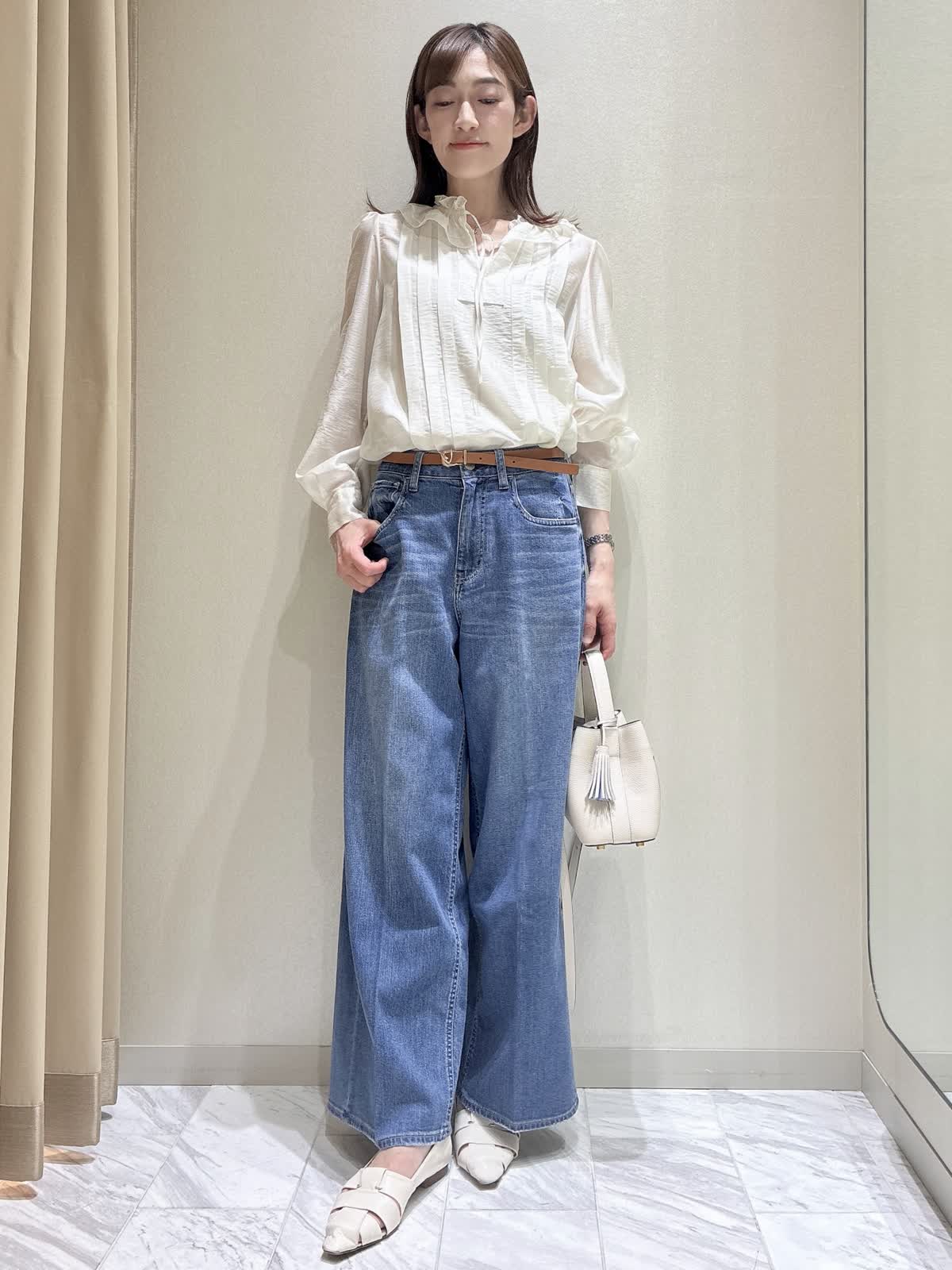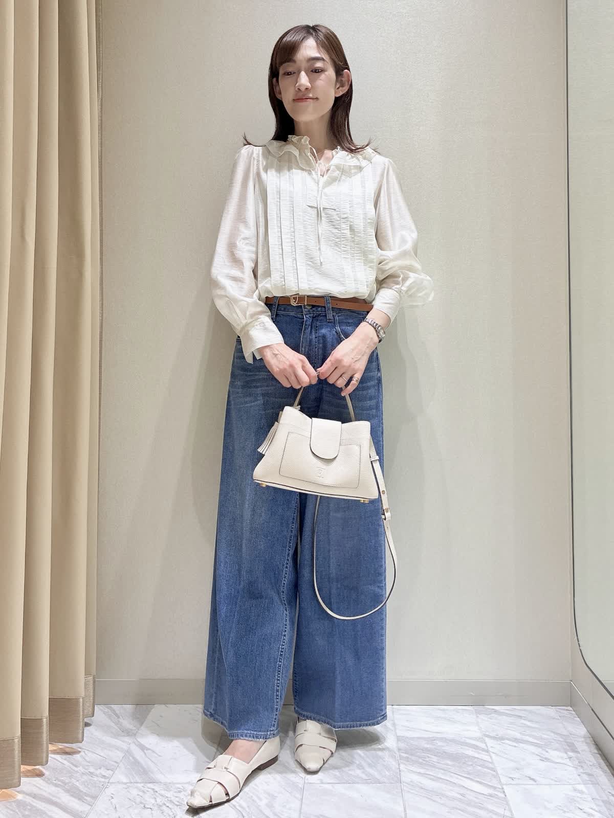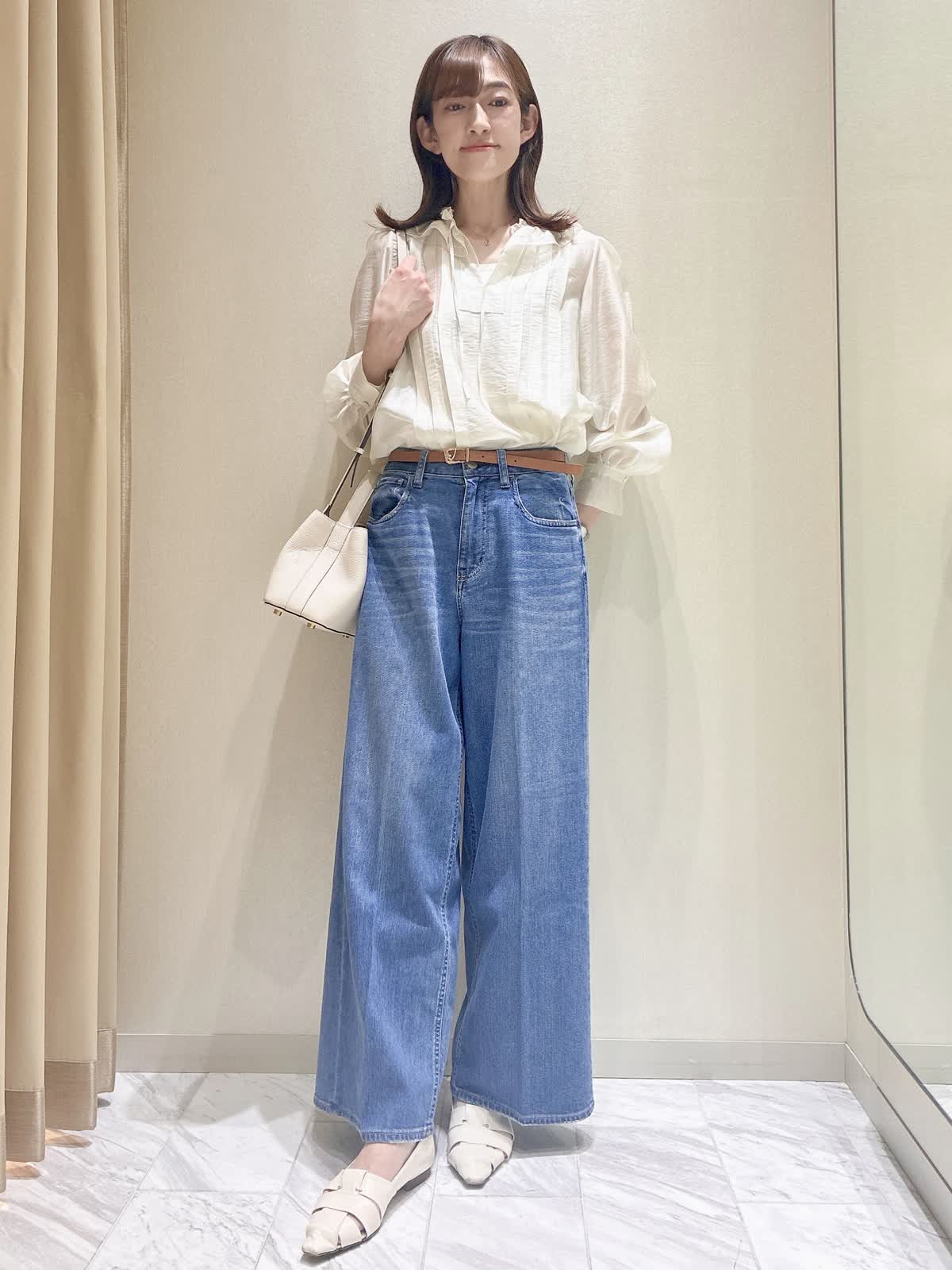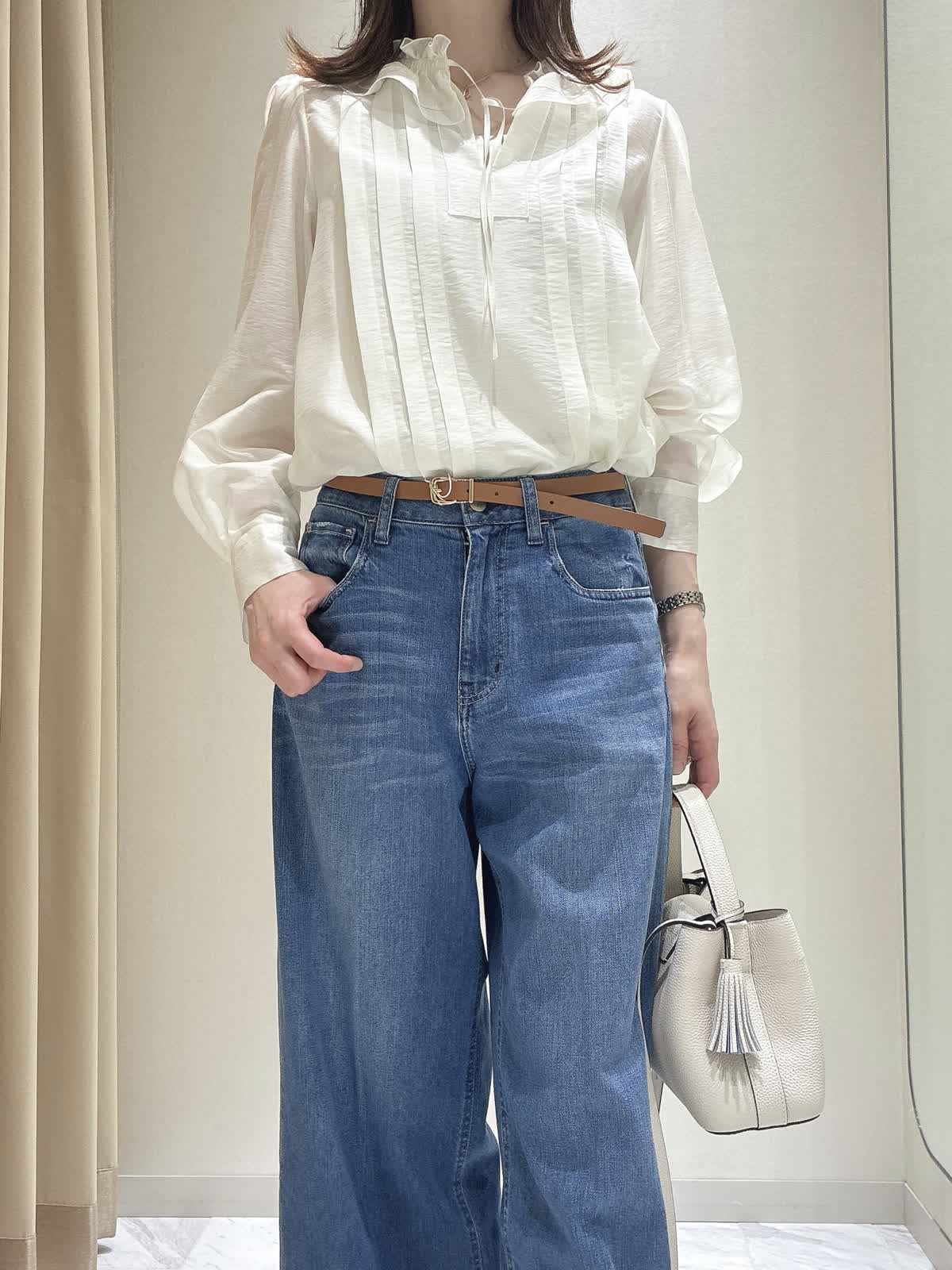 【着用サイズ】全て:9号 【着用カラー】ブラウス:オフホワイト キャミソール:ホワイト デニムパンツ:インディゴ ベルト:キャメル バッグ:オフホワイト 休日のお出かけにもおすすめ、きれいめデニムスタイリングのご紹介です。 トップスは、la veilleの新作シアブラウスを合わせました。首元のフリルがアクセントに。程良いあきです。シア感のきれいなデザインで、表面の光沢感がきれいです。 日差しが強くなるこれからの季節に、一枚着として着ていただきやすいと思います。 さわやかなインディゴデニムとホワイトカラーのバッグを合わせた、きれいめカジュアルスタイルです。