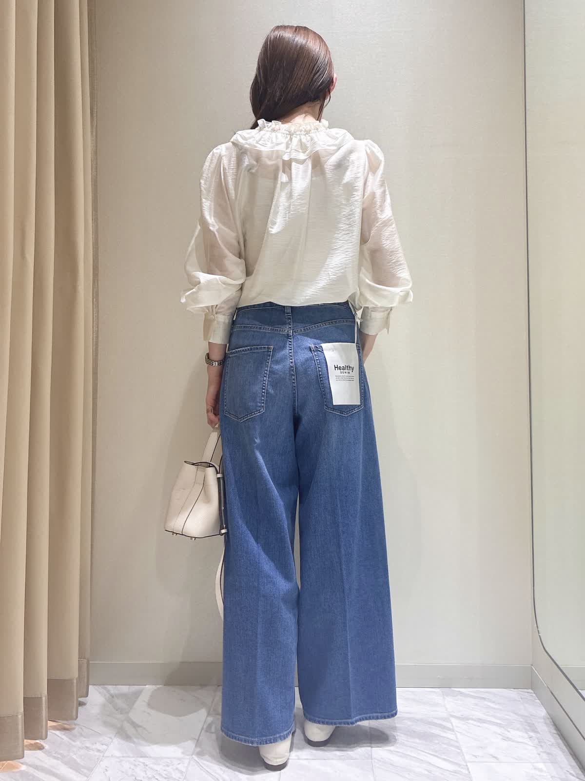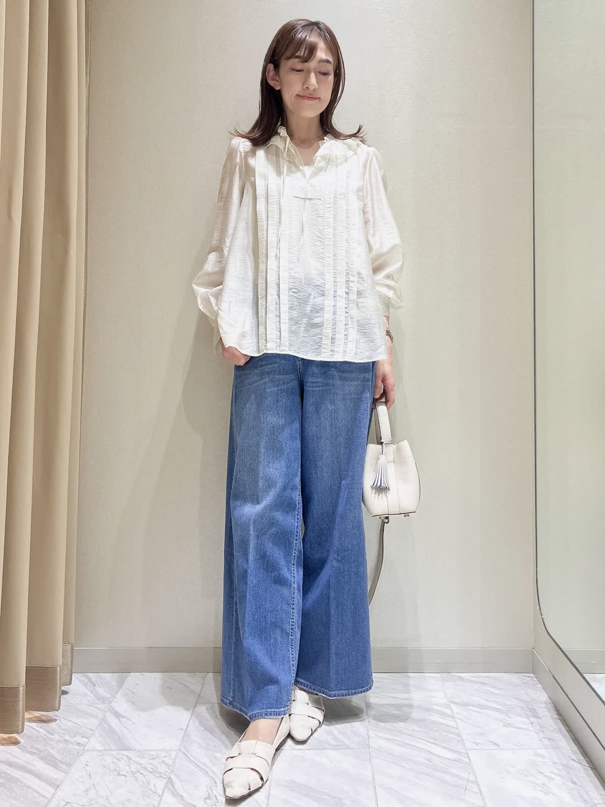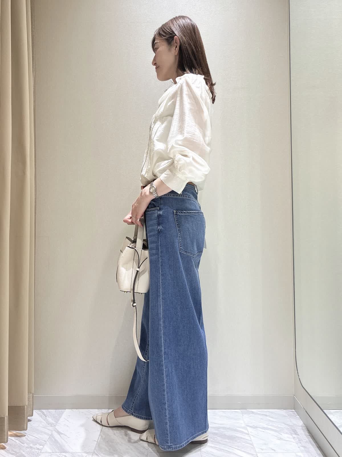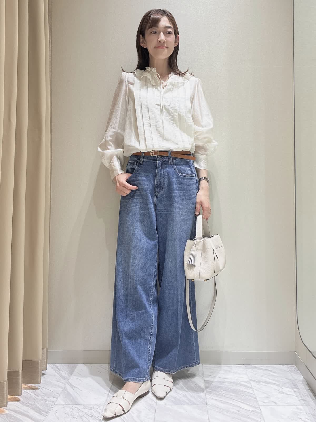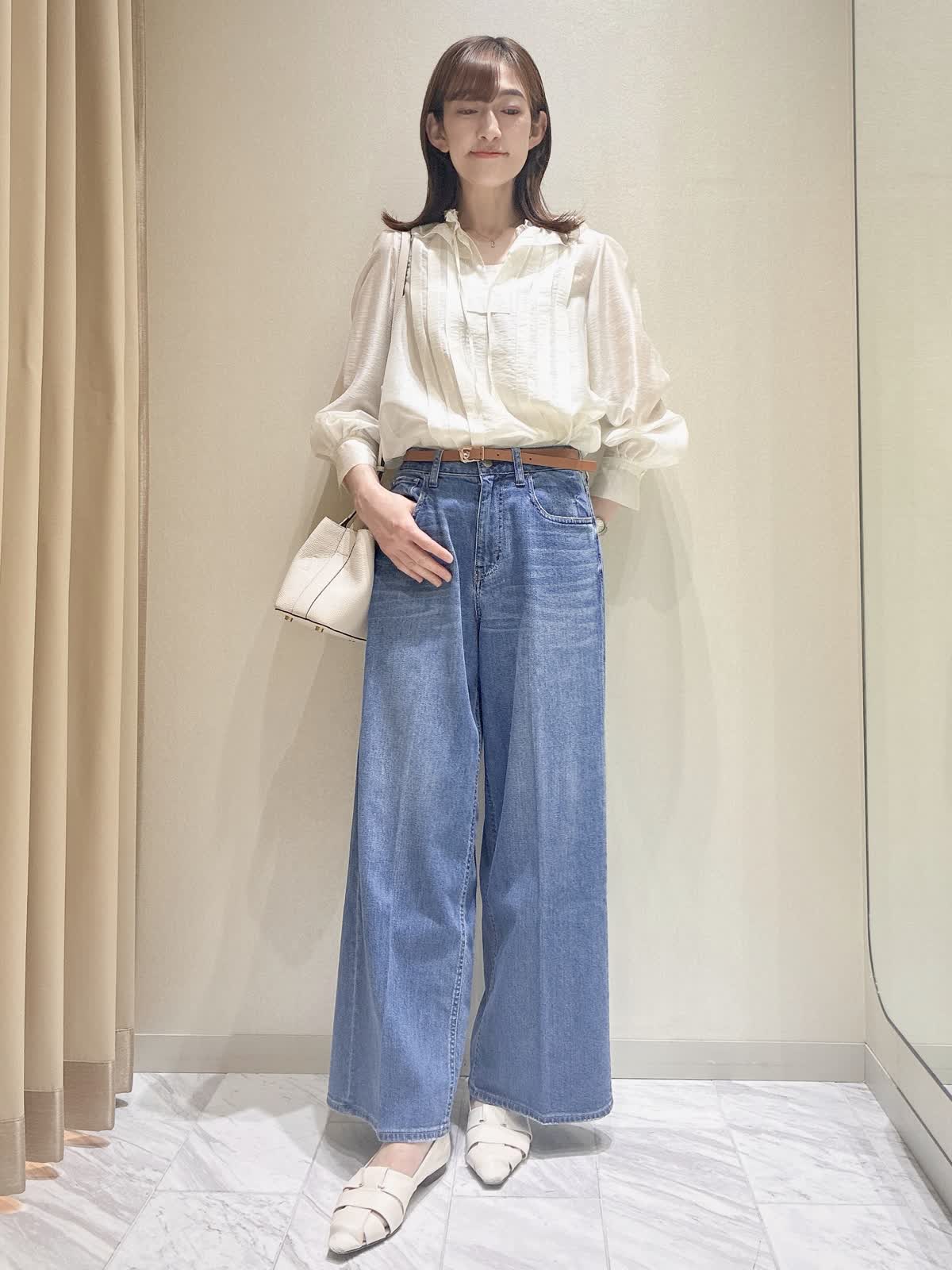 【着用サイズ】全て:9号 【着用カラー】ブラウス:オフホワイト キャミソール:ホワイト デニムパンツ:インディゴ ベルト:キャメル バッグ:オフホワイト 休日のお出かけにもおすすめ、きれいめデニムスタイリングのご紹介です。 トップスは、la veilleの新作シアブラウスを合わせました。首元のフリルがアクセントに。程良いあきです。シア感のきれいなデザインで、表面の光沢感がきれいです。 日差しが強くなるこれからの季節に、一枚着として着ていただきやすいと思います。 さわやかなインディゴデニムとホワイトカラーのバッグを合わせた、きれいめカジュアルスタイルです。