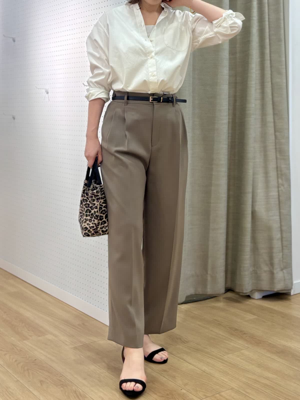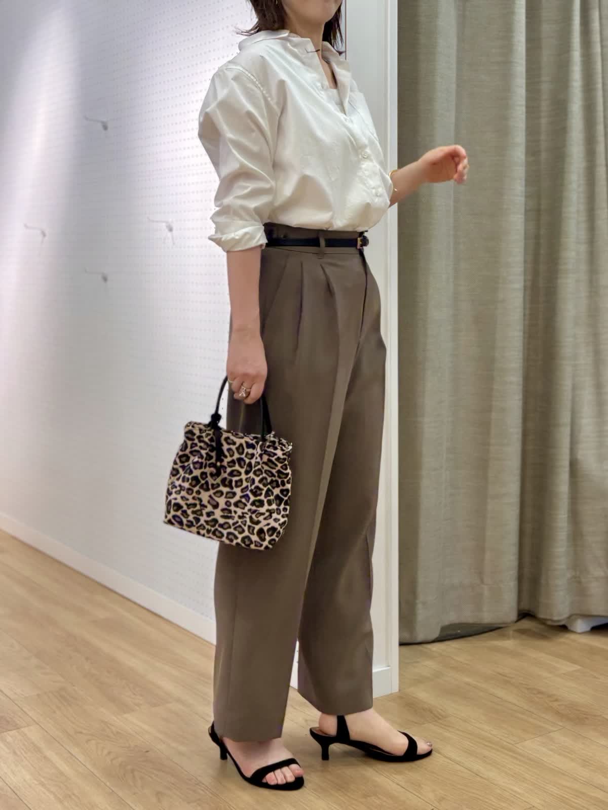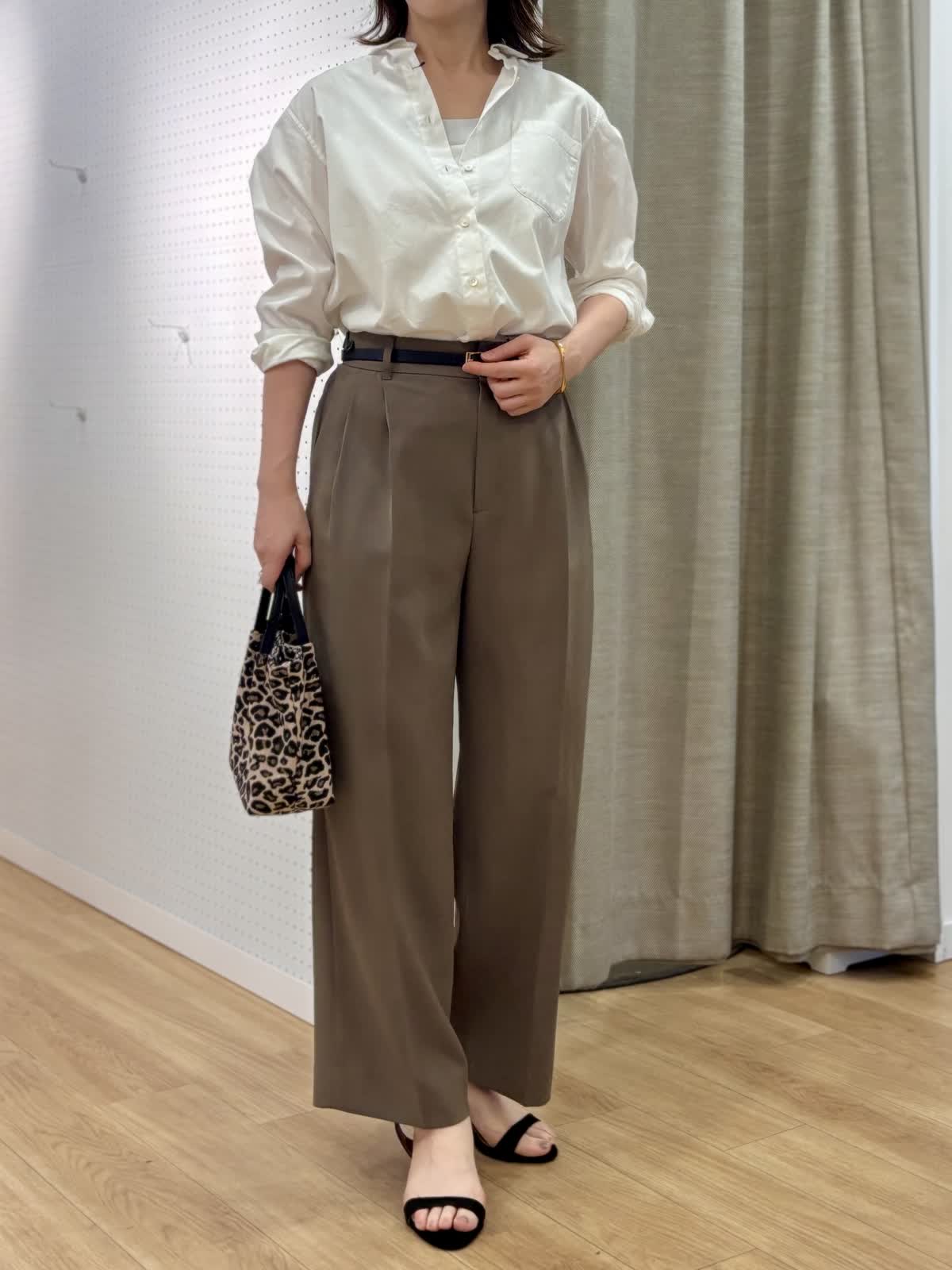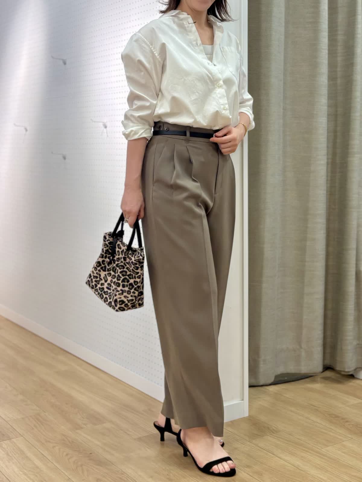 【着用カラー/サイズ】 ブラウス:オフホワイト/9号 パンツ:モカチャ/9号 タンクトップ:グレー/9号 オフィスカジュアルコーデ。シンプルだけど飽きずに着られるベーシックシャツはハリ感があり襟もあるのでジャケット替わりの印象できちんと感がだせます。これから日差しがキツくなる時期こそコットン100%の長袖が役立ちます。シャリ感のある薄手生地のパンツは真夏に向けてサラッと穿きやすいです。軽量、防シワとデイリー使いにマストです。ウエストサイドにボタンで調整が出来るのも嬉しいポイント。