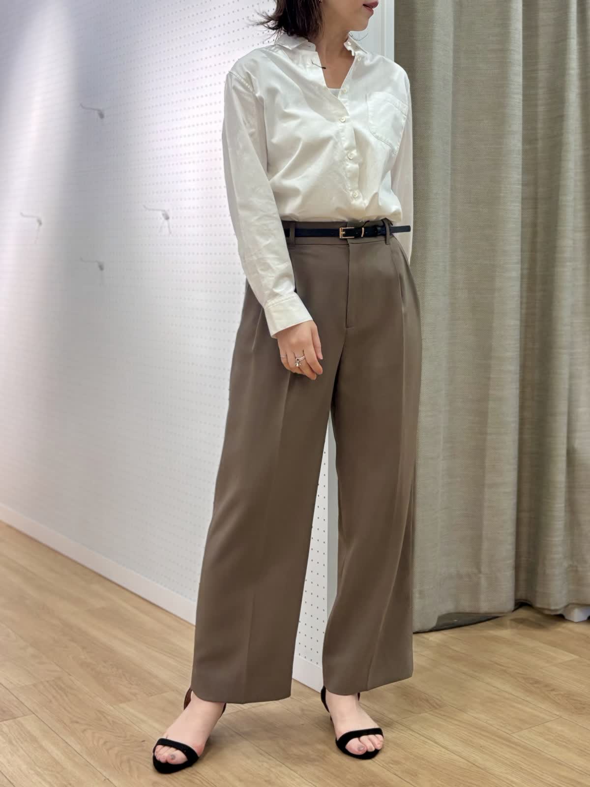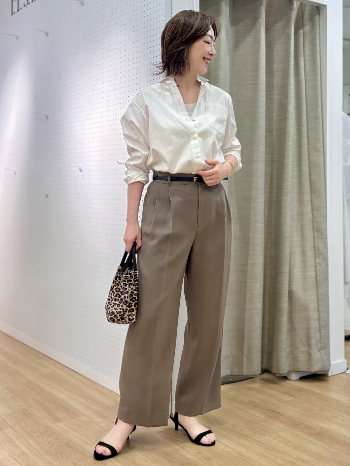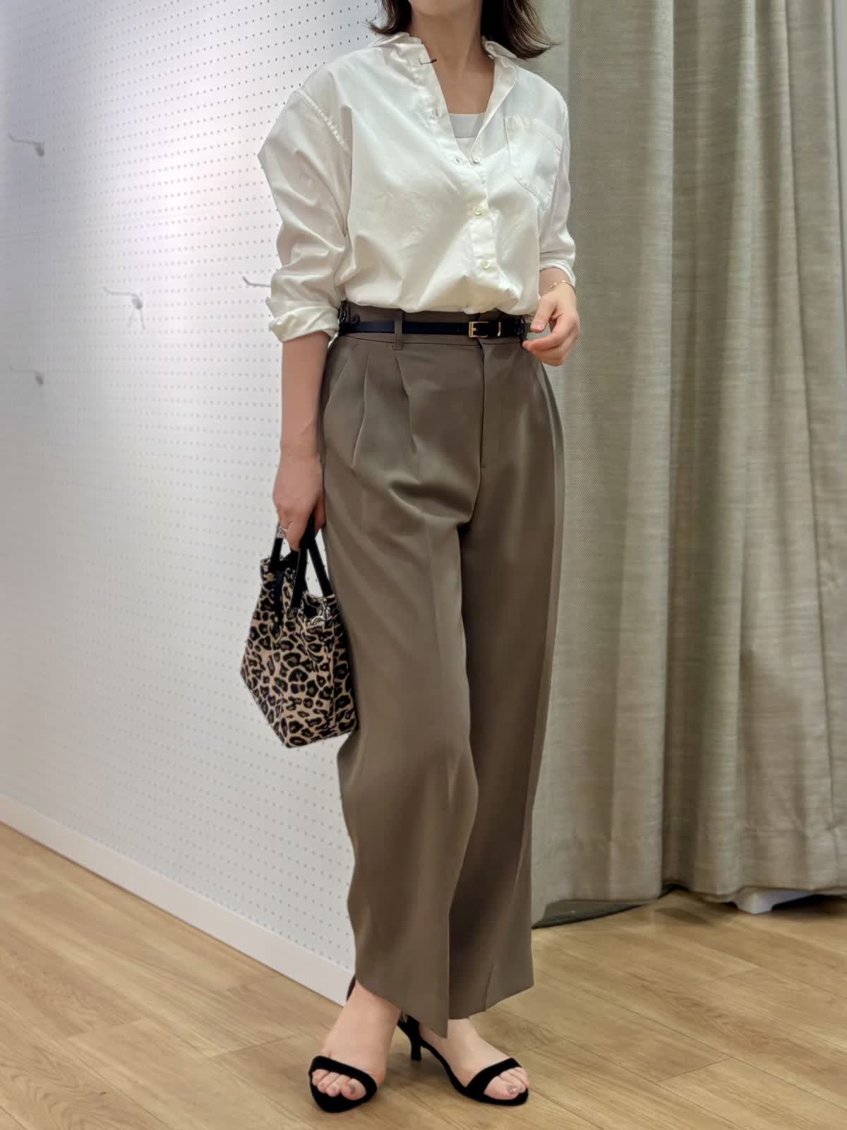 【着用カラー/サイズ】 ブラウス:オフホワイト/9号 パンツ:モカチャ/9号 タンクトップ:グレー/9号 オフィスカジュアルコーデ。シンプルだけど飽きずに着られるベーシックシャツはハリ感があり襟もあるのでジャケット替わりの印象できちんと感がだせます。これから日差しがキツくなる時期こそコットン100%の長袖が役立ちます。シャリ感のある薄手生地のパンツは真夏に向けてサラッと穿きやすいです。軽量、防シワとデイリー使いにマストです。ウエストサイドにボタンで調整が出来るのも嬉しいポイント。