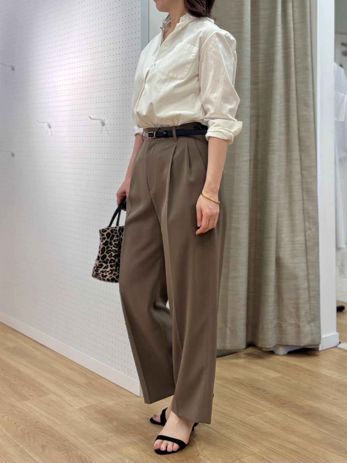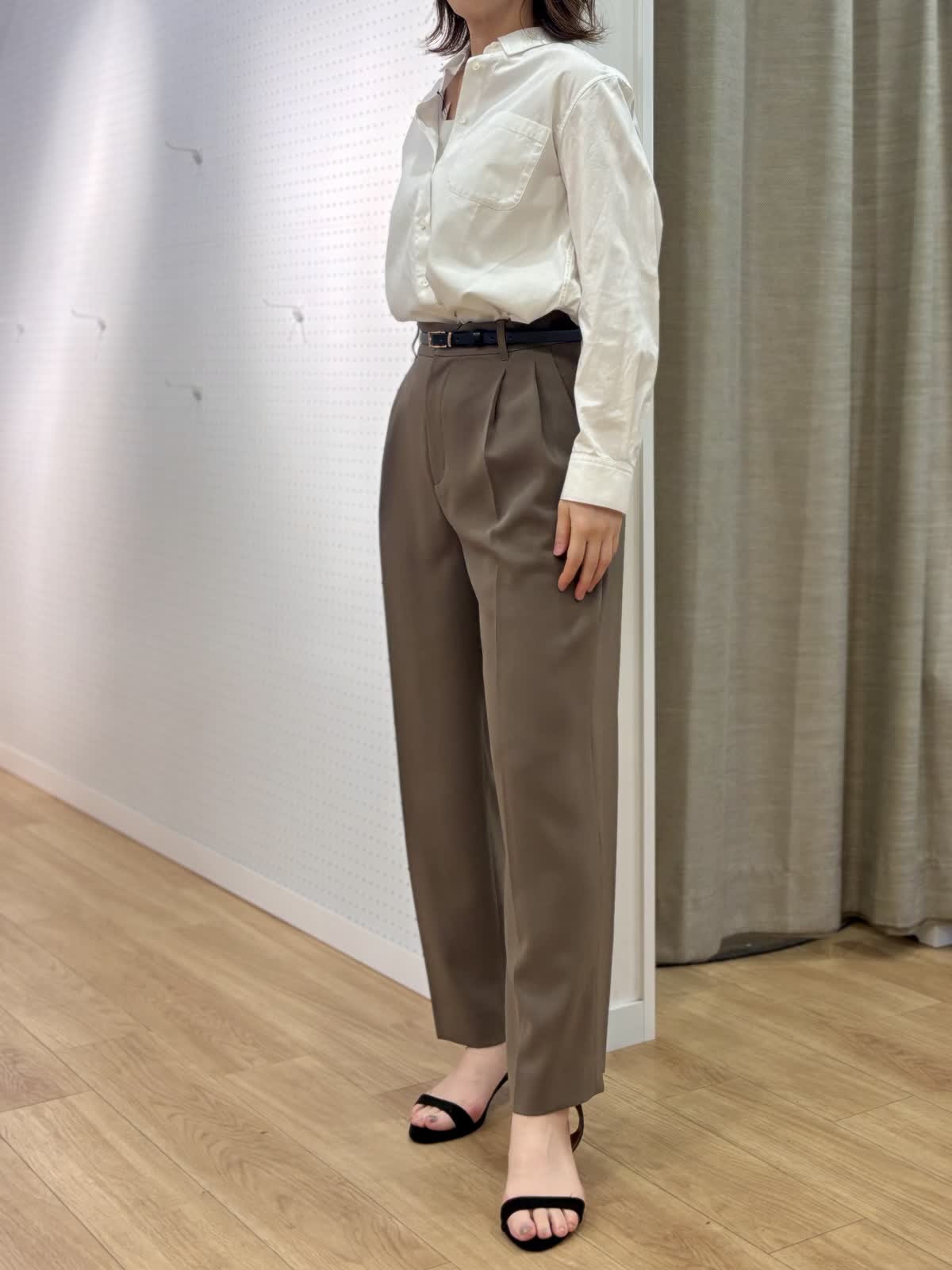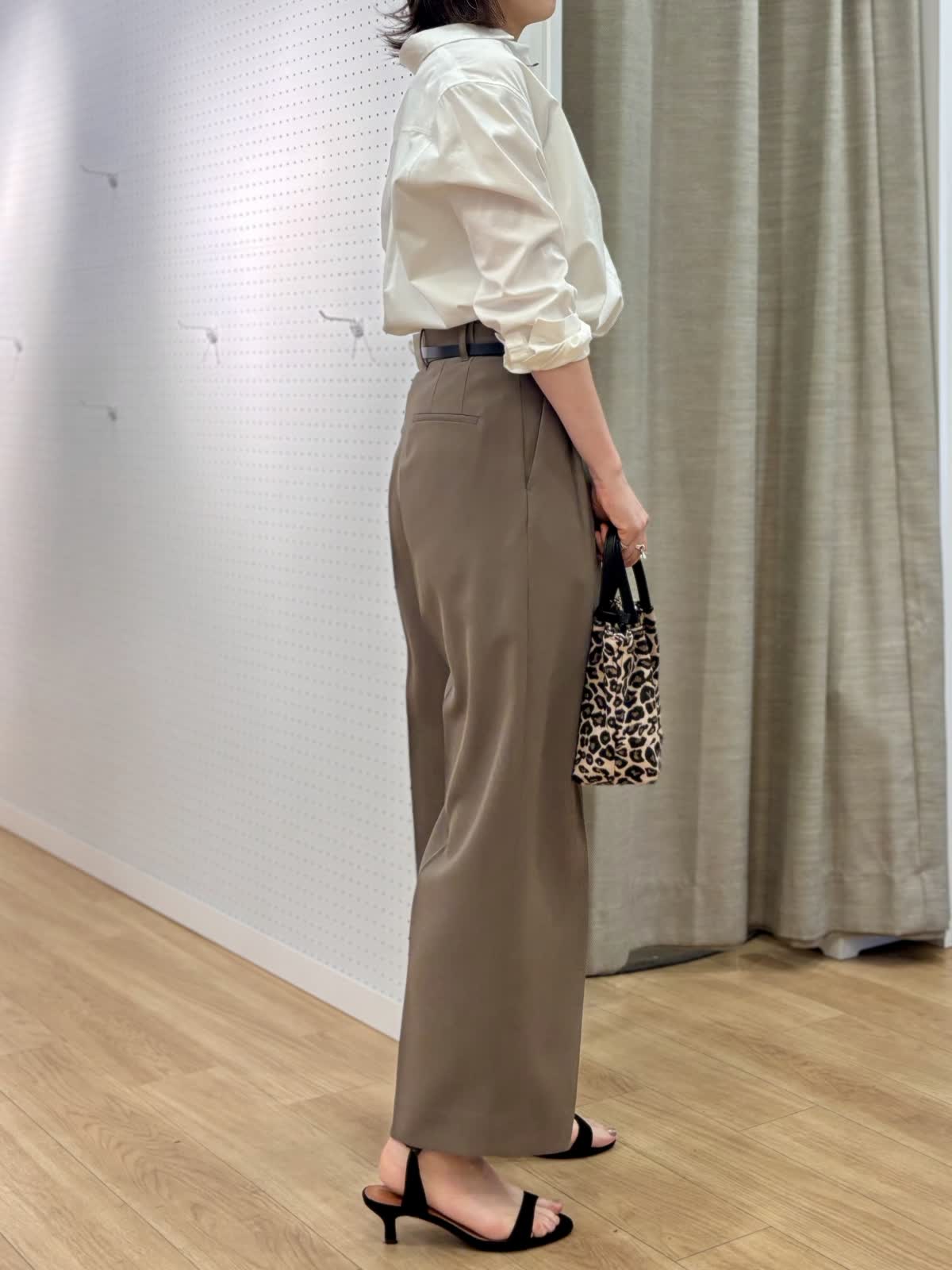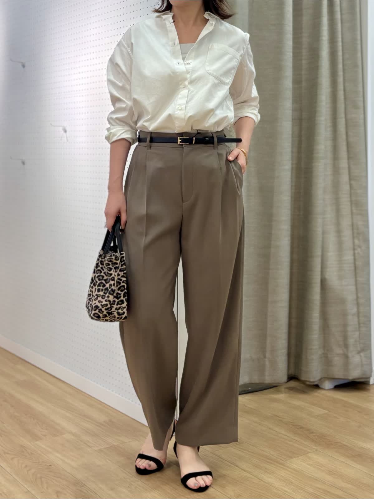【着用カラー/サイズ】 ブラウス:オフホワイト/9号 パンツ:モカチャ/9号 タンクトップ:グレー/9号 オフィスカジュアルコーデ。シンプルだけど飽きずに着られるベーシックシャツはハリ感があり襟もあるのでジャケット替わりの印象できちんと感がだせます。これから日差しがキツくなる時期こそコットン100%の長袖が役立ちます。シャリ感のある薄手生地のパンツは真夏に向けてサラッと穿きやすいです。軽量、防シワとデイリー使いにマストです。ウエストサイドにボタンで調整が出来るのも嬉しいポイント。