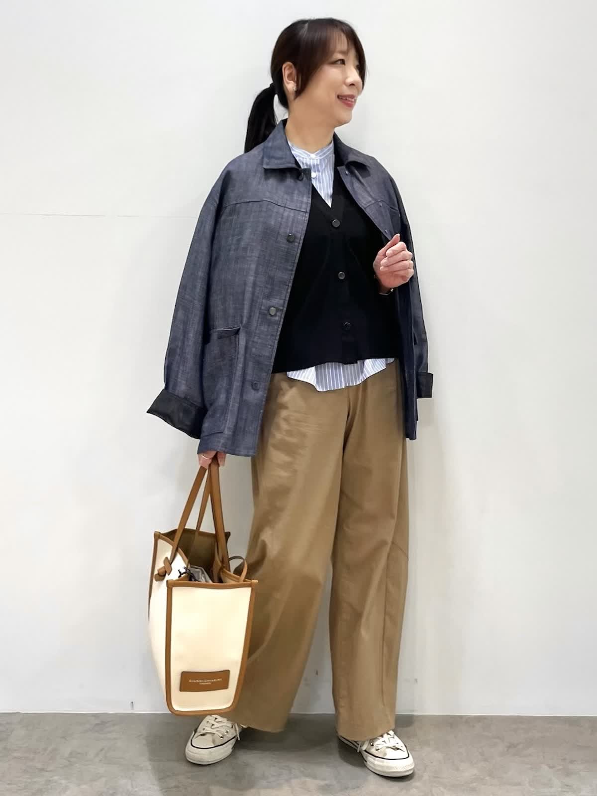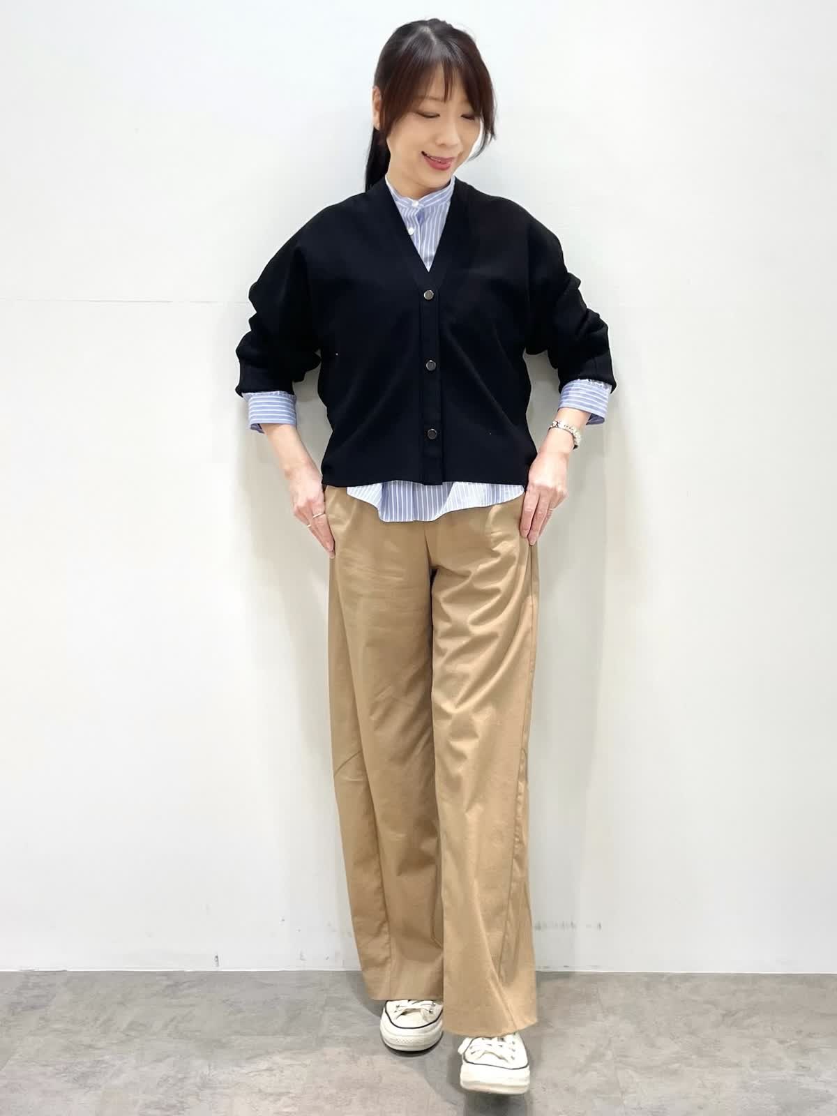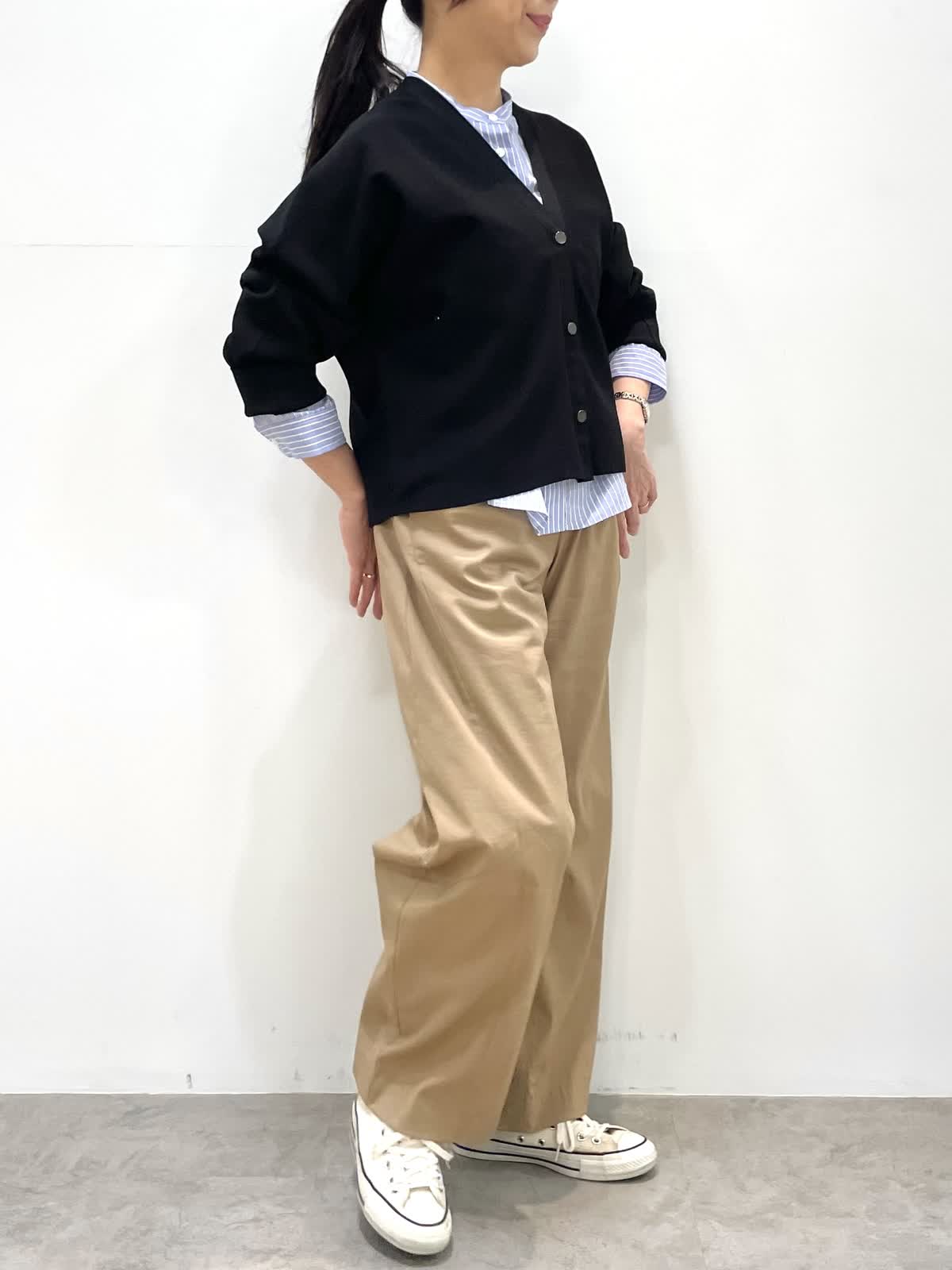 【着用サイズ】全て9号 【着用カラー】ジャケット: ネイビー カーディガン:ブラック ブラウス:サックス パンツ:キャメル 休日のお出かけスタイル。オーバーサイズのジャケットはゆるっとした抜け感のあるシルエット。大きめのアウトポケットやメタルのドットボタンがポイントです。カーディガンは袖幅があるので二の腕のラインを拾わずすっきり着用いただけます。パンツはトレンドのバレルシレット。履くだけでおしゃれ見えするお勧めアイテムです。